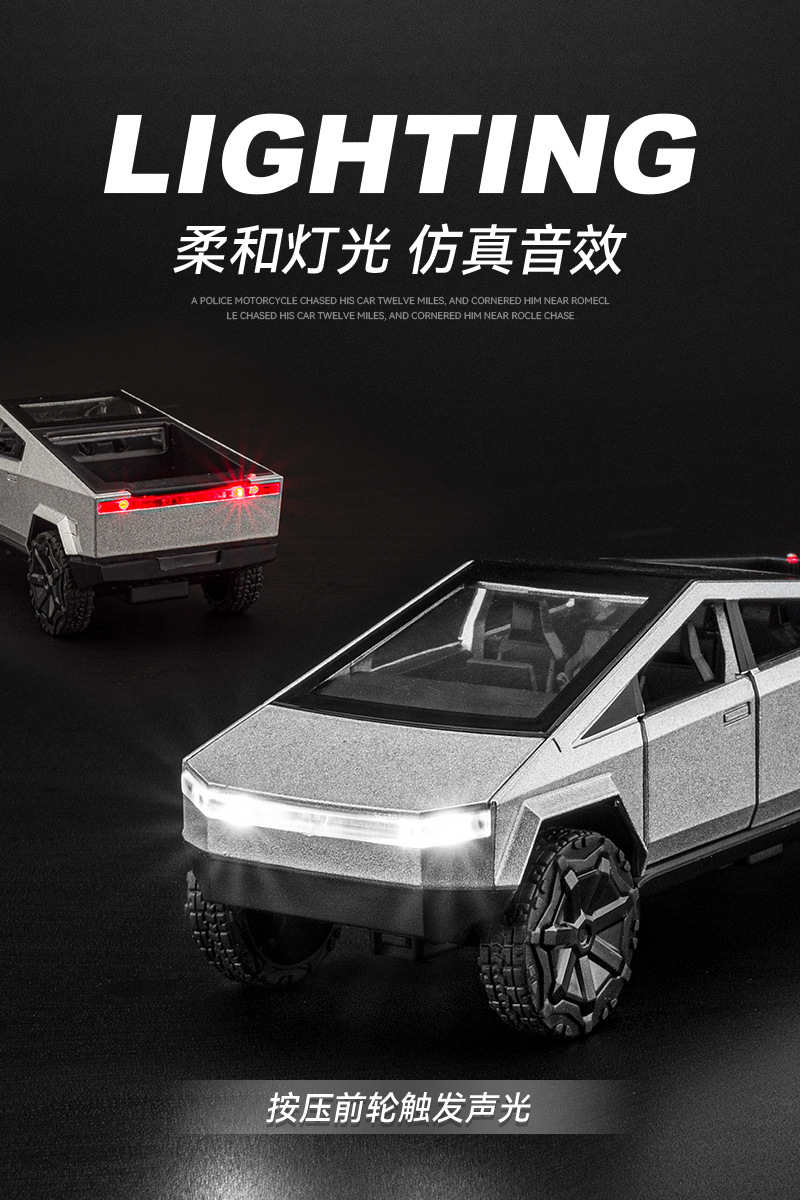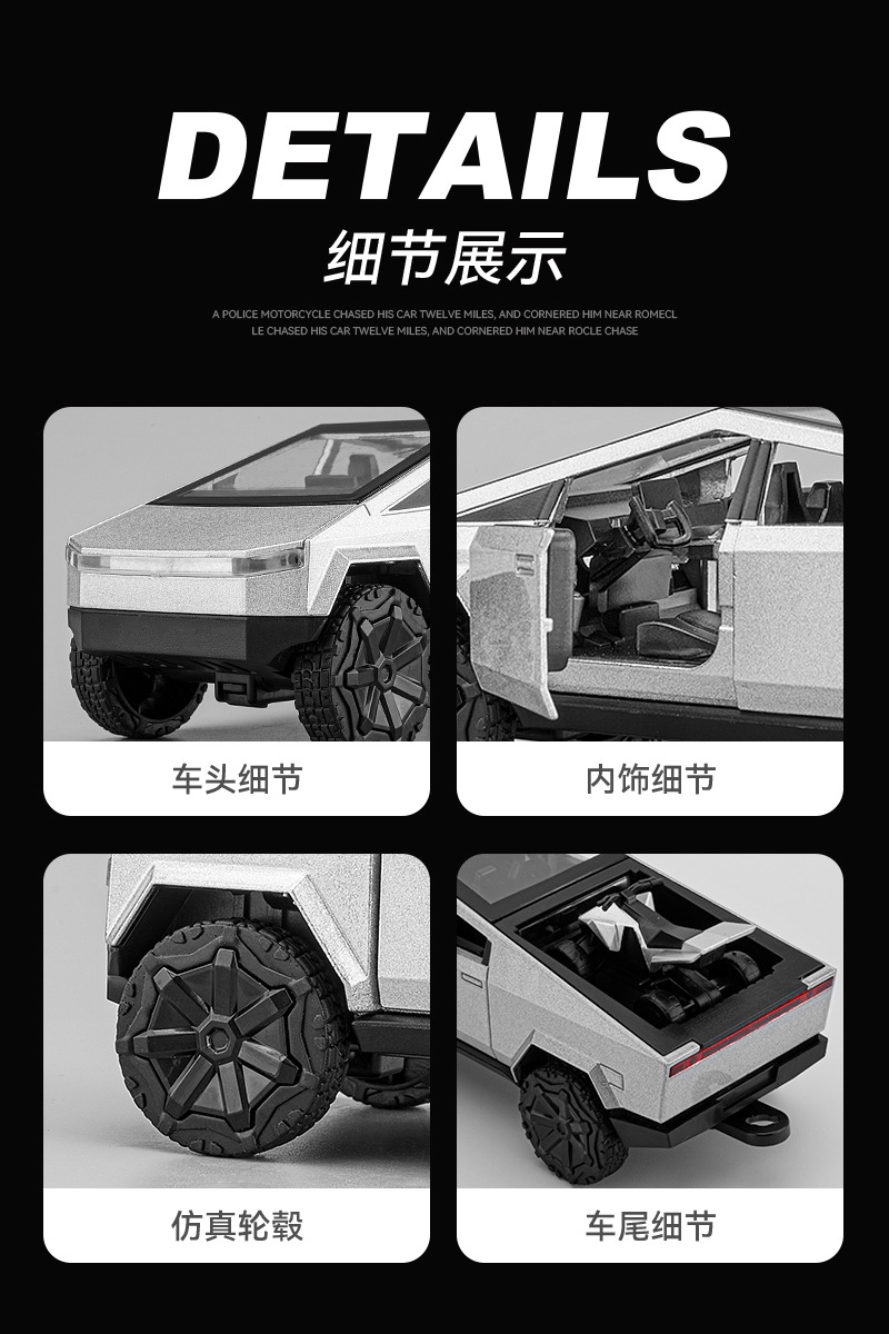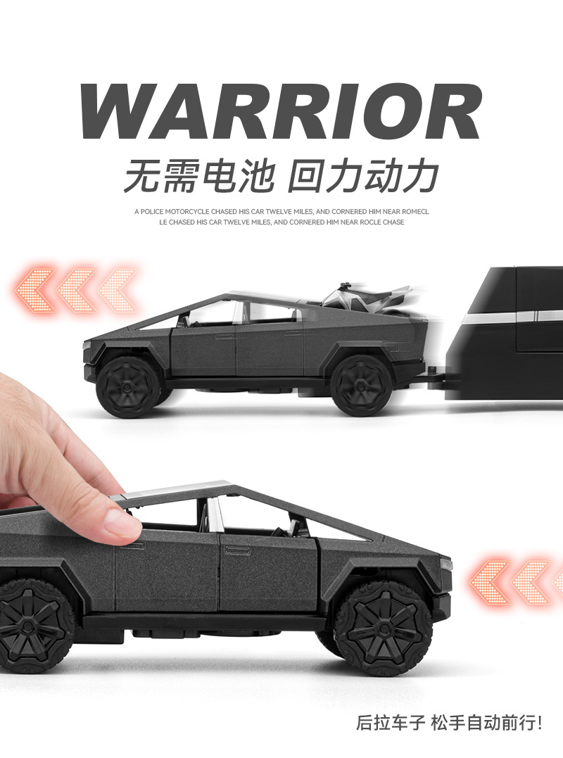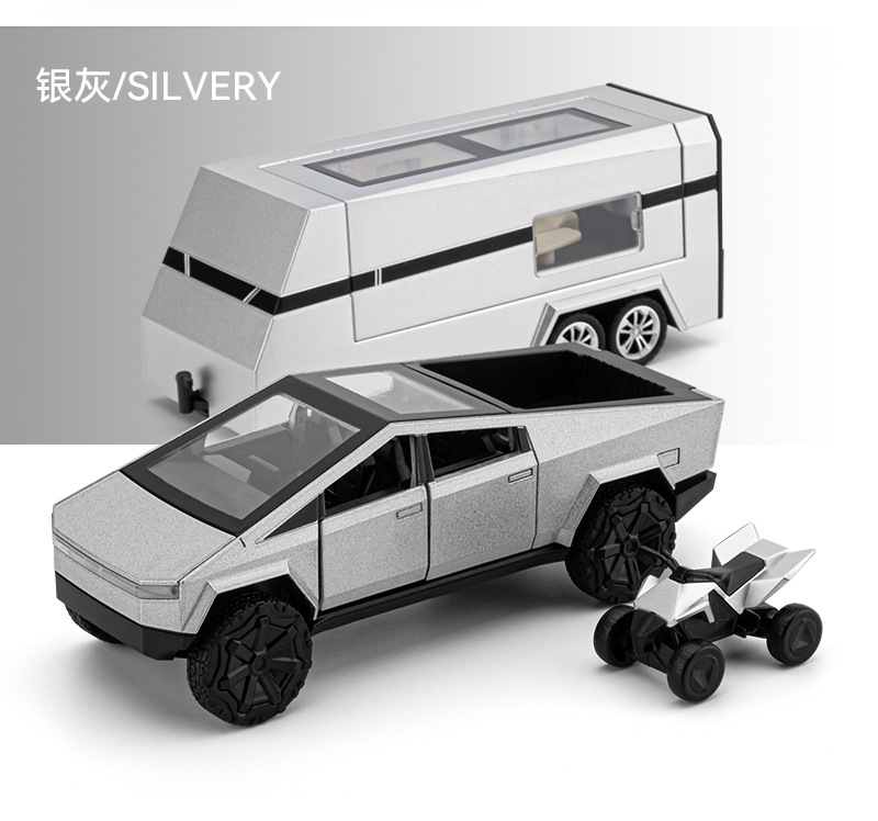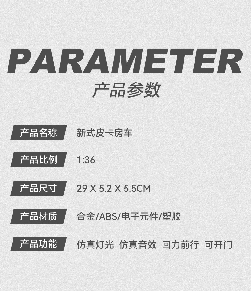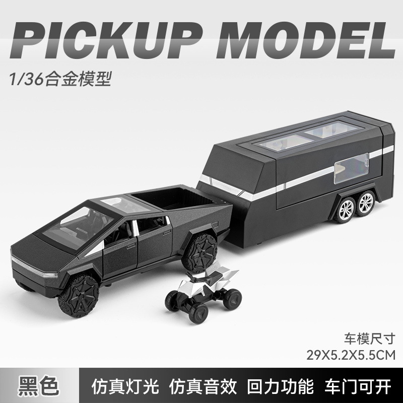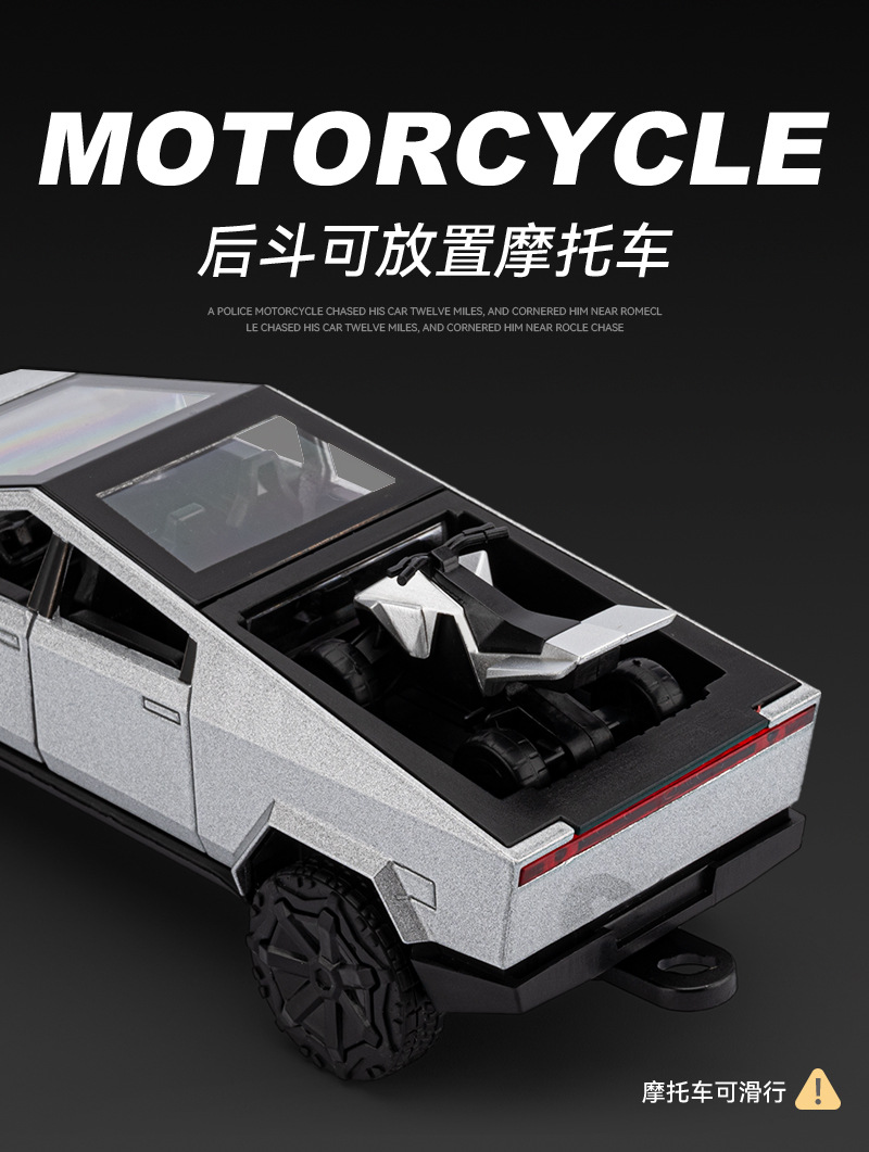 观景舱门可掀开;皮卡与房车可链接拖挂;皮卡后斗可放置摩托车(摩托车可滑行);五开门,高仿真灯光音效(按压前轮触发灯光音效);