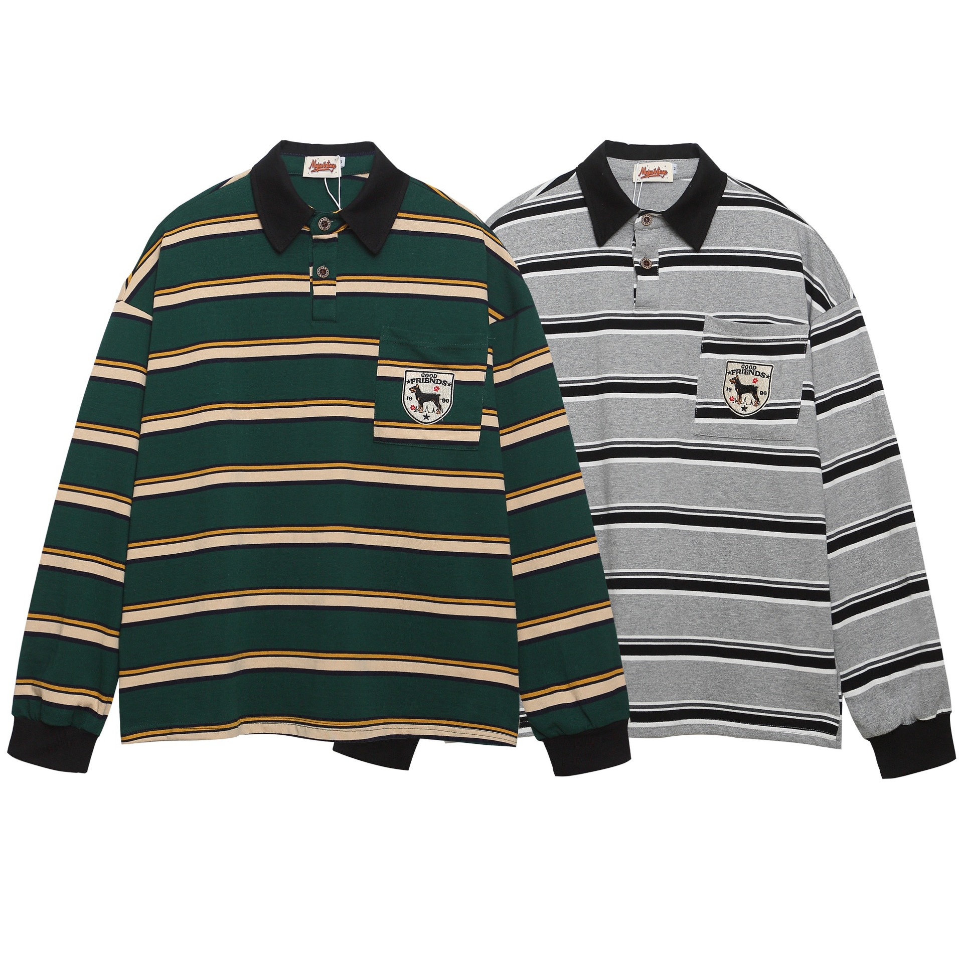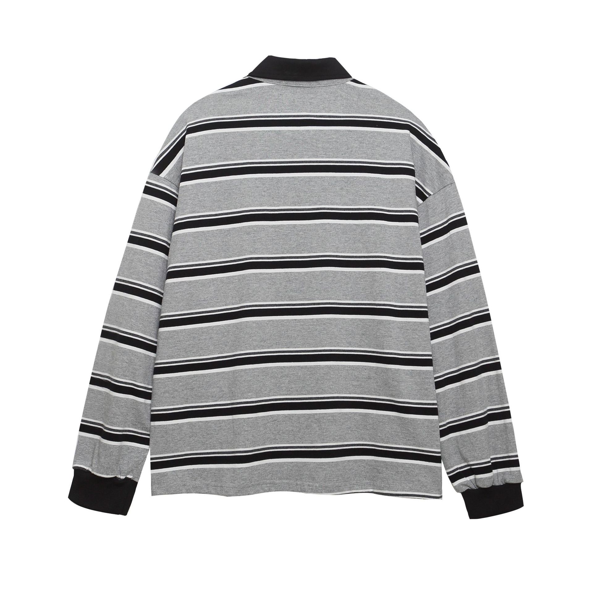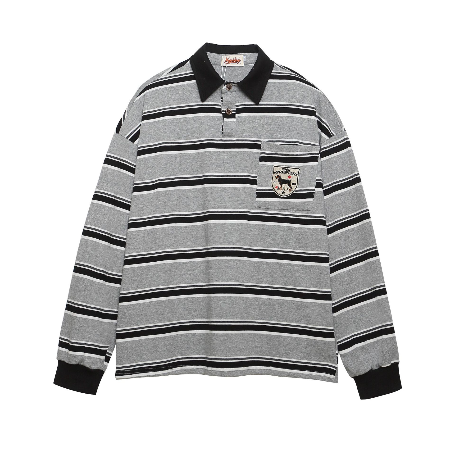 미국 복고풍 대비 색 줄무늬 자수 긴팔 폴로 칼라 스웨트 셔츠 남성 가을 새로운 느슨한 캐주얼 커플 탑
