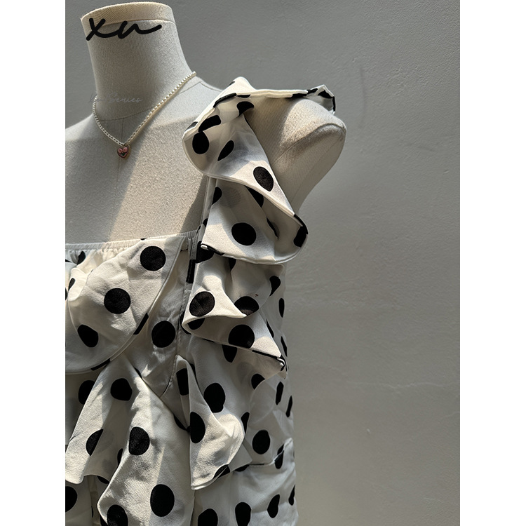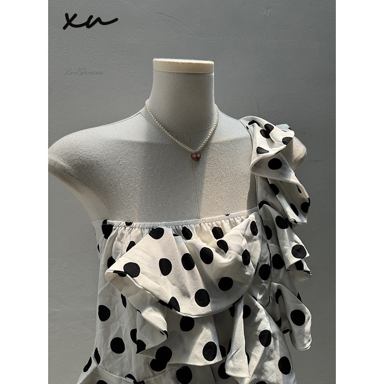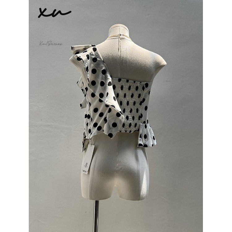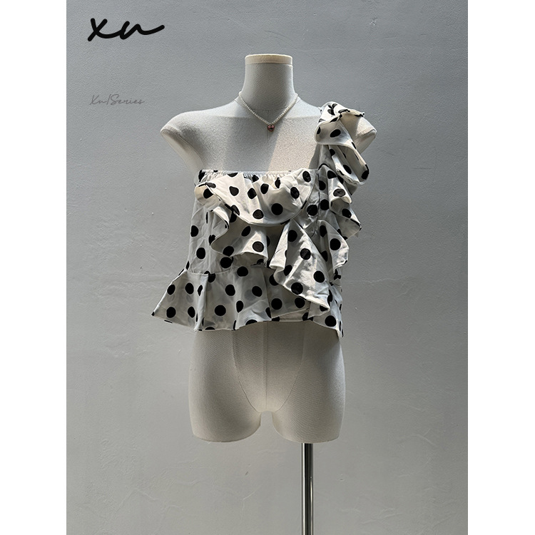 손실을 보상하려고! XU620 # F 사이즈의 부드럽고 달콤한 도트무늬 비대칭 어깨라인과 불규칙한 러플 디자인의 스트랩리스 쉬폰 탑