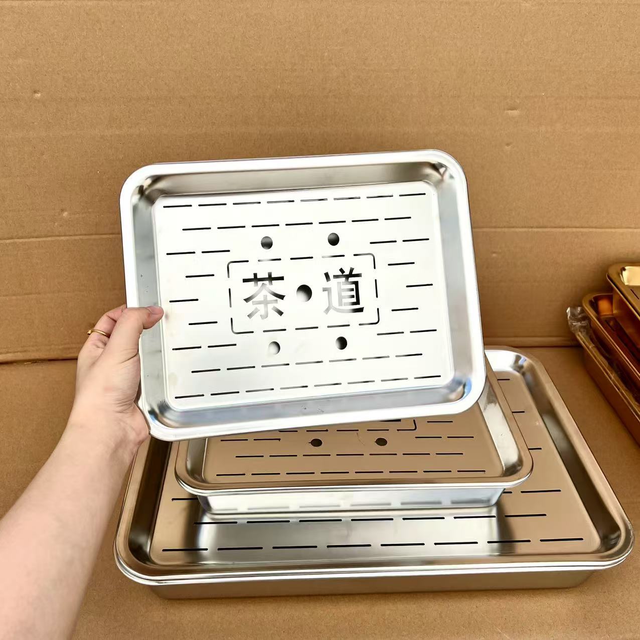 304 스테인레스 스틸 두꺼운 간단한 중국 차 트레이 직사각형 물 컵 트레이 배수 트레이 만두 트레이 간단한 구멍