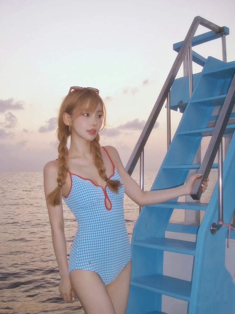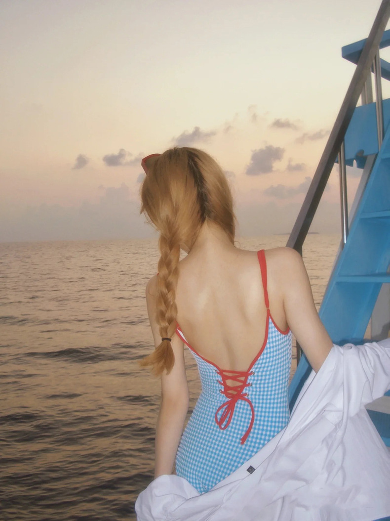 여성용 프레시 로리타 스타일 순수한 매력 학생 체크무늬 끈 없는 섹시한 온천 원피스 수영복