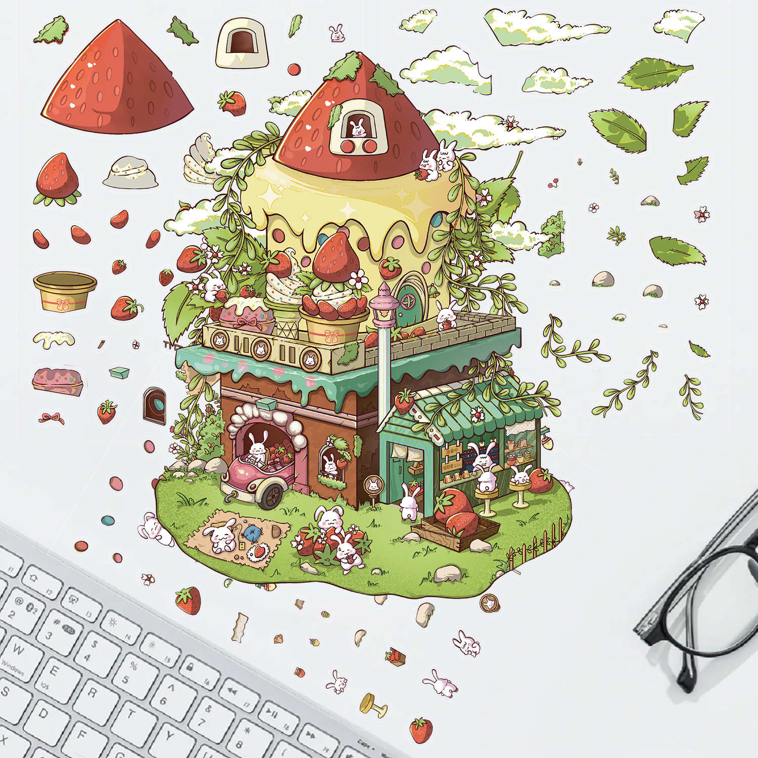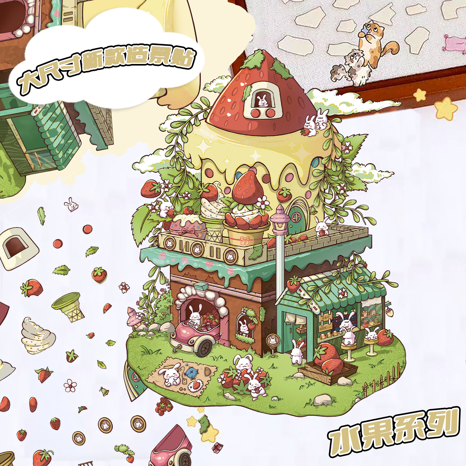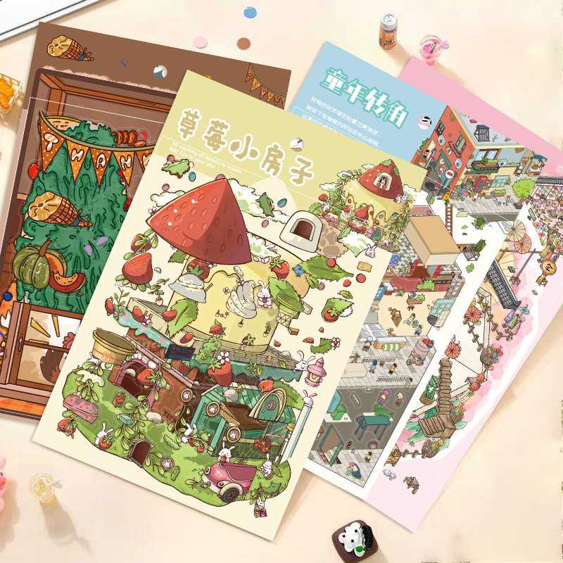 3 딸기 작은 집 토끼 조경 대형 레이아웃 미니어처 풍경 스티커 DIY 스티커 장난감 감압 작은 빨간색 책 스티커스토어 가기