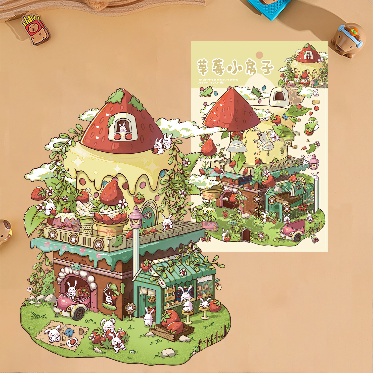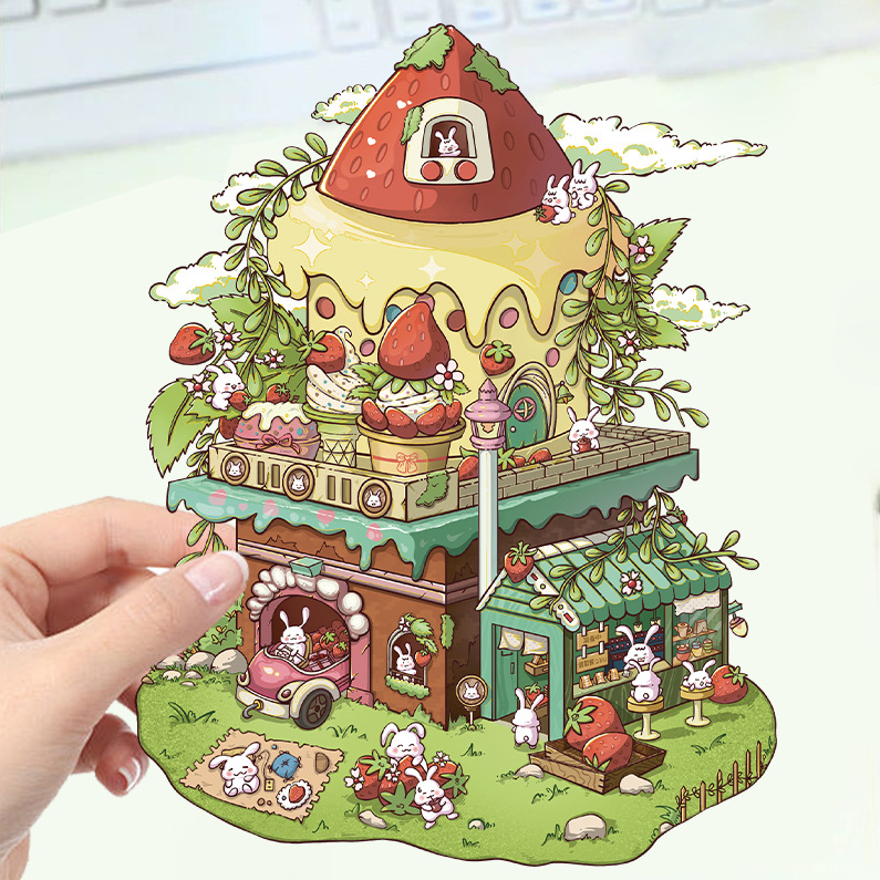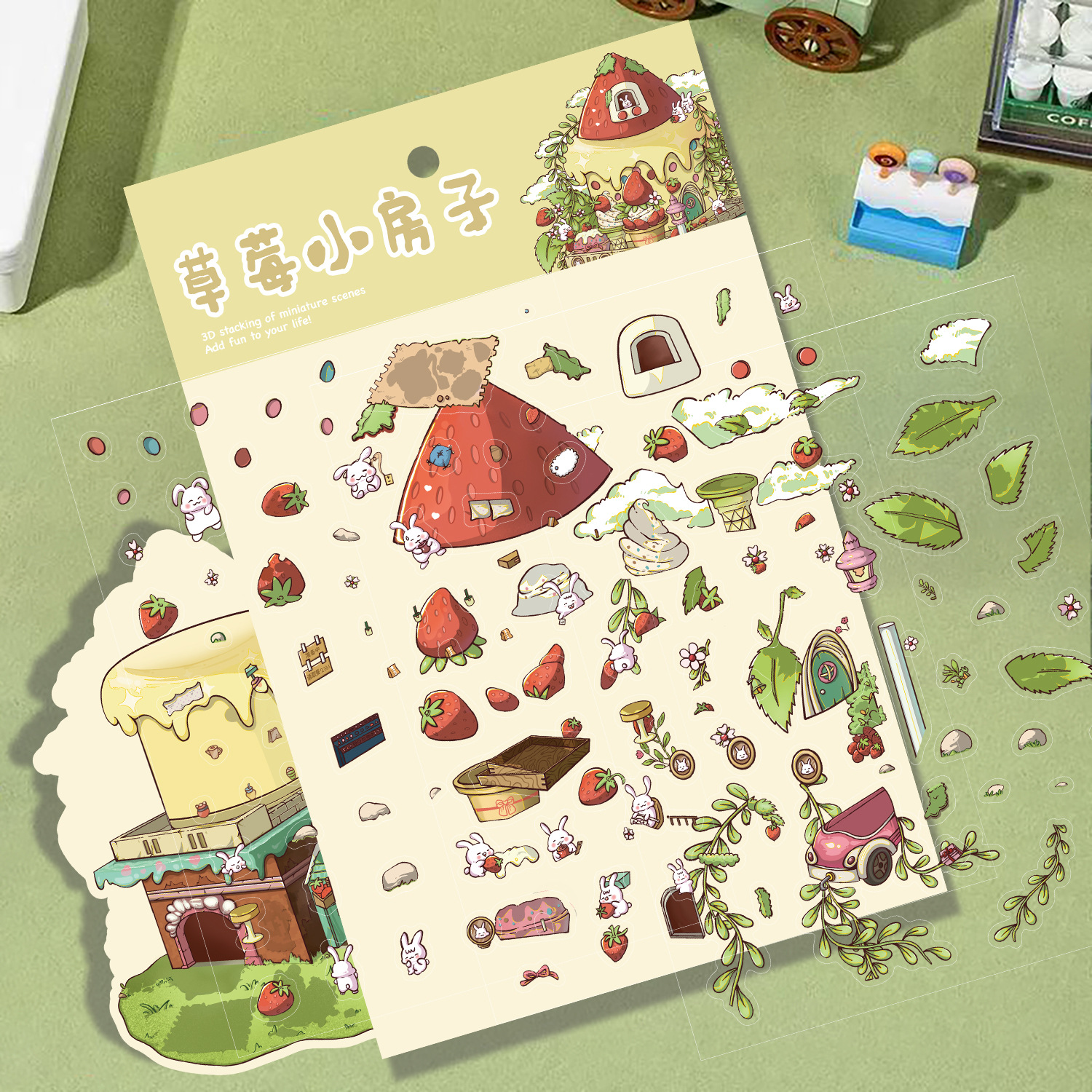 3 딸기 작은 집 토끼 조경 대형 레이아웃 미니어처 풍경 스티커 DIY 스티커 장난감 감압 작은 빨간색 책 스티커