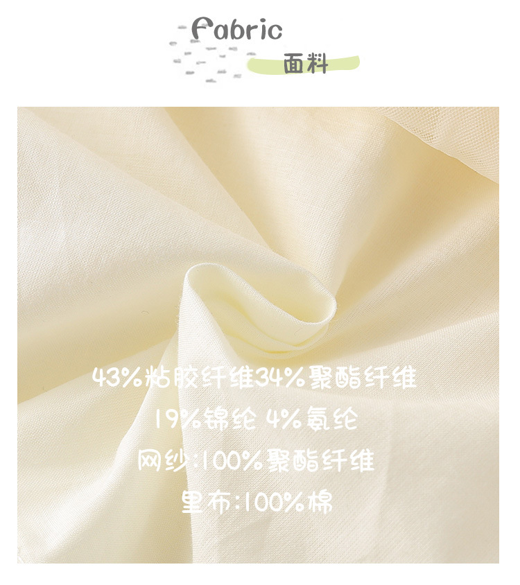 裙子面料成分:43%粘胶纤维34%聚酯纤维19%锦纶 4%氨纶网纱:100%聚酯纤维里布:100%棉