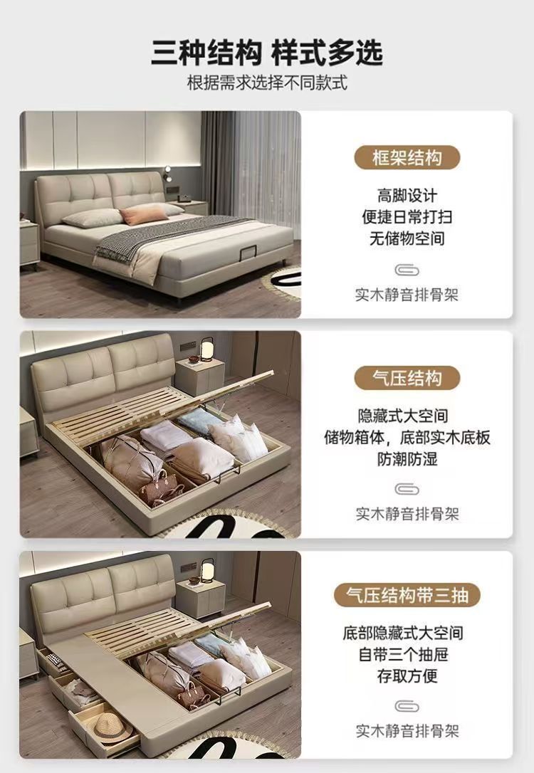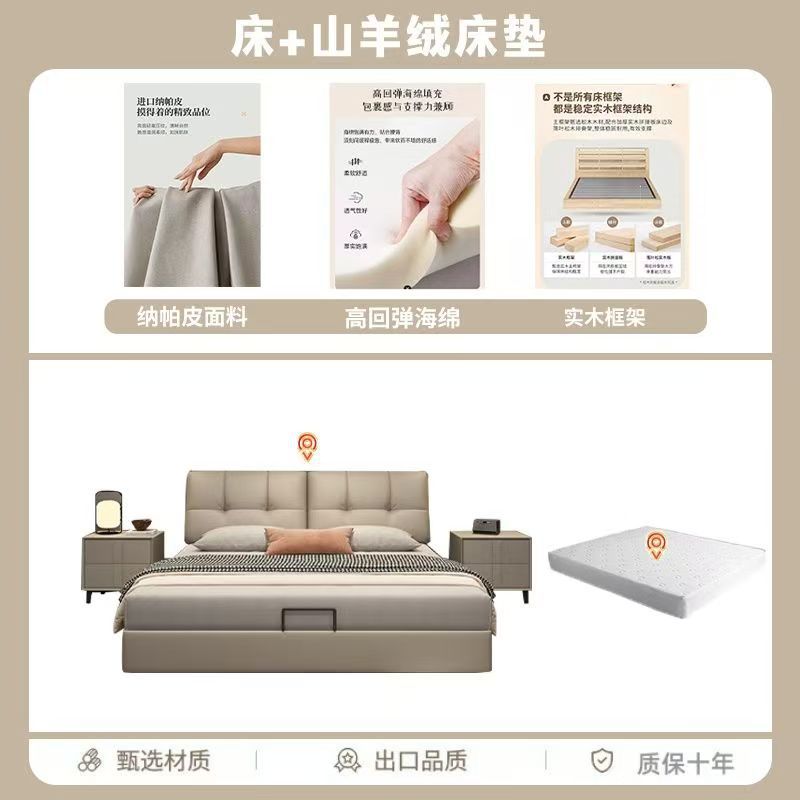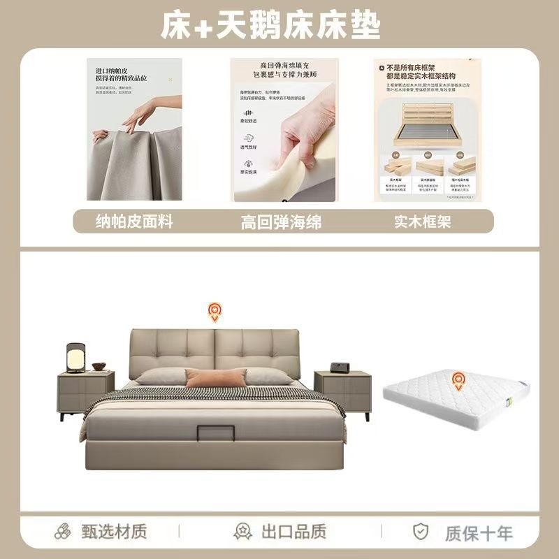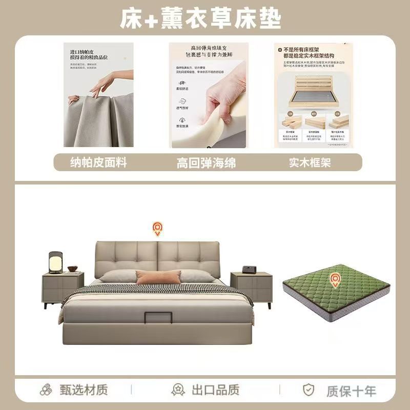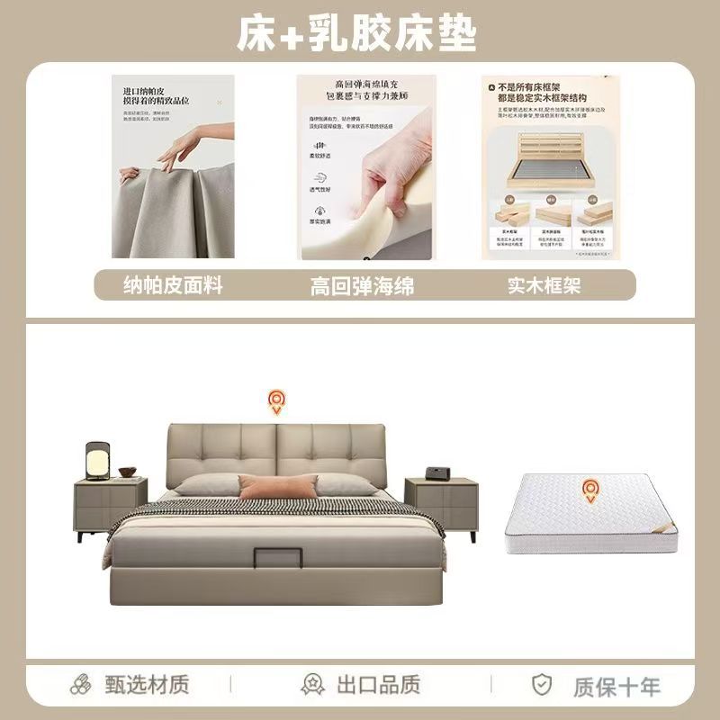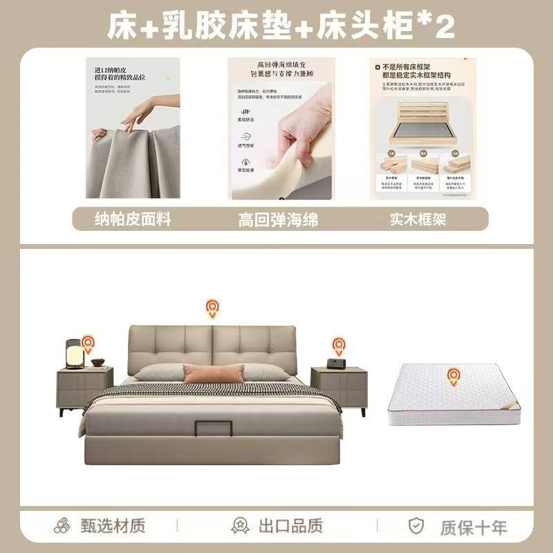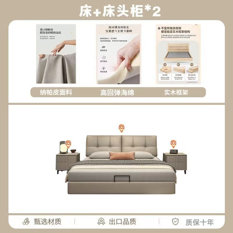 프렌치 크림 스타일 가죽 침대, 모던하고 심플한 라이트 럭셔리 침대, 마스터 침실, 대형 침대, 더블 침대, 웨딩 침대