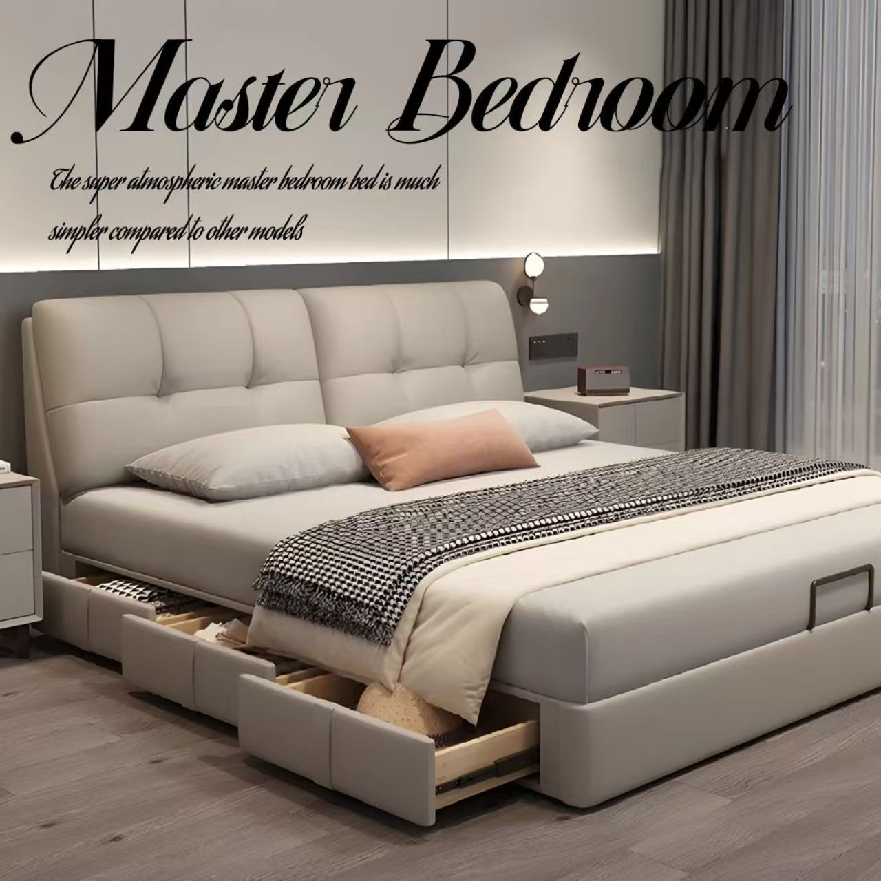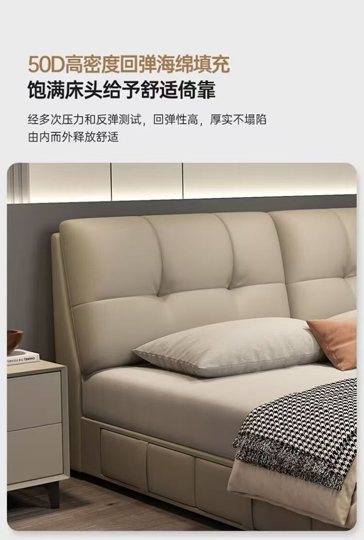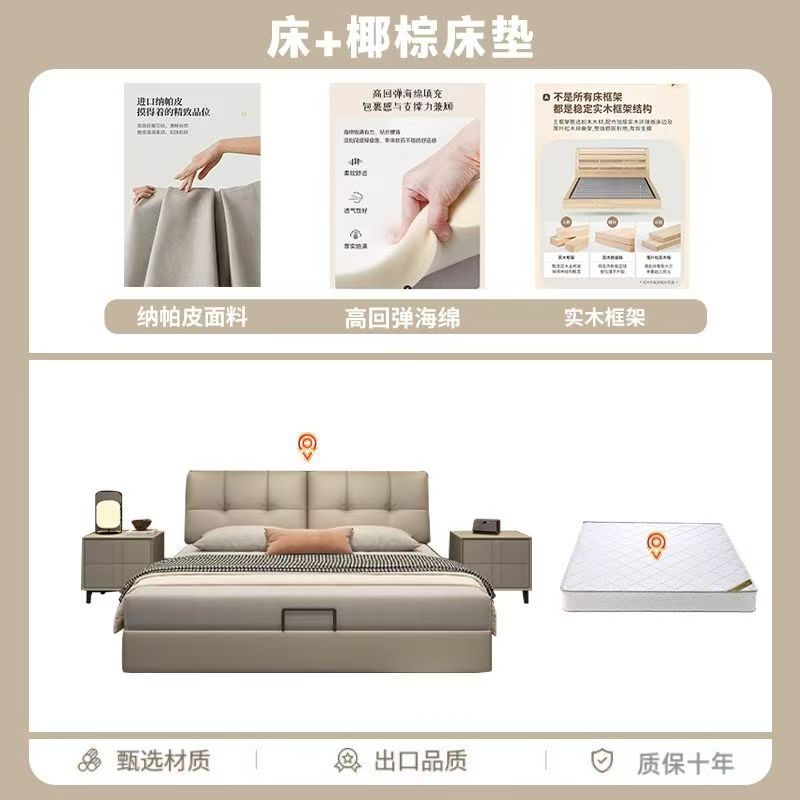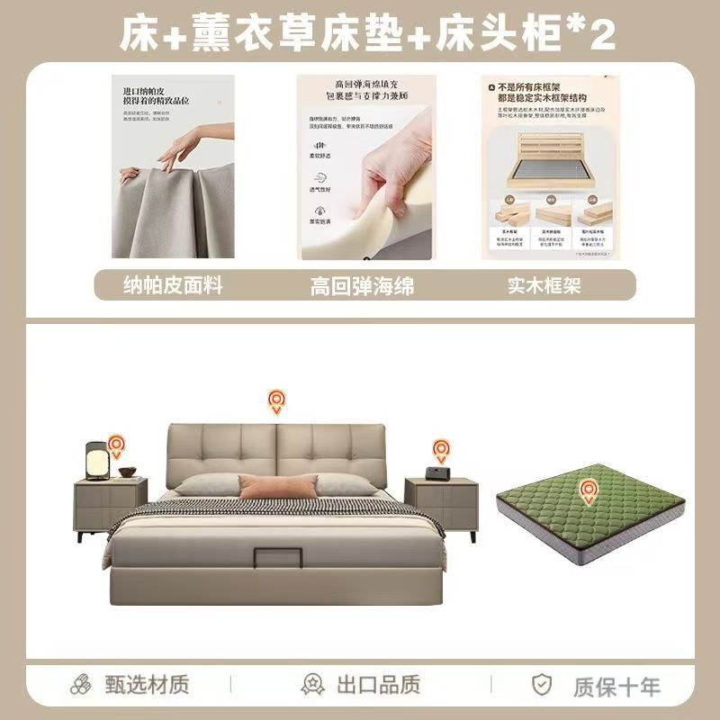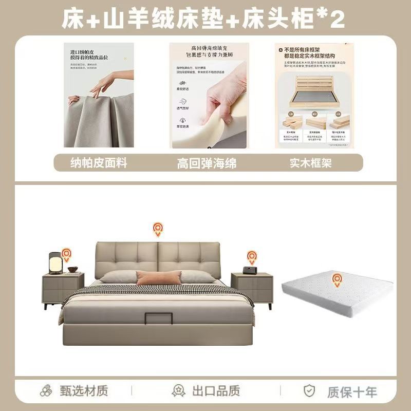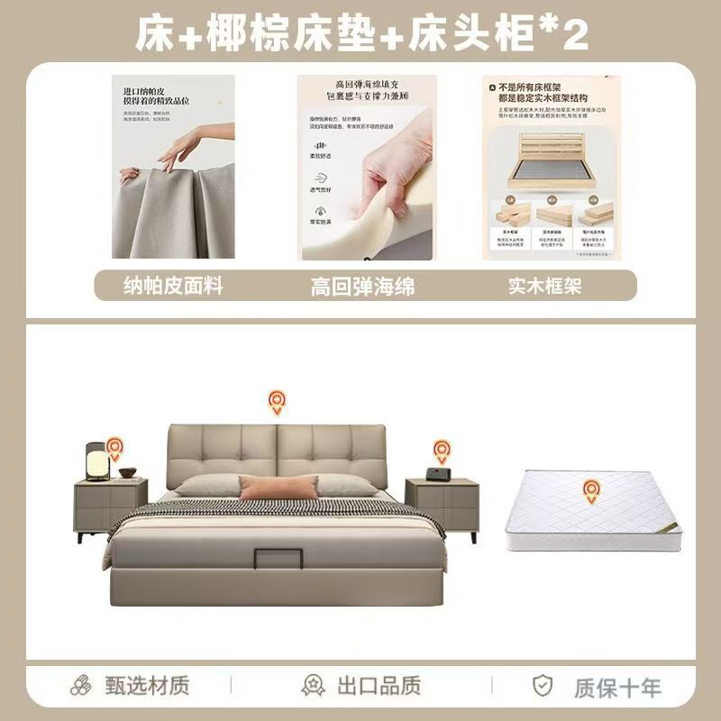 프렌치 크림 스타일 가죽 침대, 모던하고 심플한 라이트 럭셔리 침대, 마스터 침실, 대형 침대, 더블 침대, 웨딩 침대