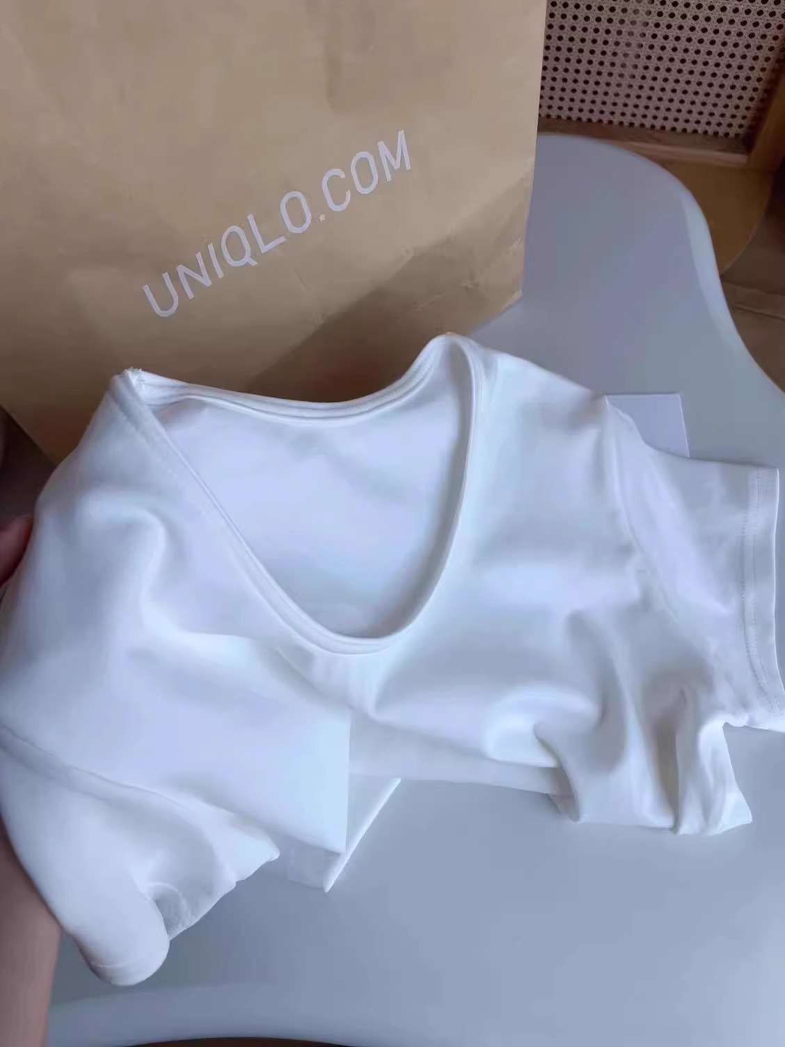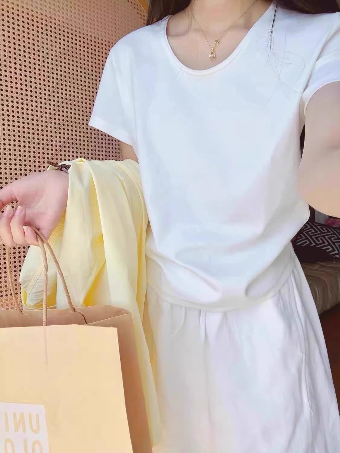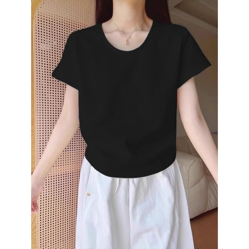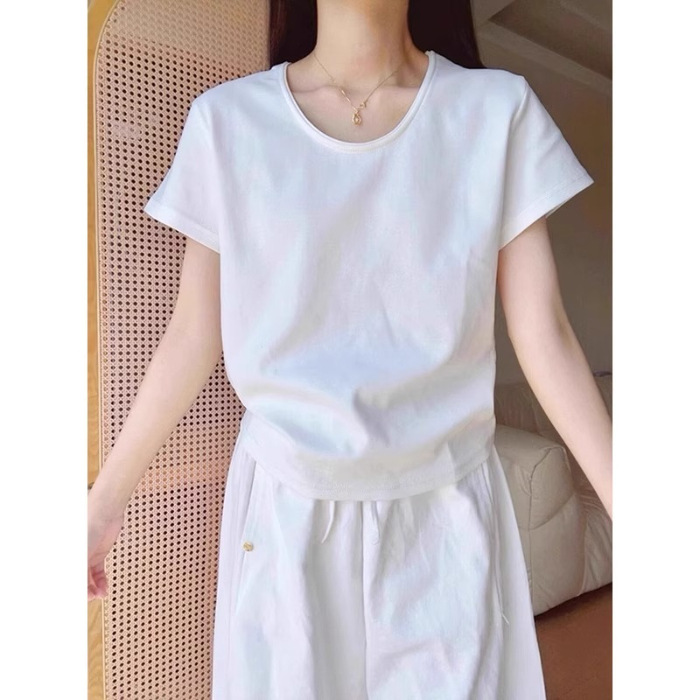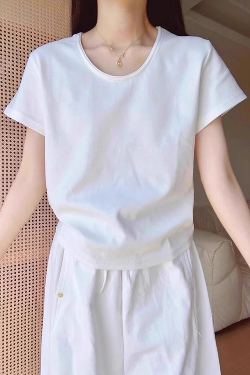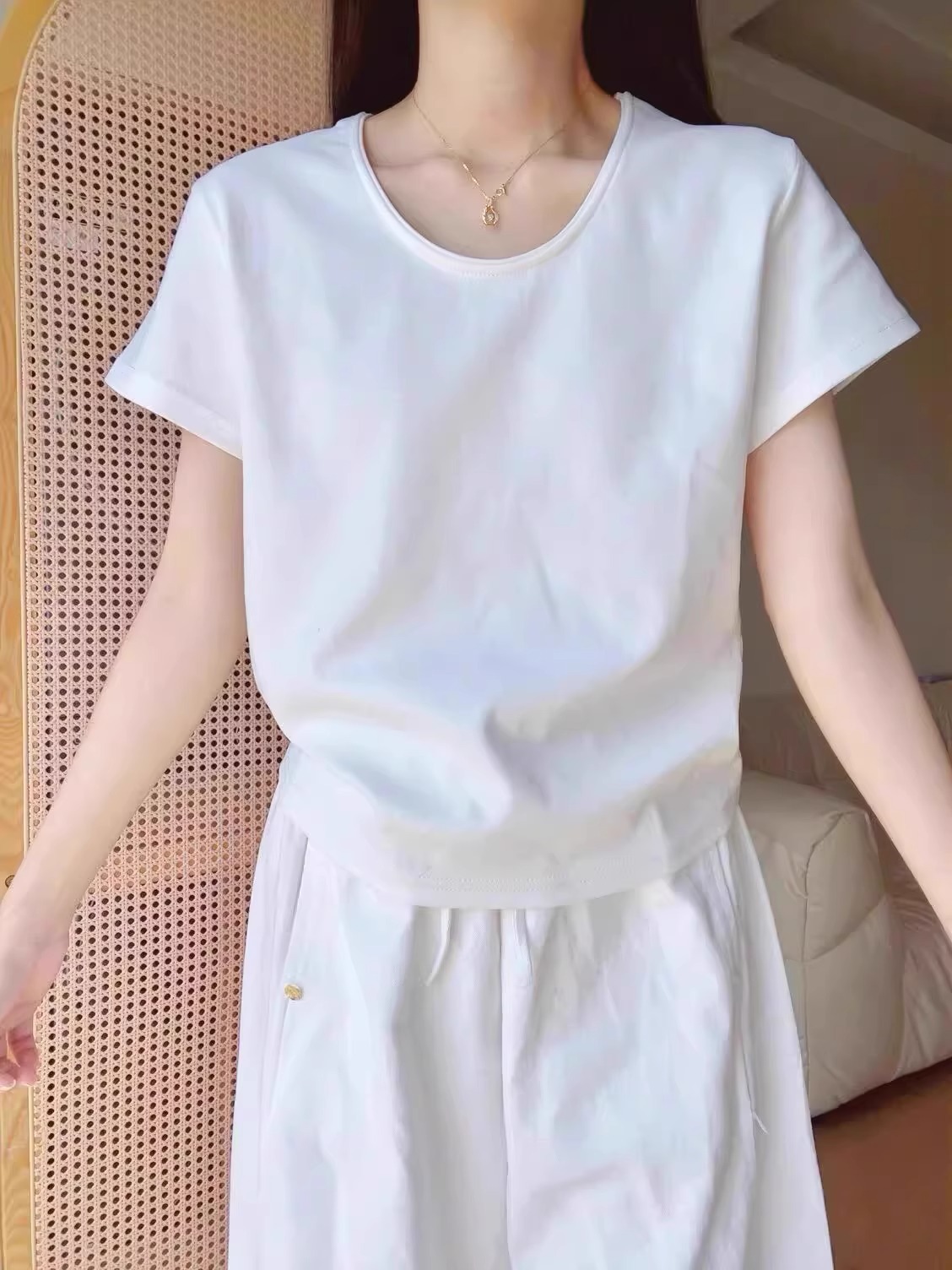화이트 유넥 심플하고 다재다능한 순면 오른쪽 어깨 반팔 티셔츠 여성용 2025 여름 신작 루즈 이너 레이어링 탑