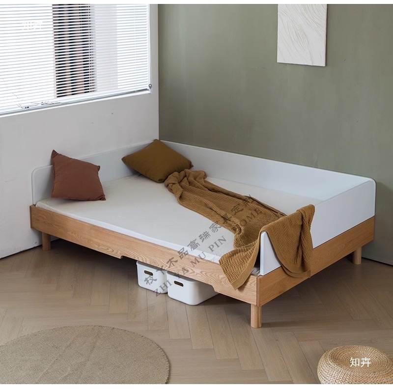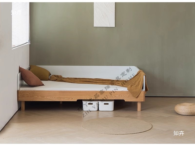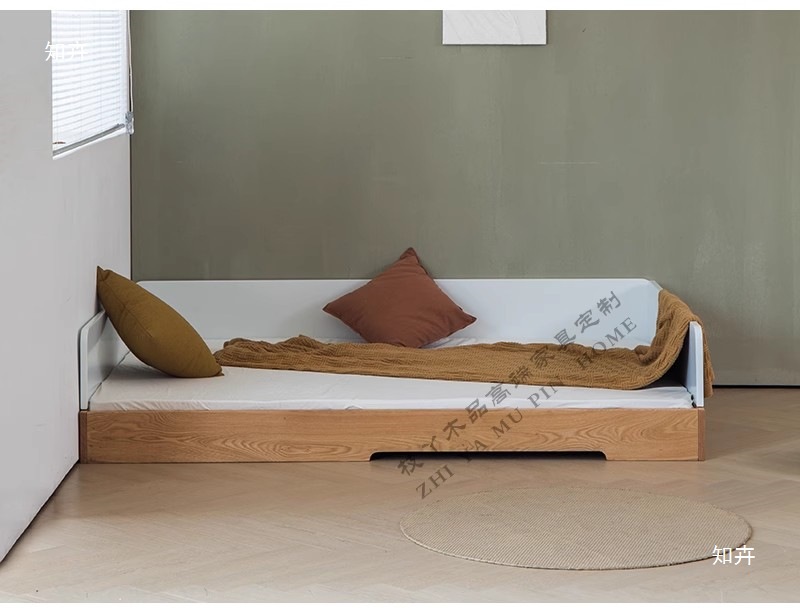 • 화이트 오크(높고 낮은) 가드레일이 없는 싱글 침대