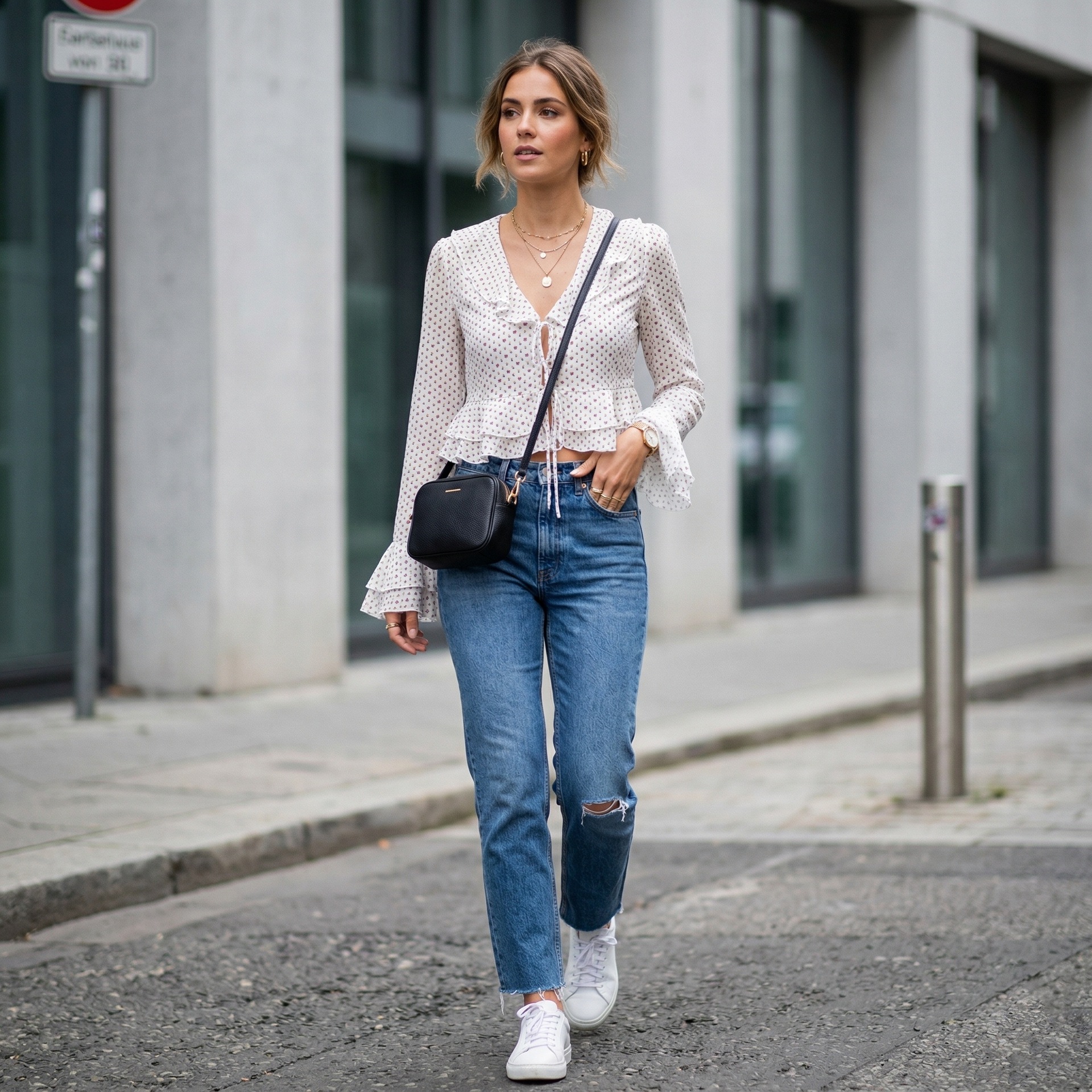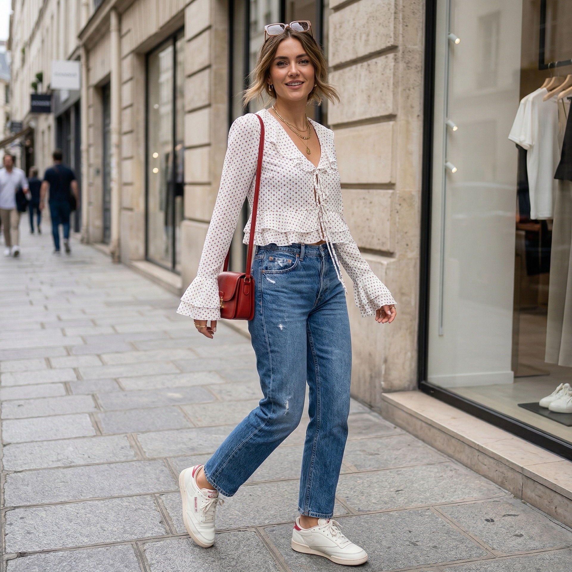 유럽과 미국의 국경을 넘나드는 2025 봄, 가을 프렌치 스타일의 부드럽고 달콤한 꽃무늬 러플 꽃잎 긴팔 레이스업 쉬폰 탑