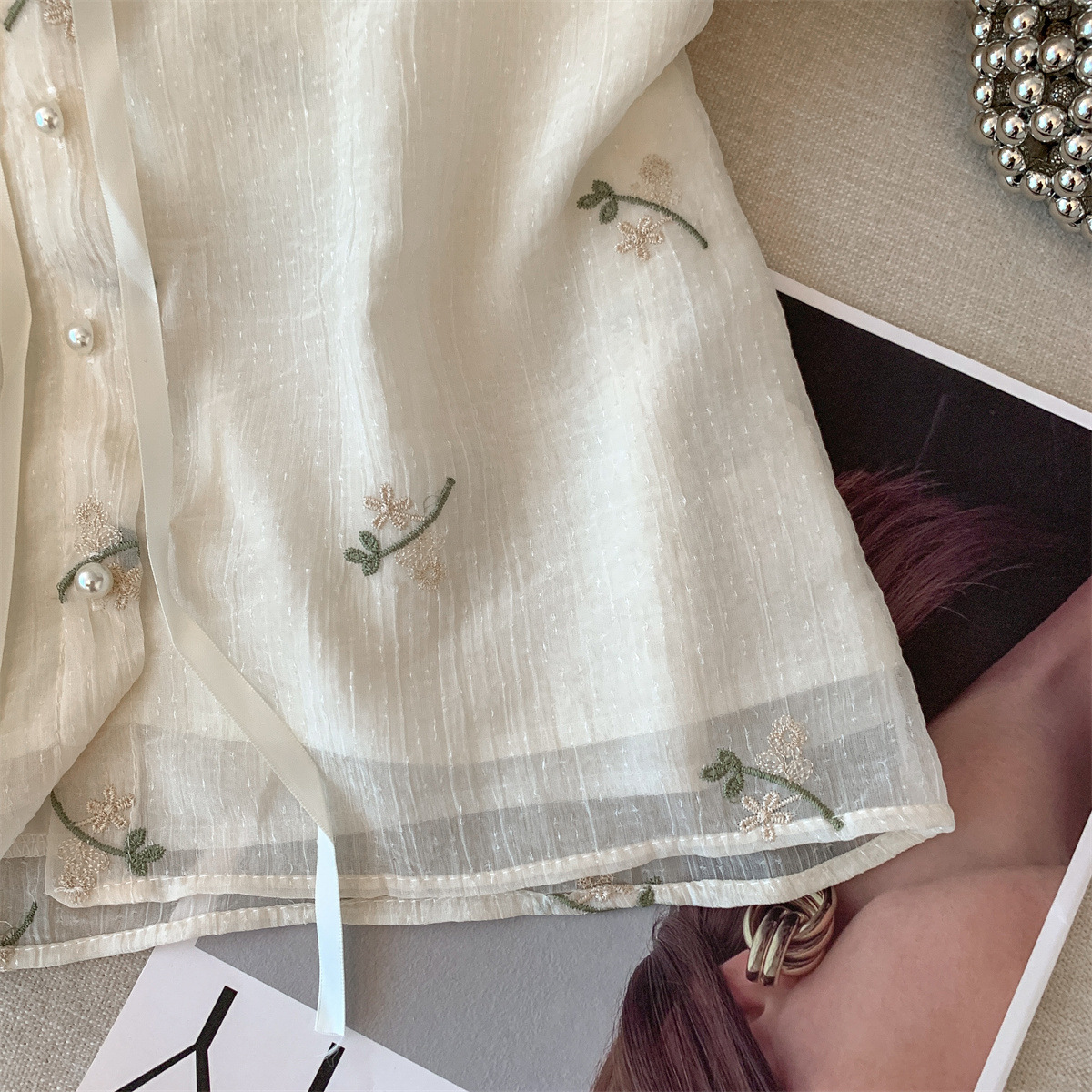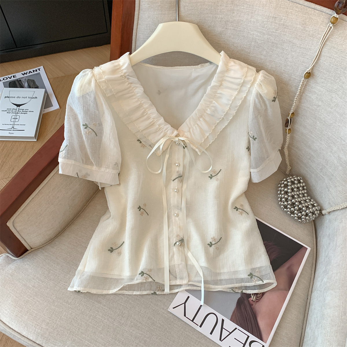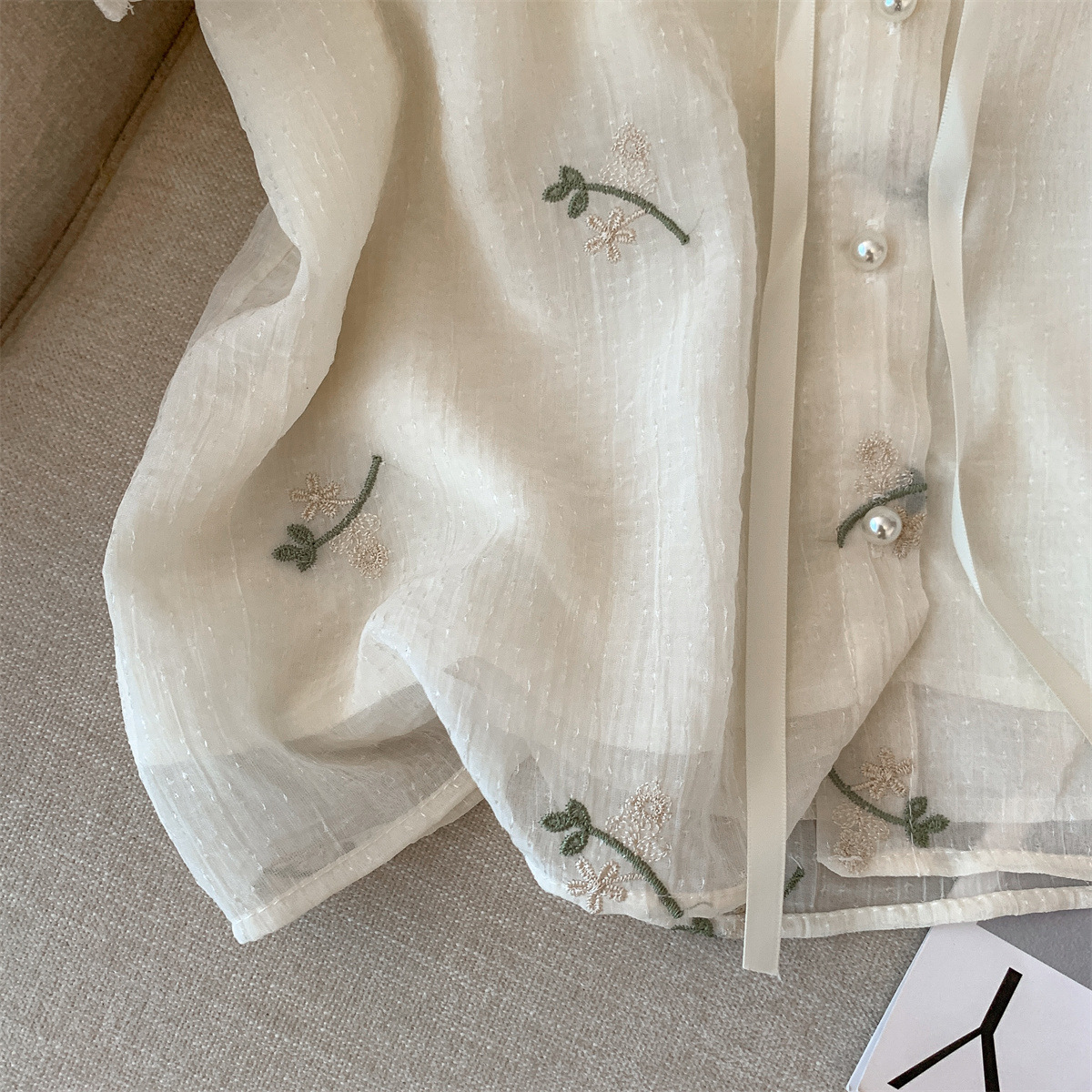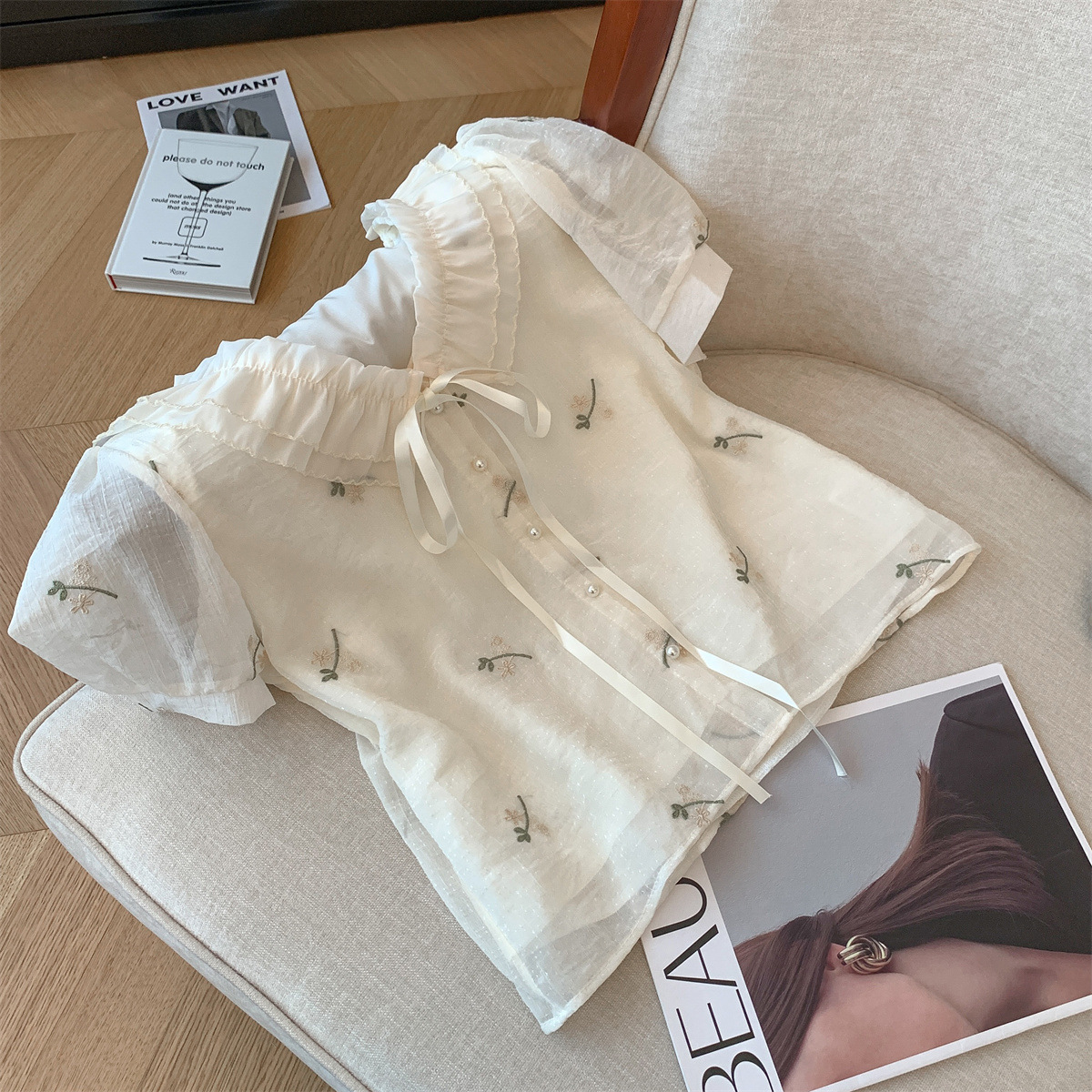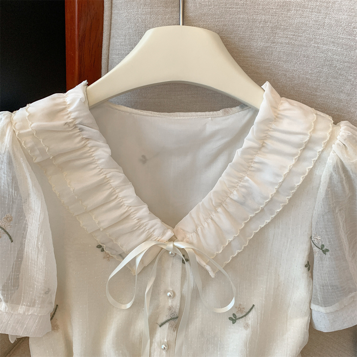 여성을위한 실제 사진 러플 자수 카디건 쉬폰 탑 여름 새로운 느슨한 달콤한 다목적 v 넥 반팔 셔츠