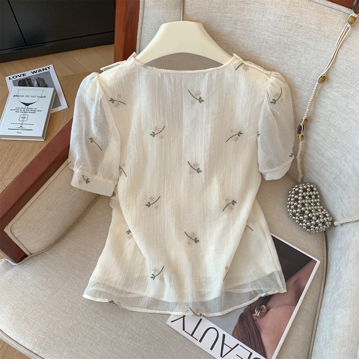 여성을위한 실제 사진 러플 자수 카디건 쉬폰 탑 여름 새로운 느슨한 달콤한 다목적 v 넥 반팔 셔츠스토어 가기