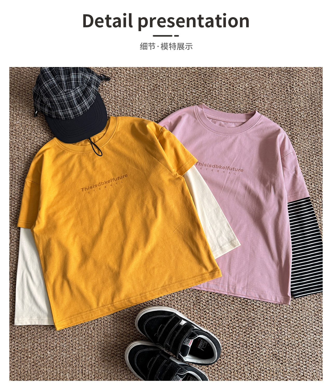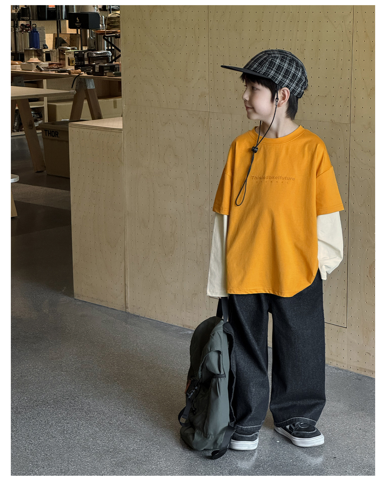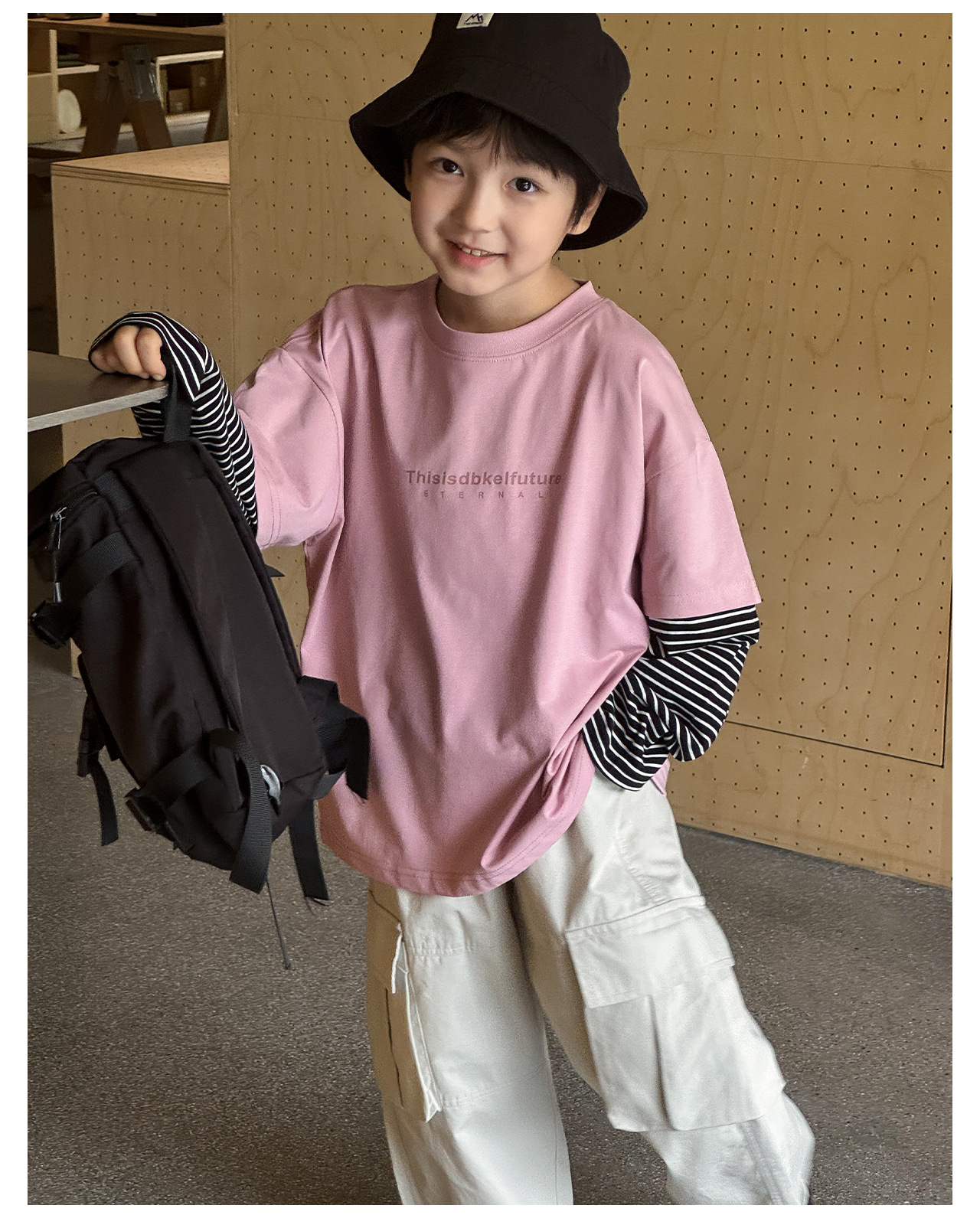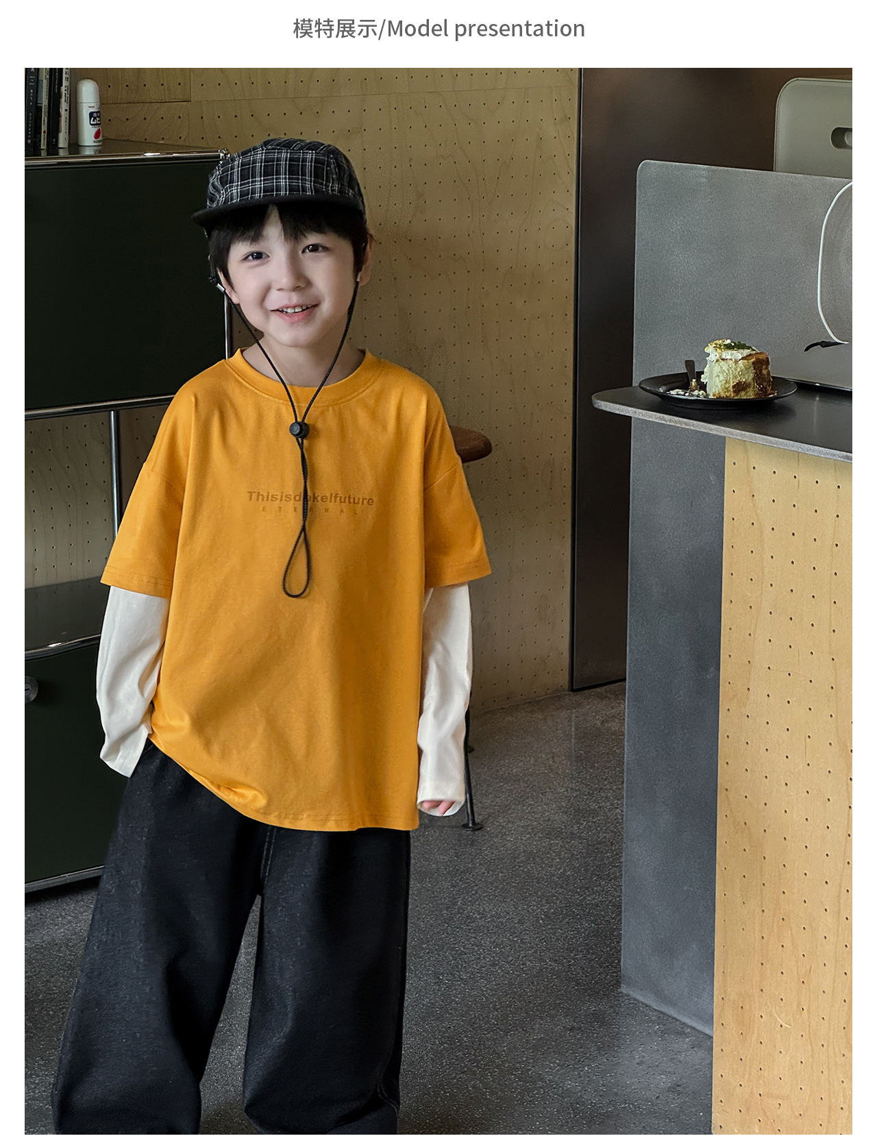 통쿠2026 남아용 봄 스타일 호주 직조리 아동복 트렌디한 레터 프린트 페이크 투피스 루즈핏 아동 티셔츠 멋짐스토어 가기