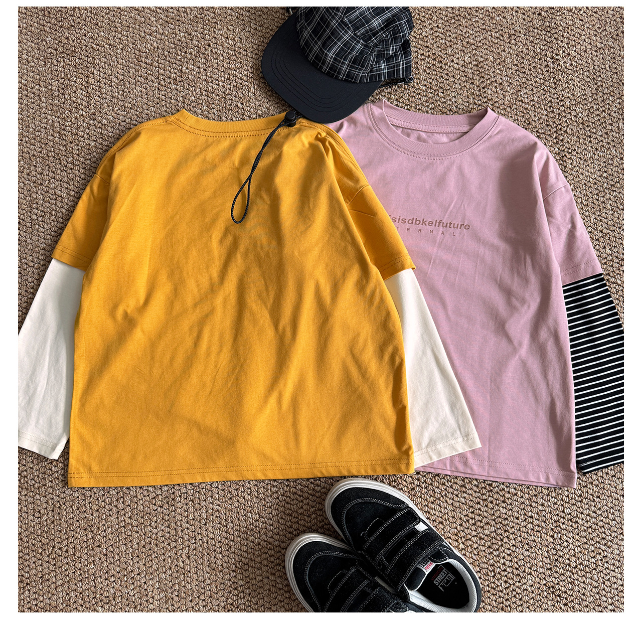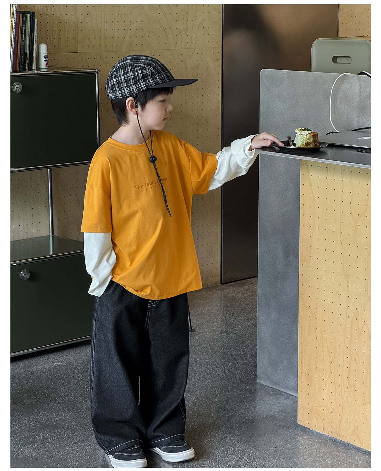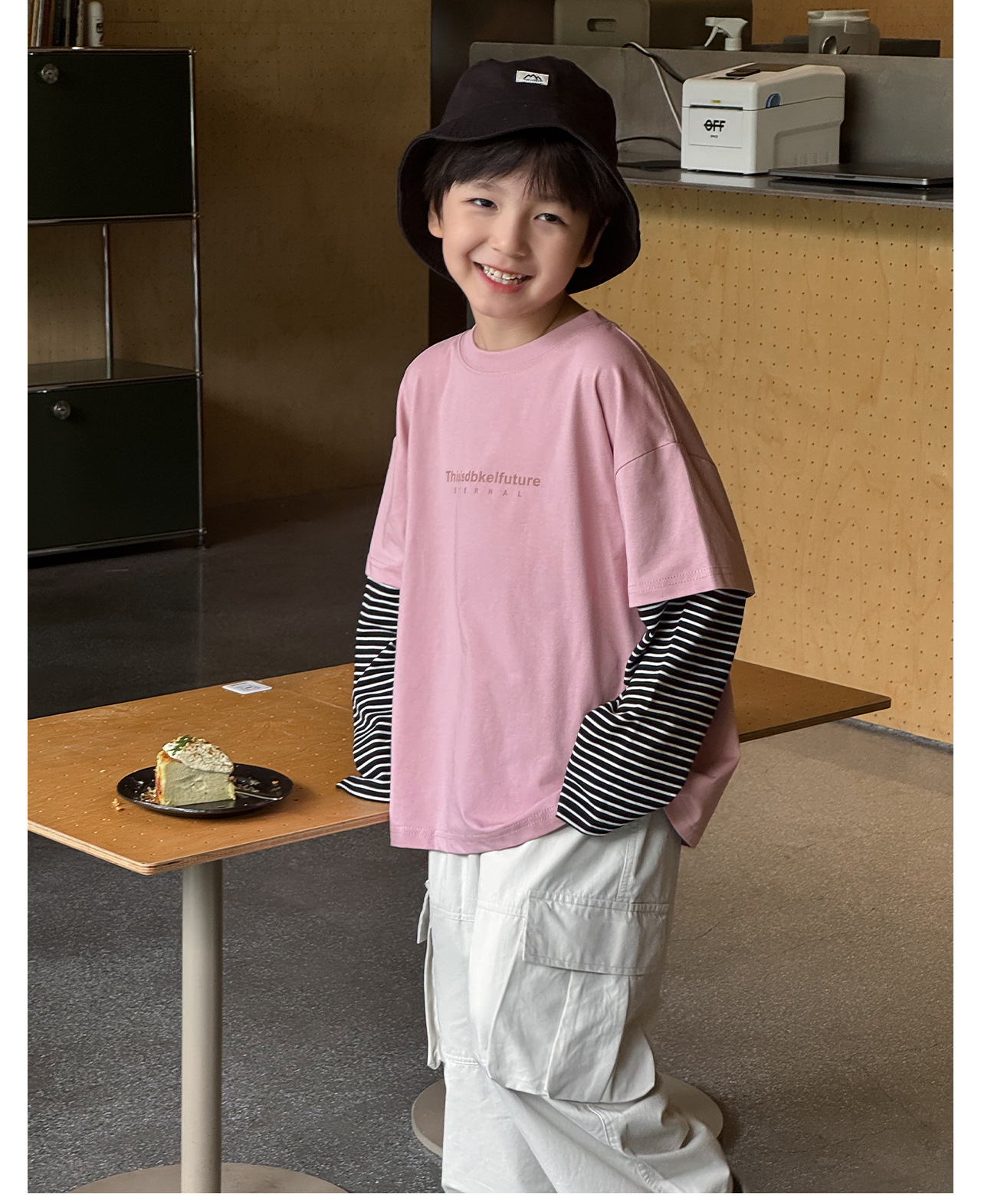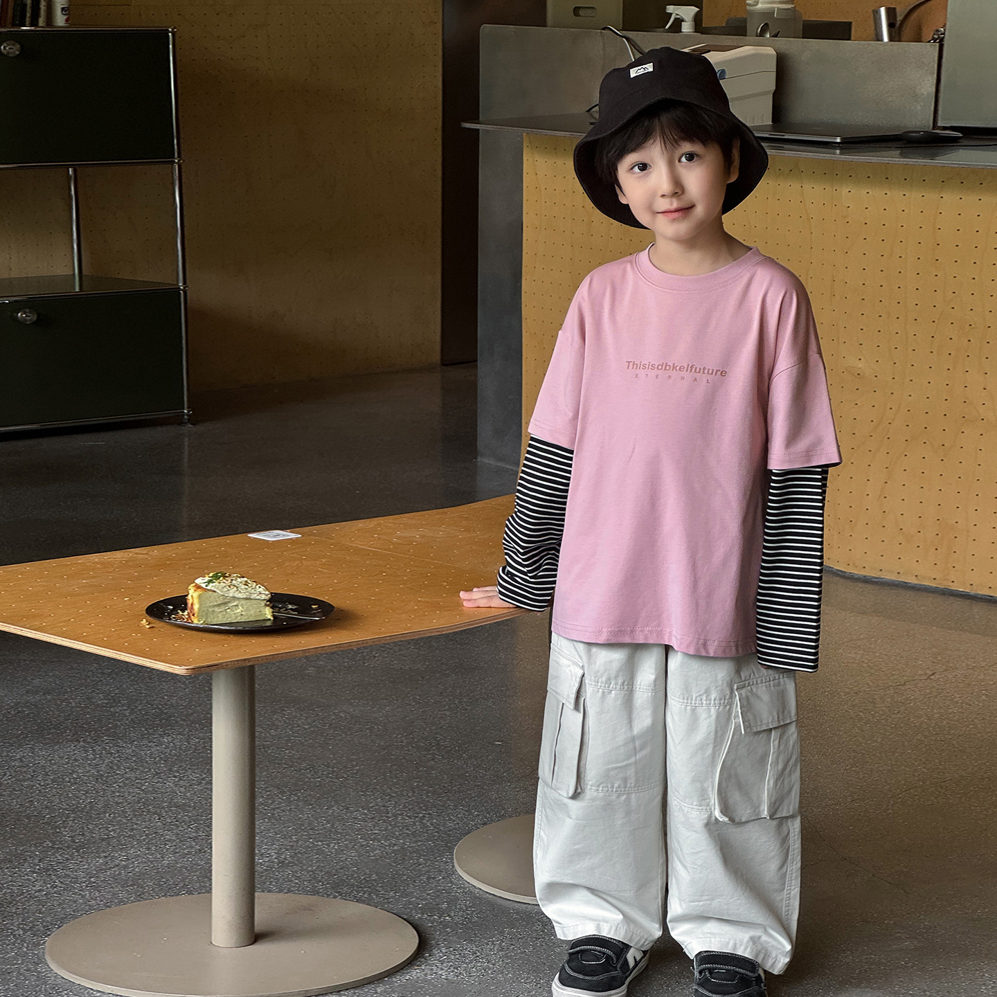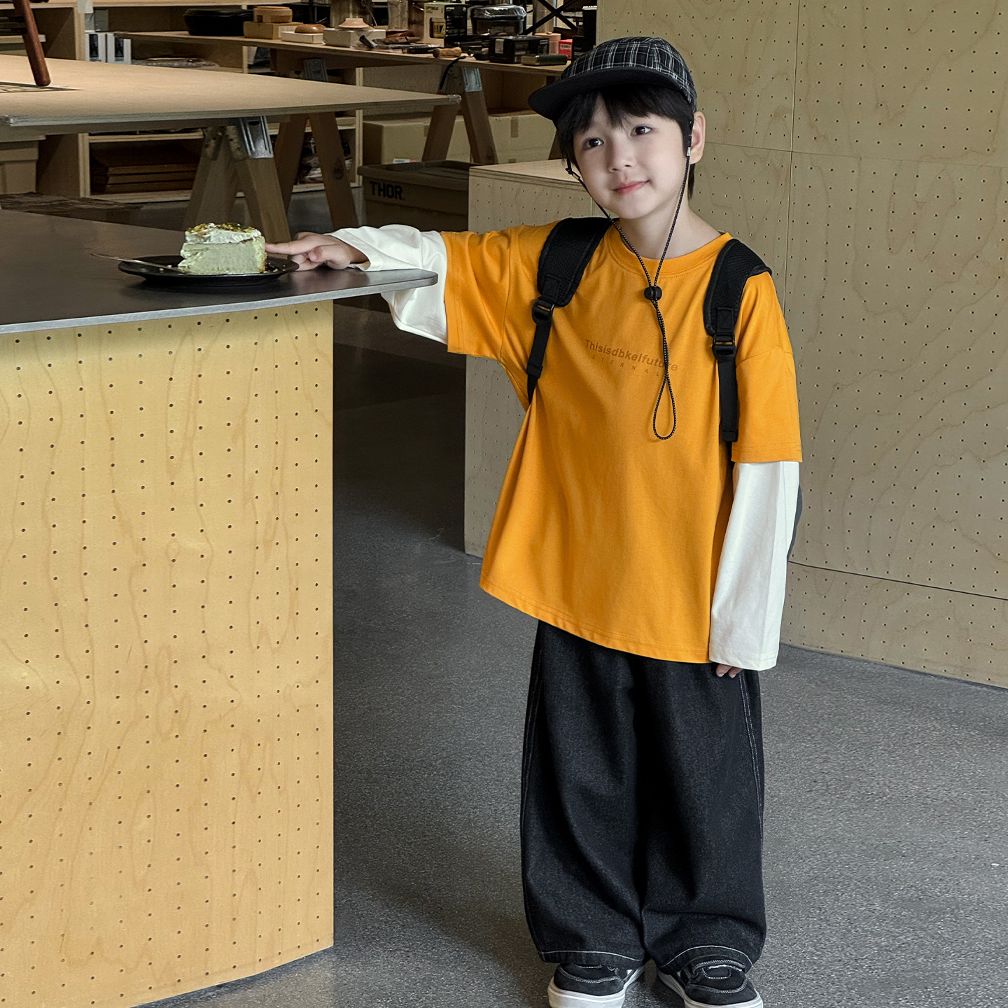 통쿠2026 남아용 봄 스타일 호주 직조리 아동복 트렌디한 레터 프린트 페이크 투피스 루즈핏 아동 티셔츠 멋짐스토어 가기