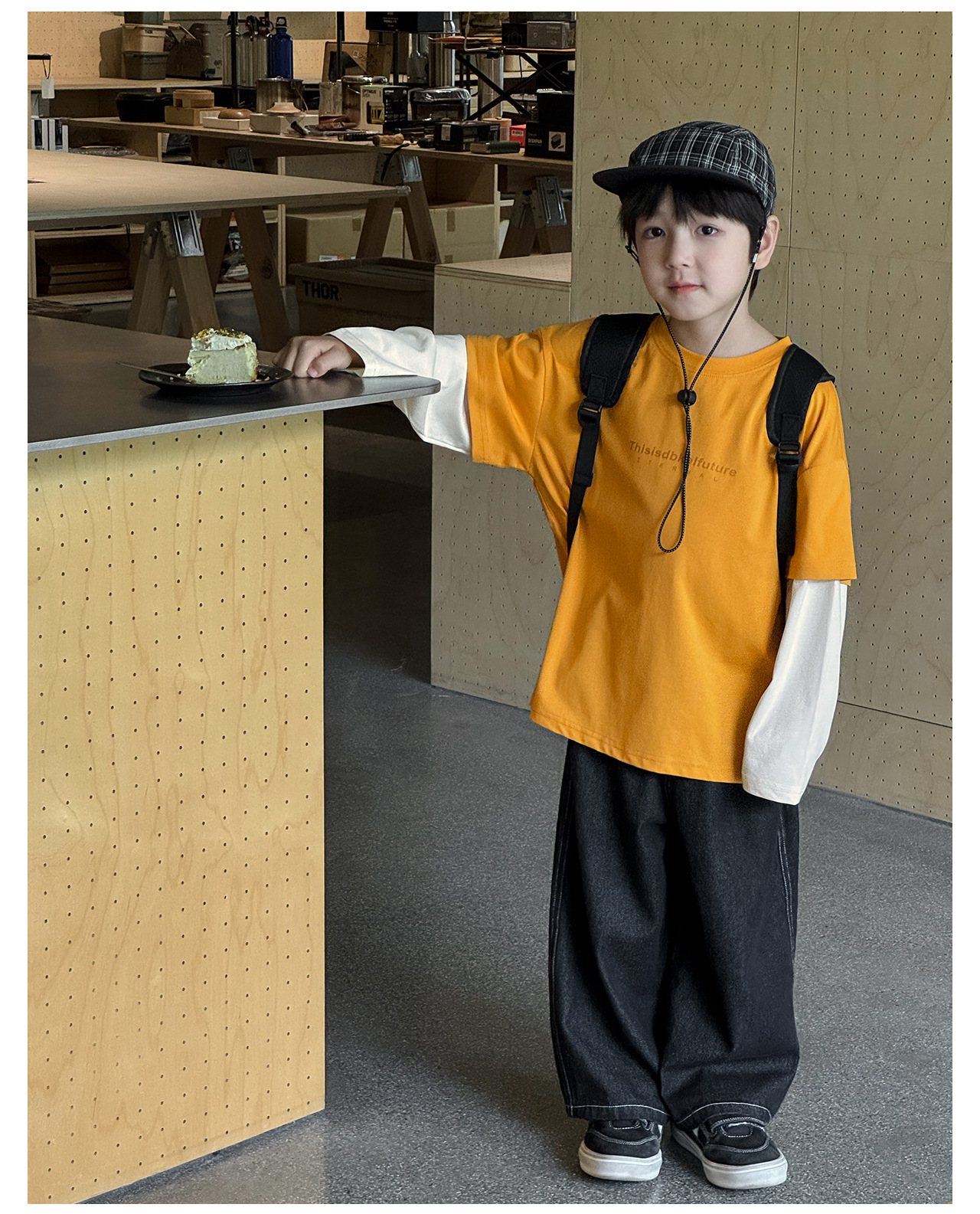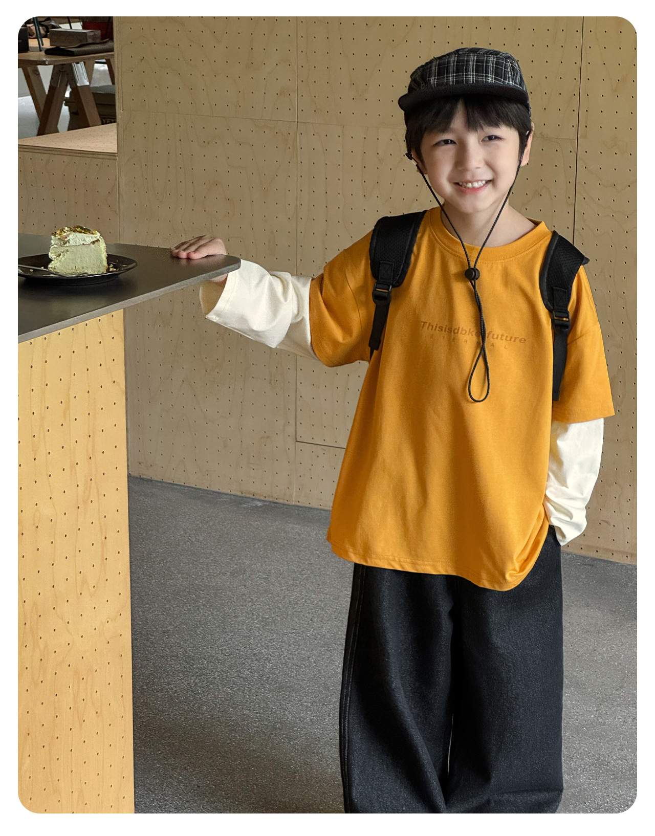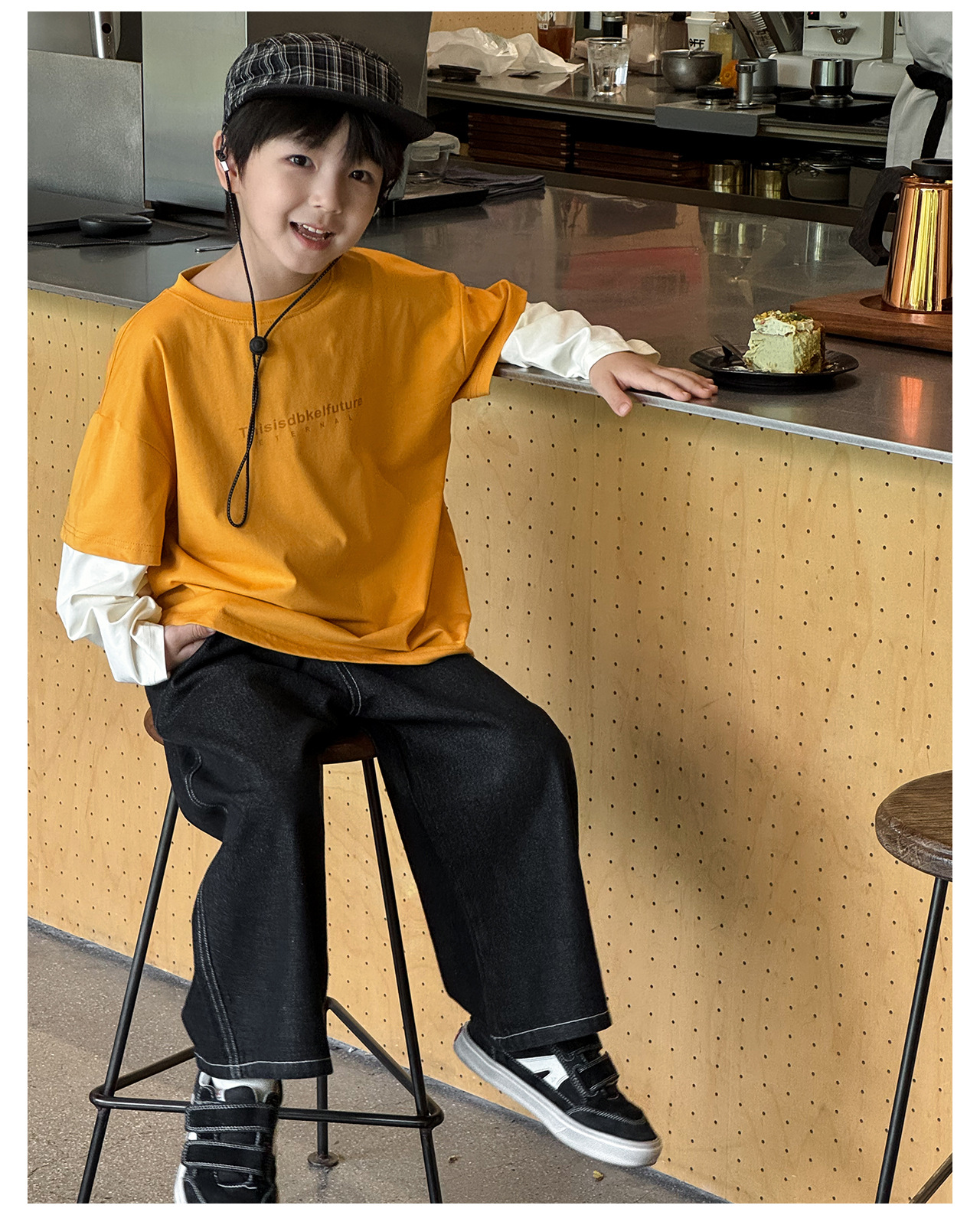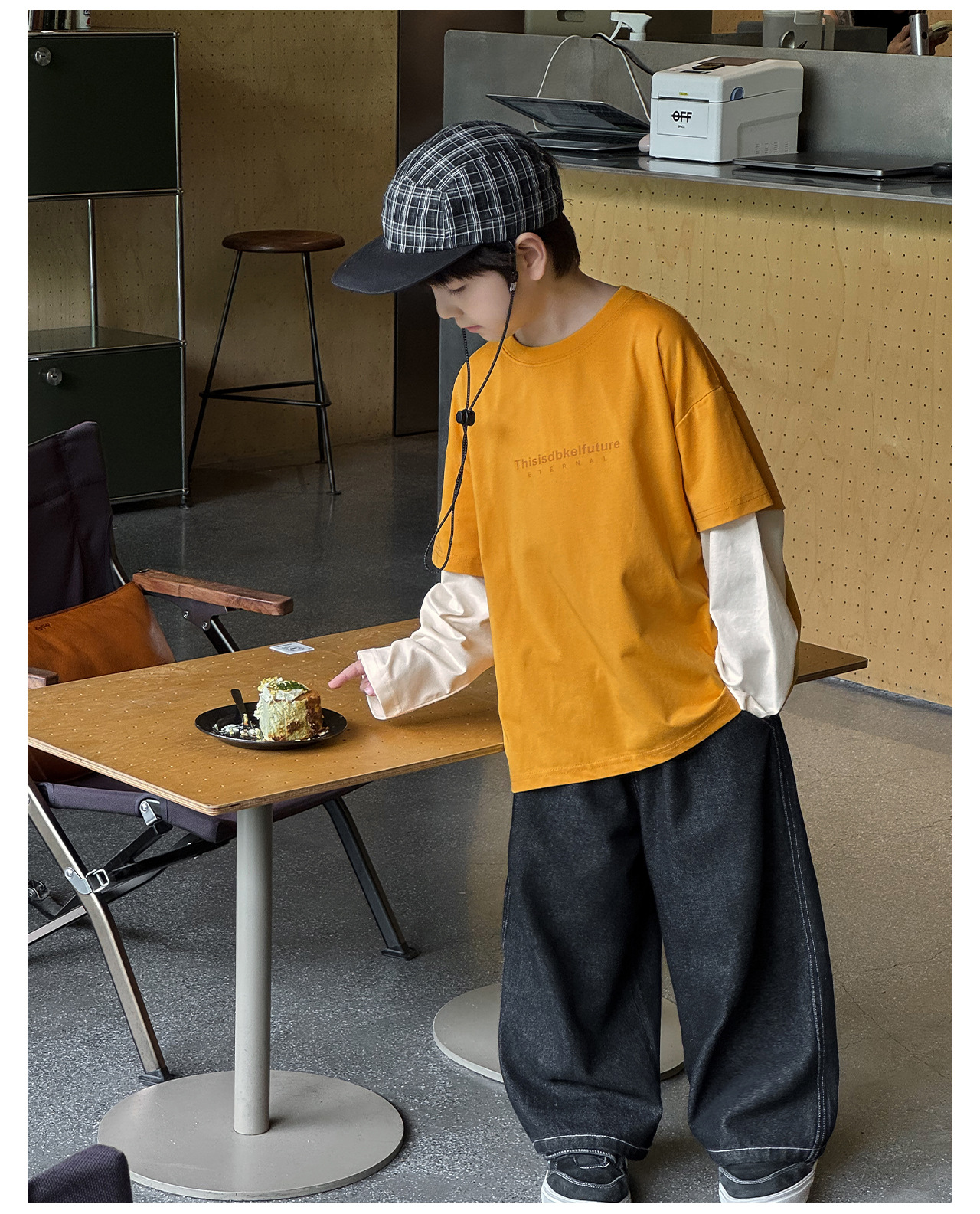 통쿠2026 남아용 봄 스타일 호주 직조리 아동복 트렌디한 레터 프린트 페이크 투피스 루즈핏 아동 티셔츠 멋짐스토어 가기