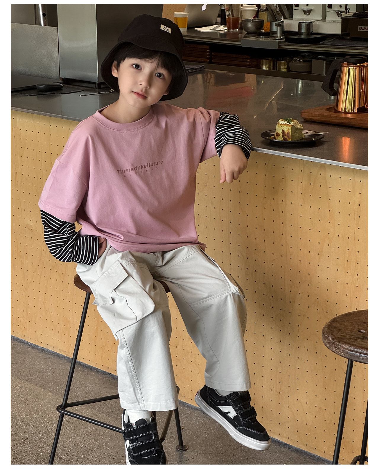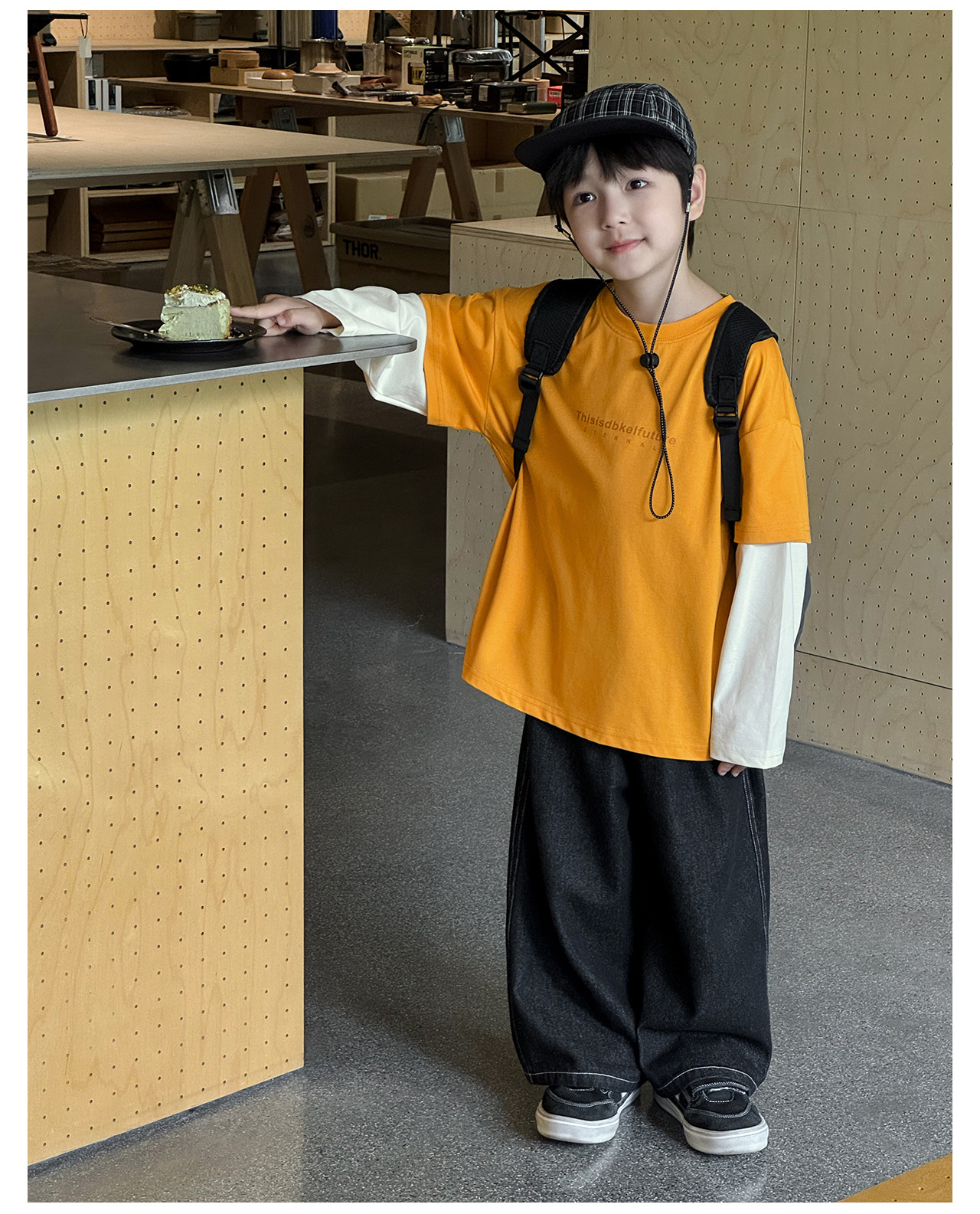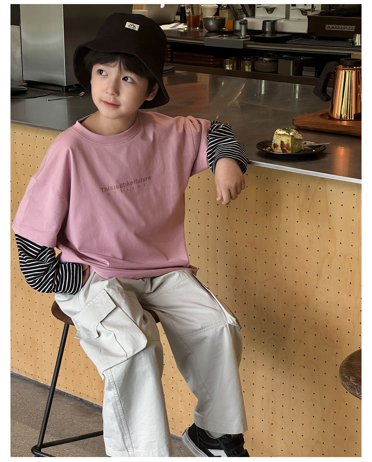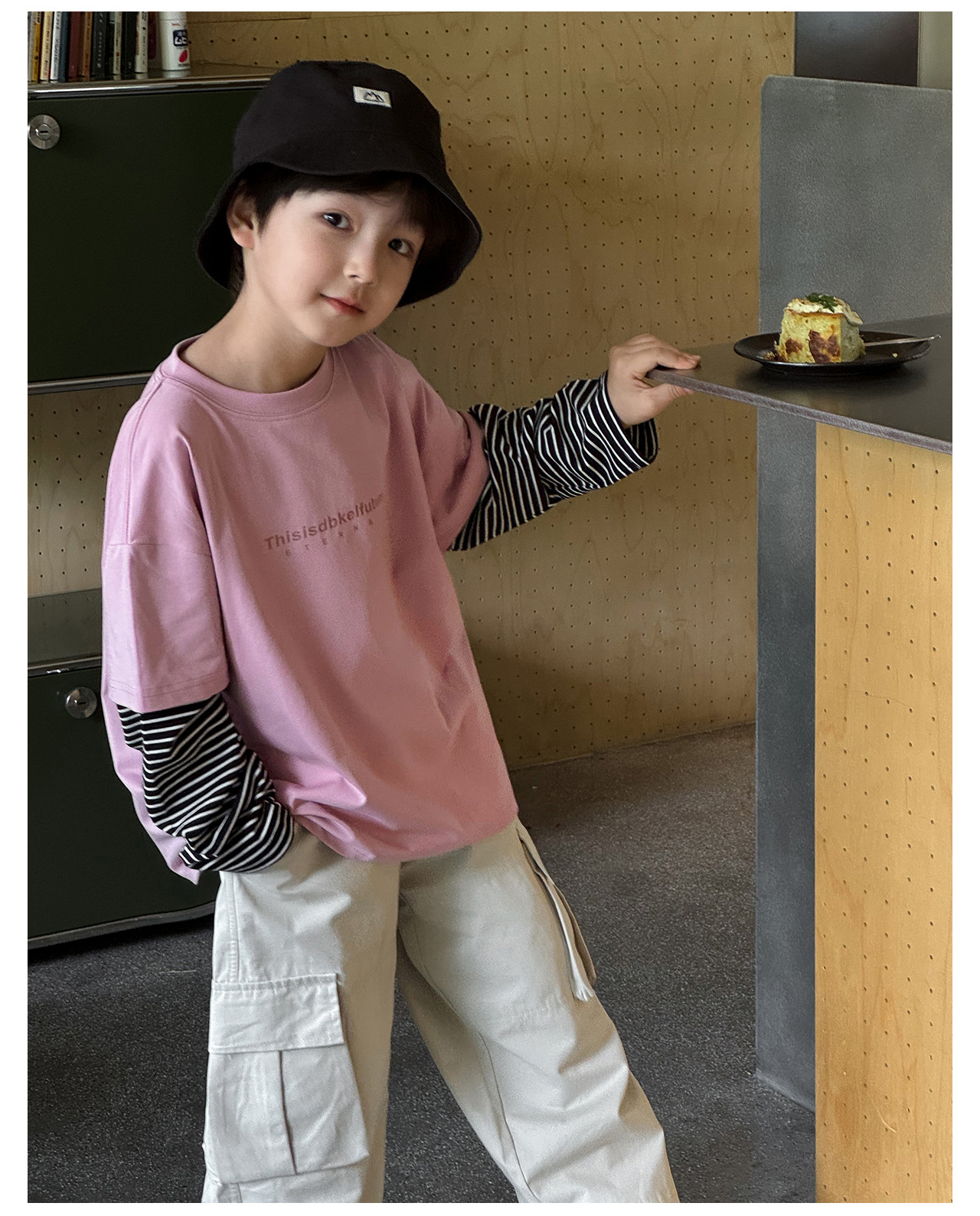 통쿠2026 남아용 봄 스타일 호주 직조리 아동복 트렌디한 레터 프린트 페이크 투피스 루즈핏 아동 티셔츠 멋짐스토어 가기