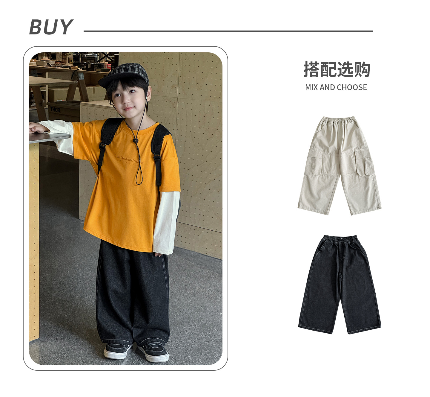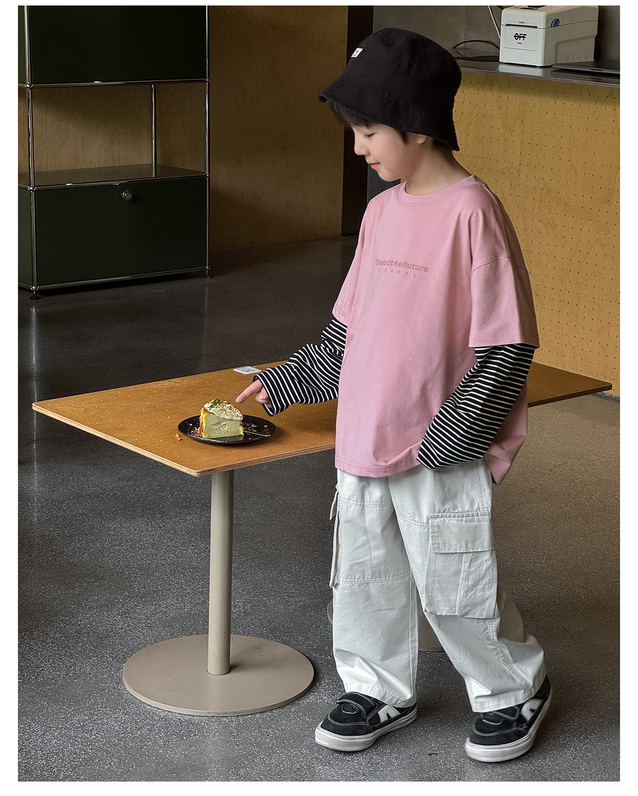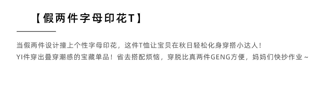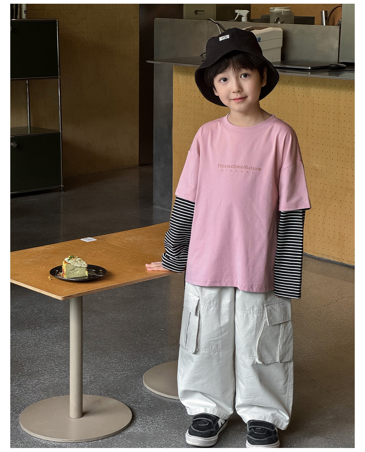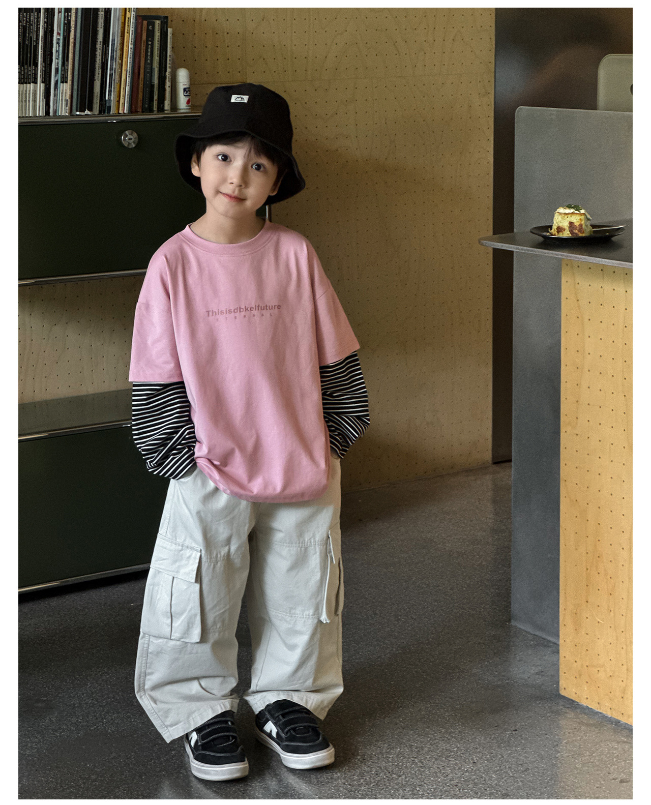 통쿠2026 남아용 봄 스타일 호주 직조리 아동복 트렌디한 레터 프린트 페이크 투피스 루즈핏 아동 티셔츠 멋짐스토어 가기