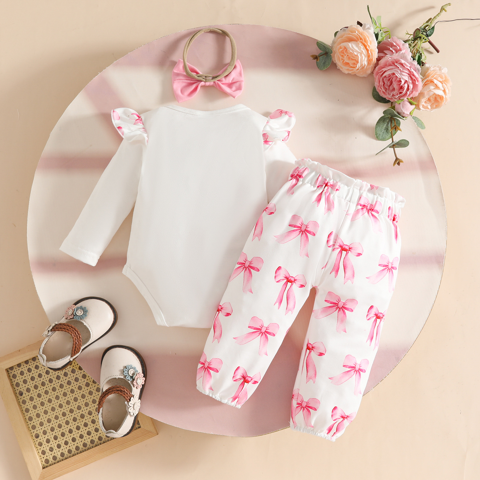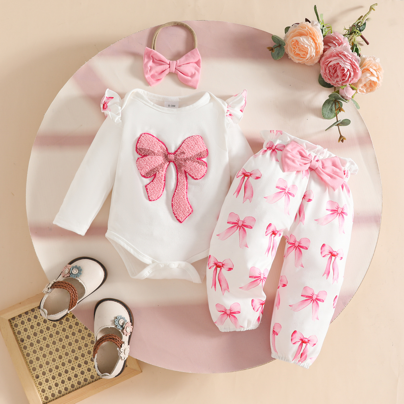 아마존 유아용 긴팔 긴바지 세트 0-1세 여아용 리본 타월 자수 바디수트와 긴바지, 헤어밴드