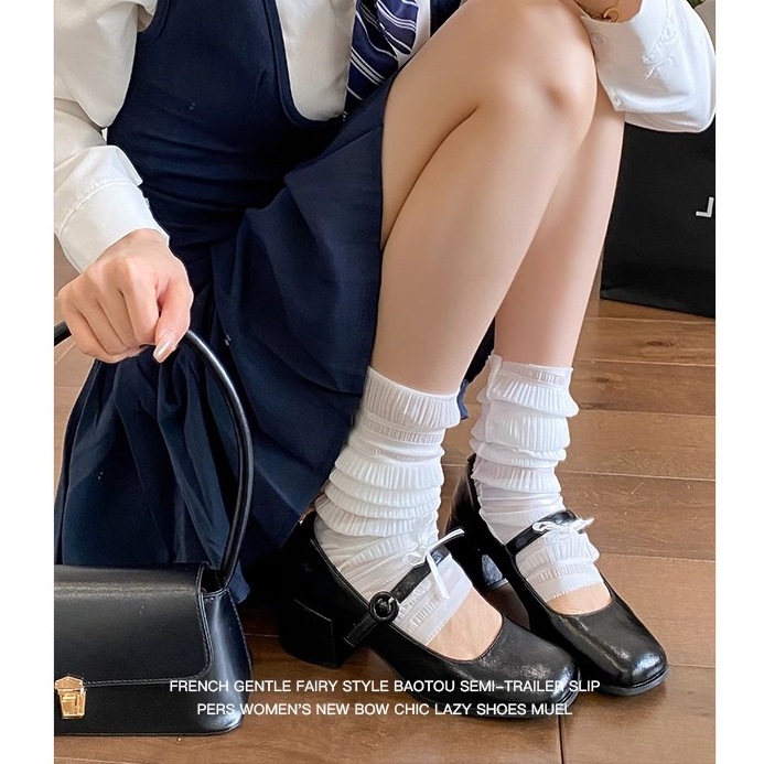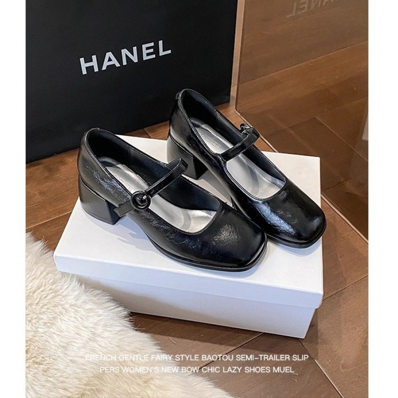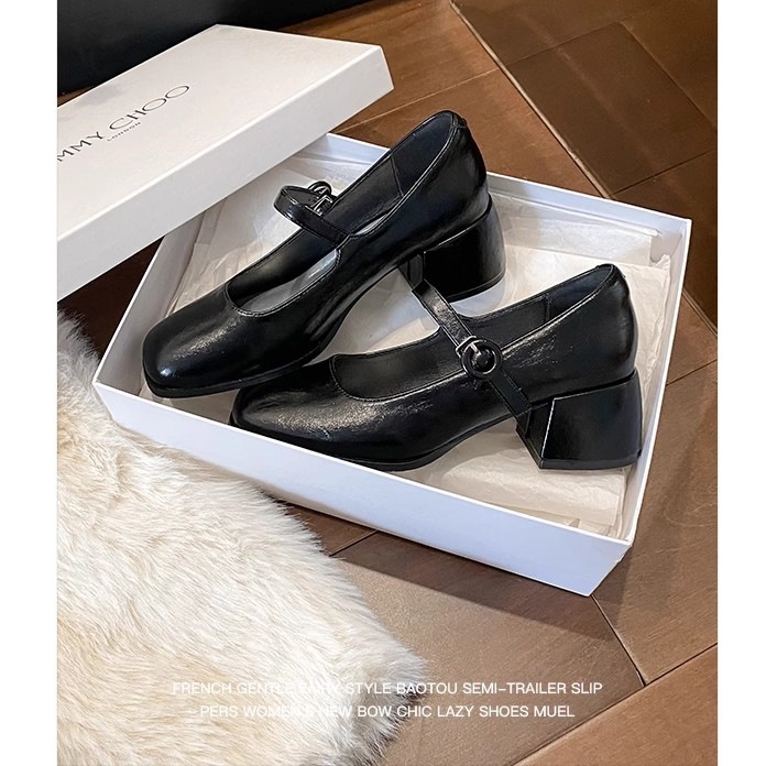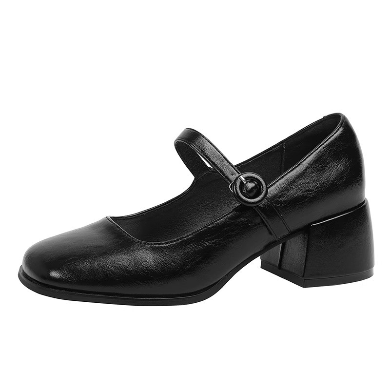소가죽 버전 ~ 블랙 메리제인 슈즈 두꺼운 굽 프렌치 햅번 스타일 작은 가죽 신발 복고풍 여성 신발 하이힐 스퀘어 토 슈즈