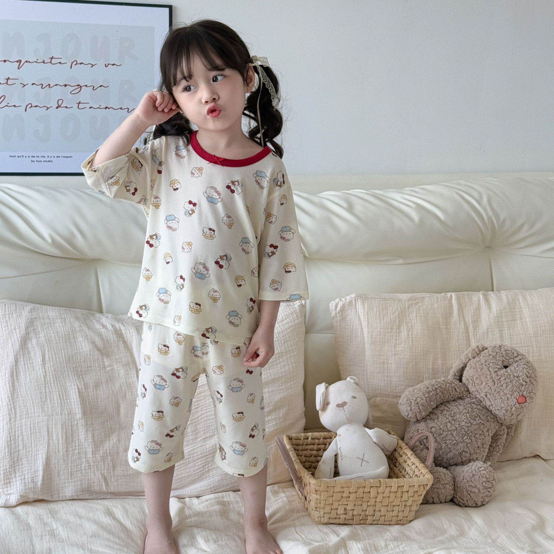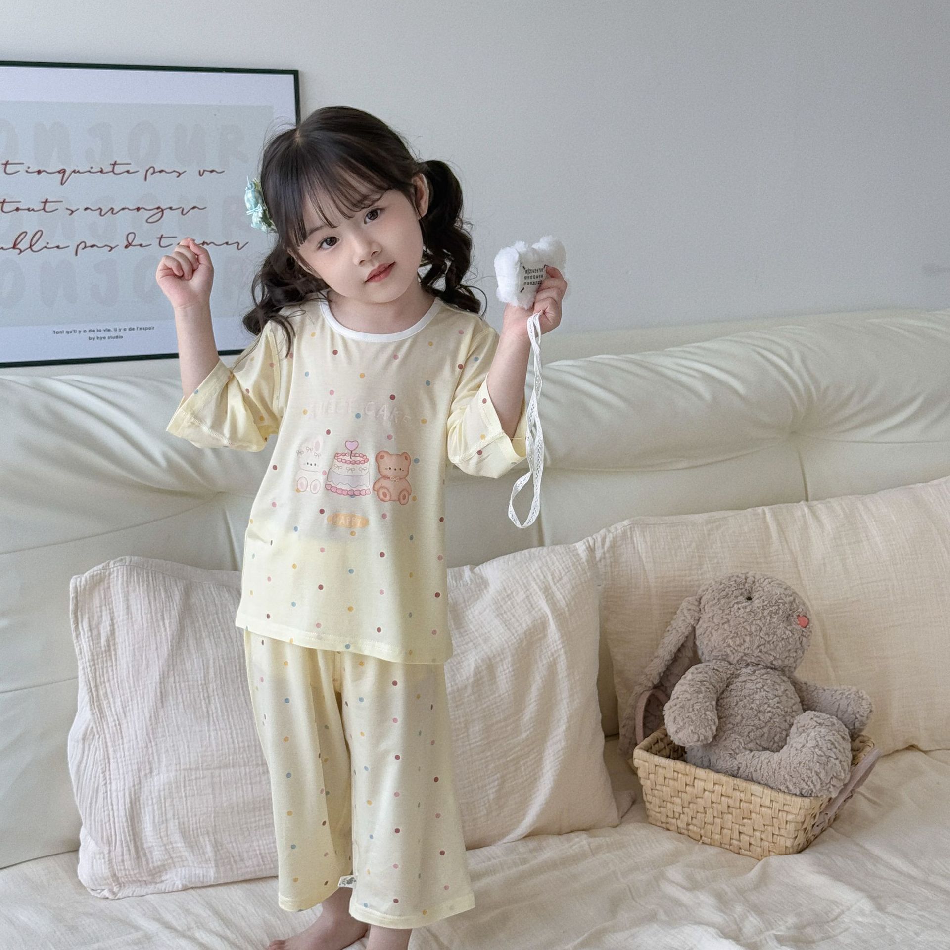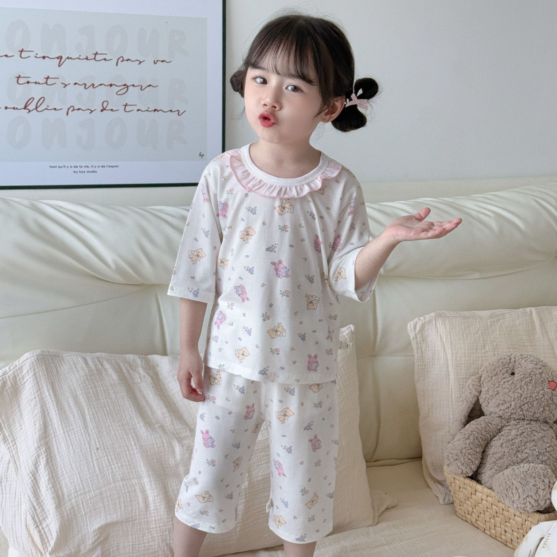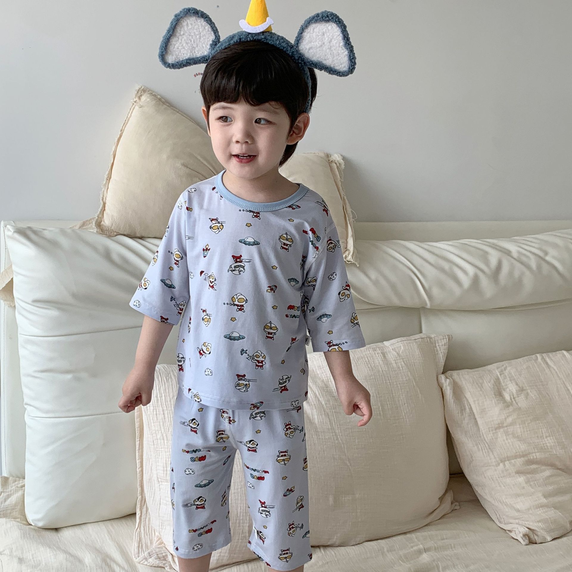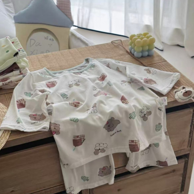 여름 아동복 세트, 남아용 7부소매 얇은 잠옷, 여아용 텐셀 통기성 에어컨 의류스토어 가기