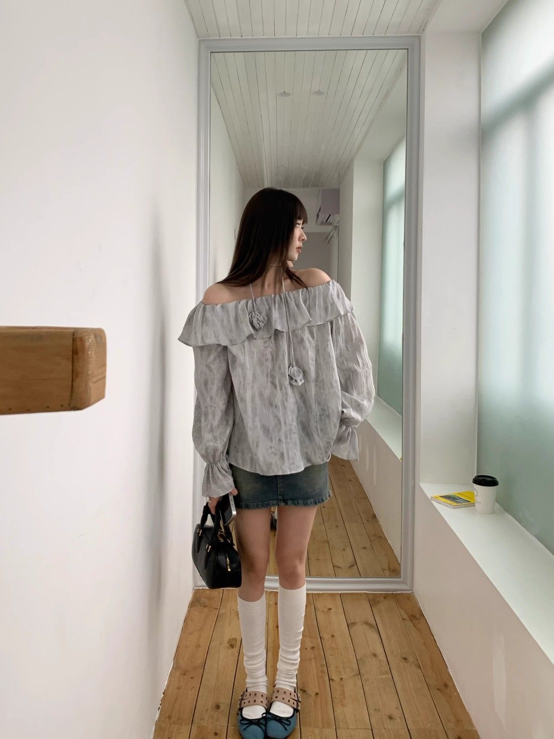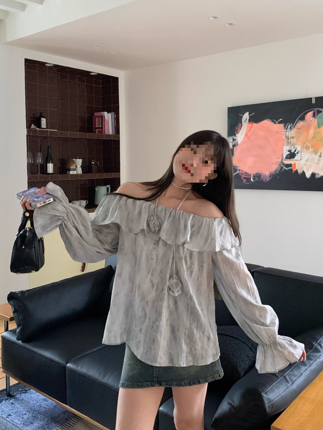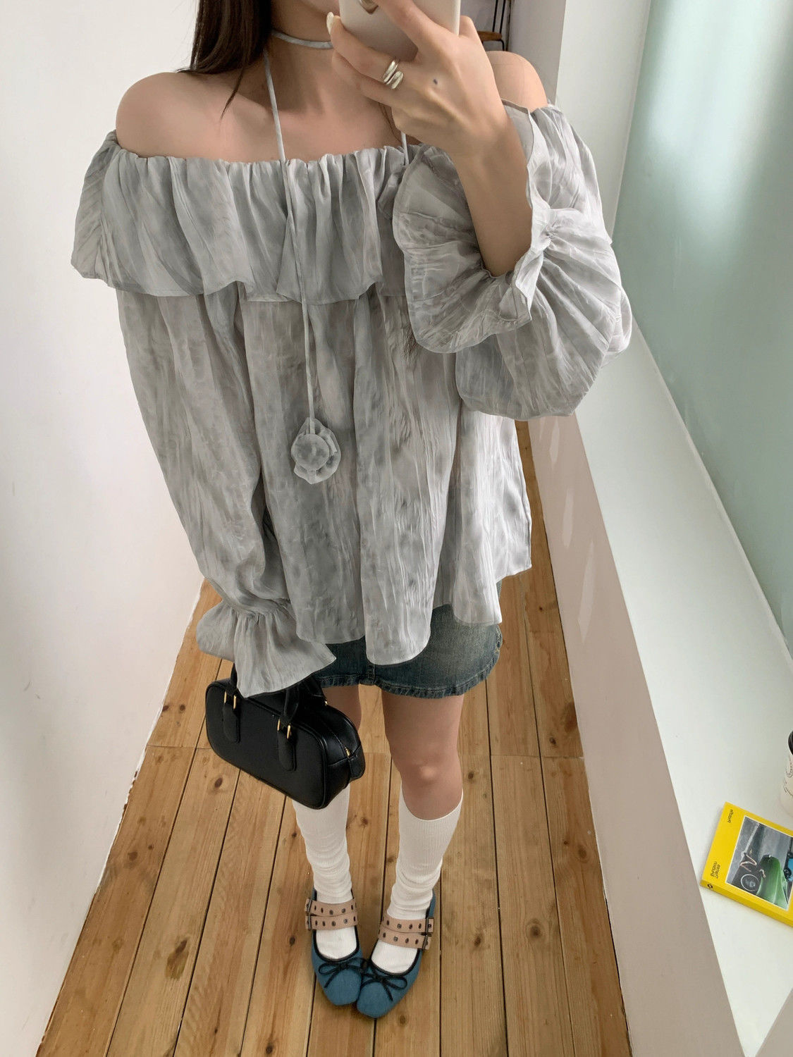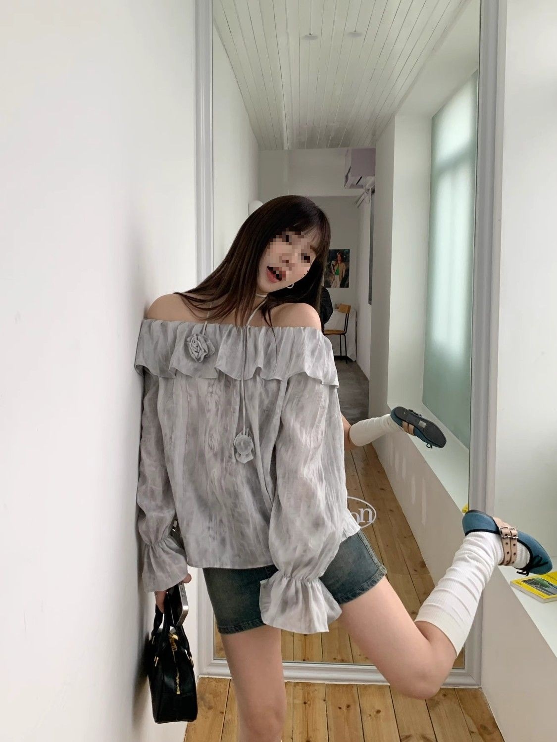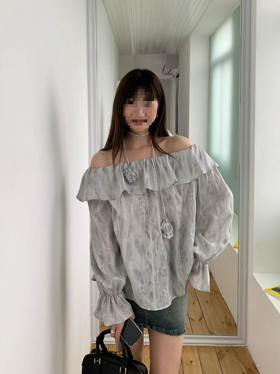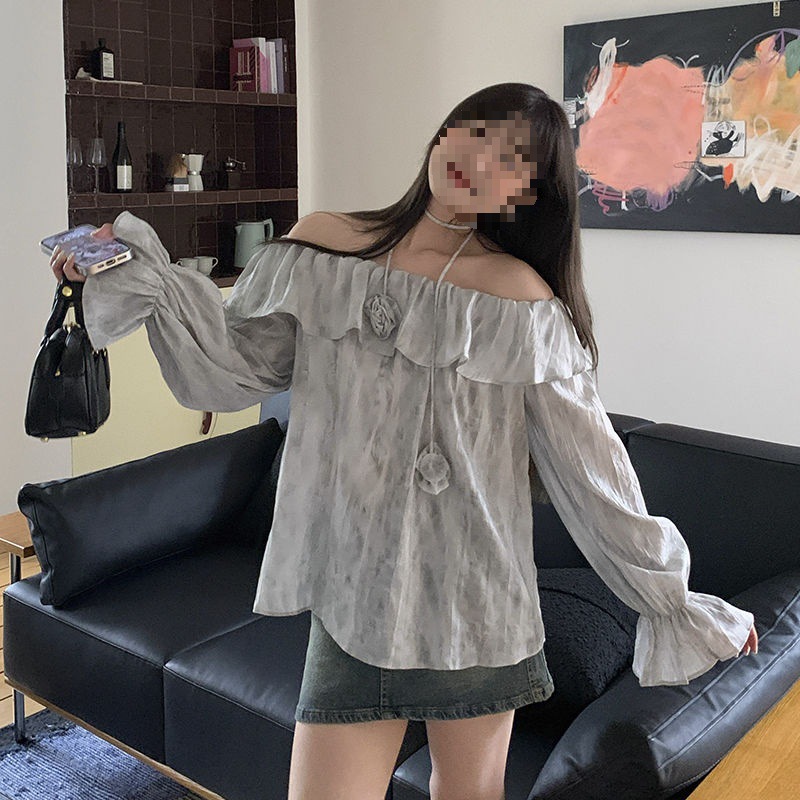 2025 신상 한국 원숄더 쉬폰 러플 스위트 프렌치 레트로 셔츠 타이다이 작은 꽃무늬 탑스토어 가기