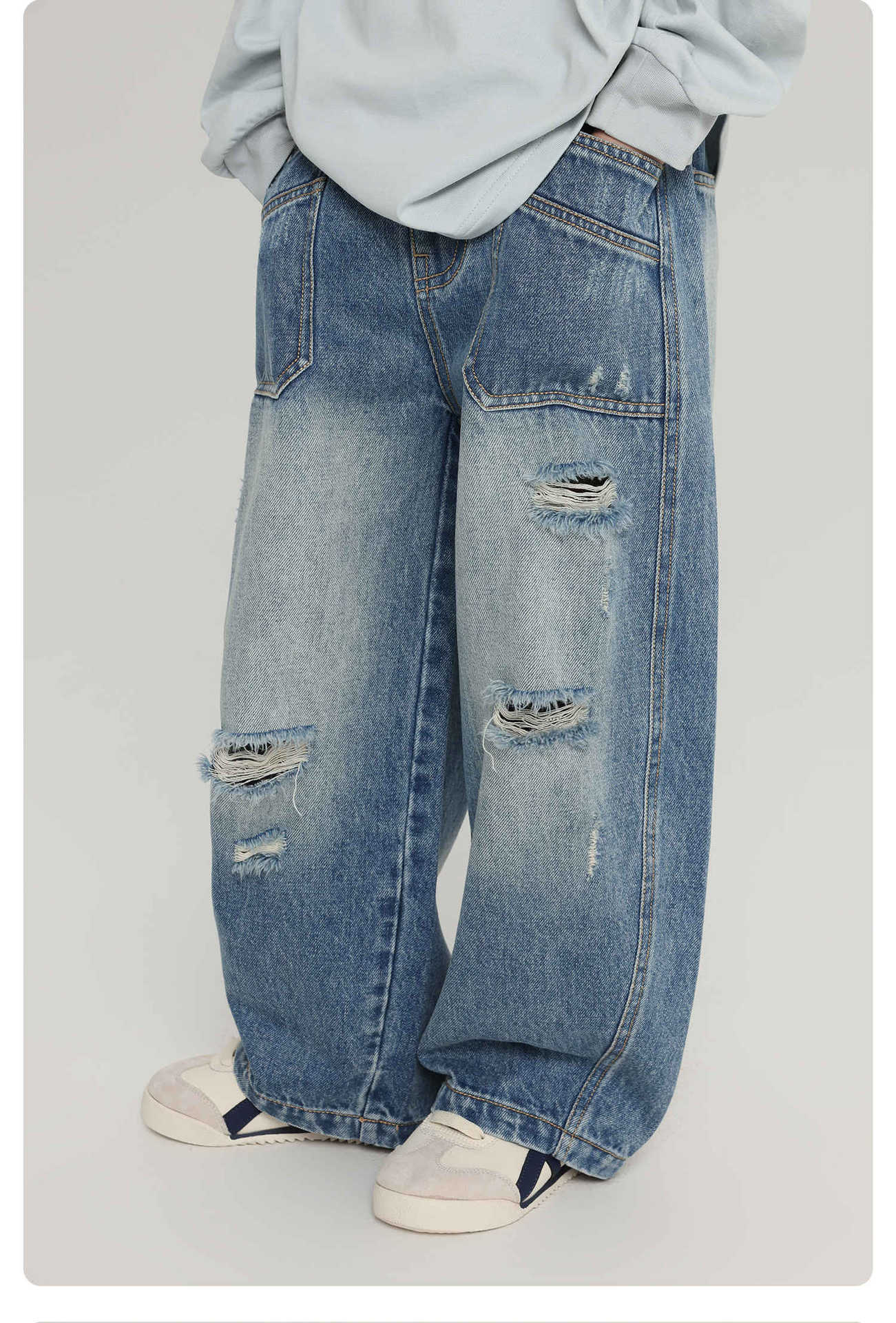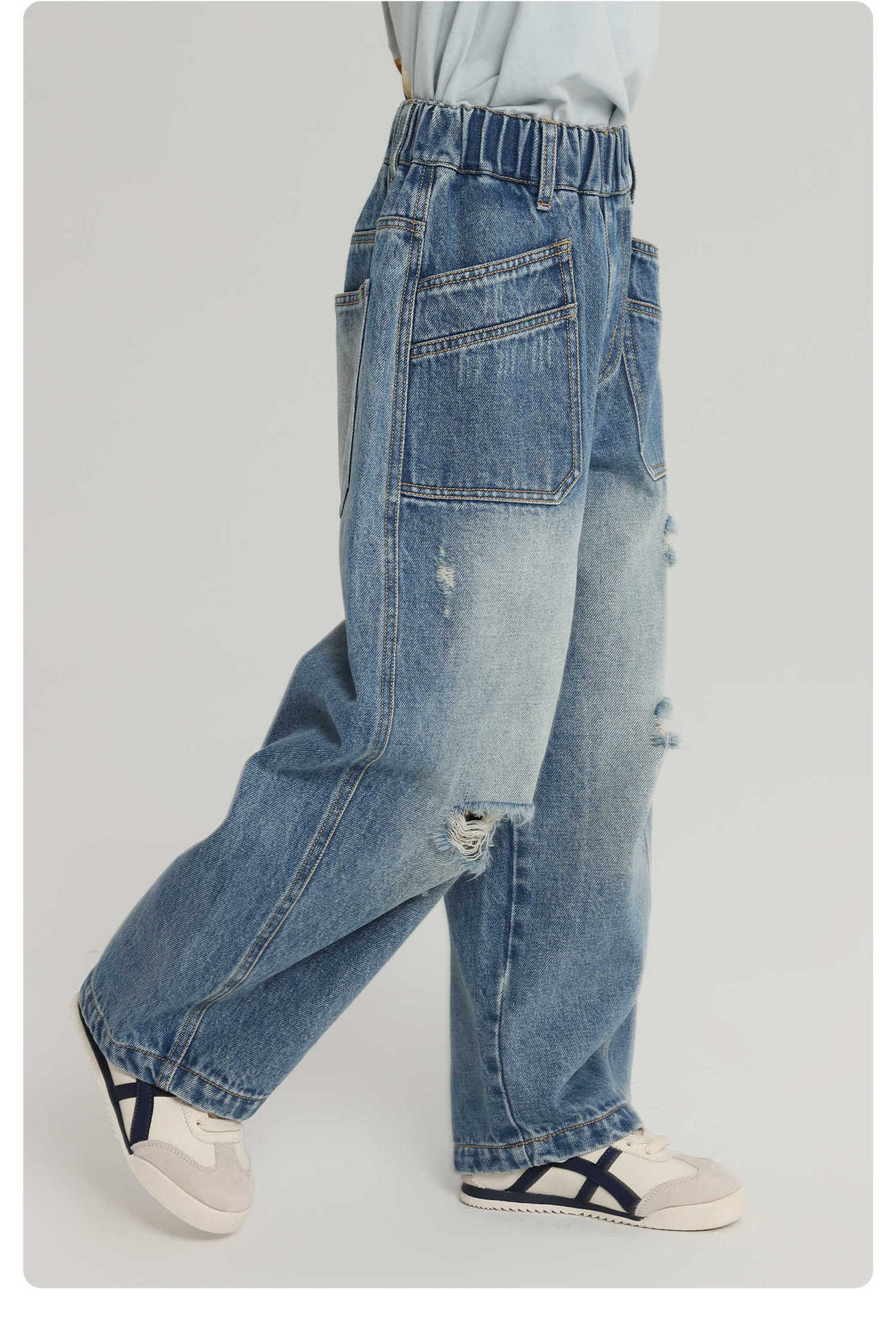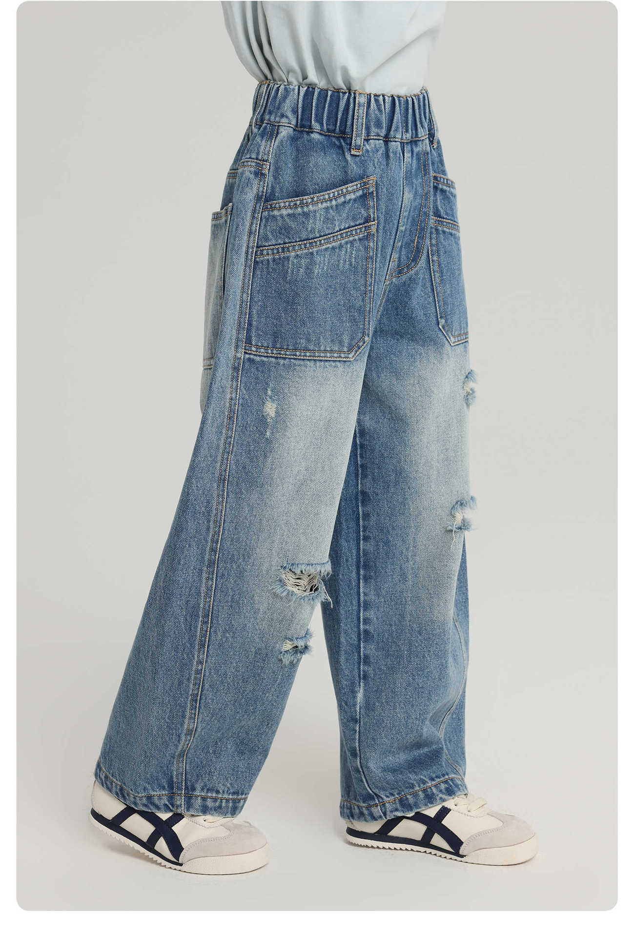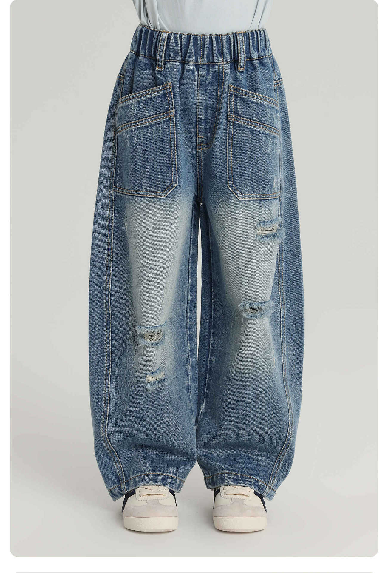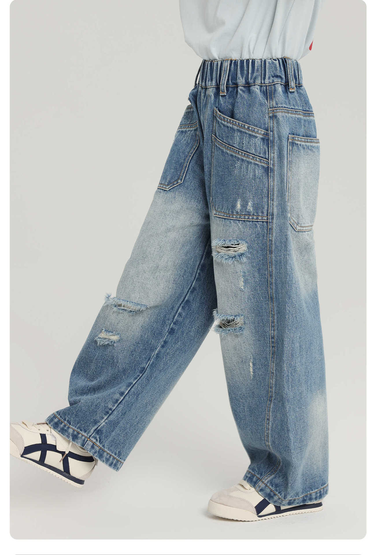 푸딩 하루 아동 청바지 2025 가을 신작 여아 찢어진 청바지 루즈한 와이드 레그 바지스토어 가기