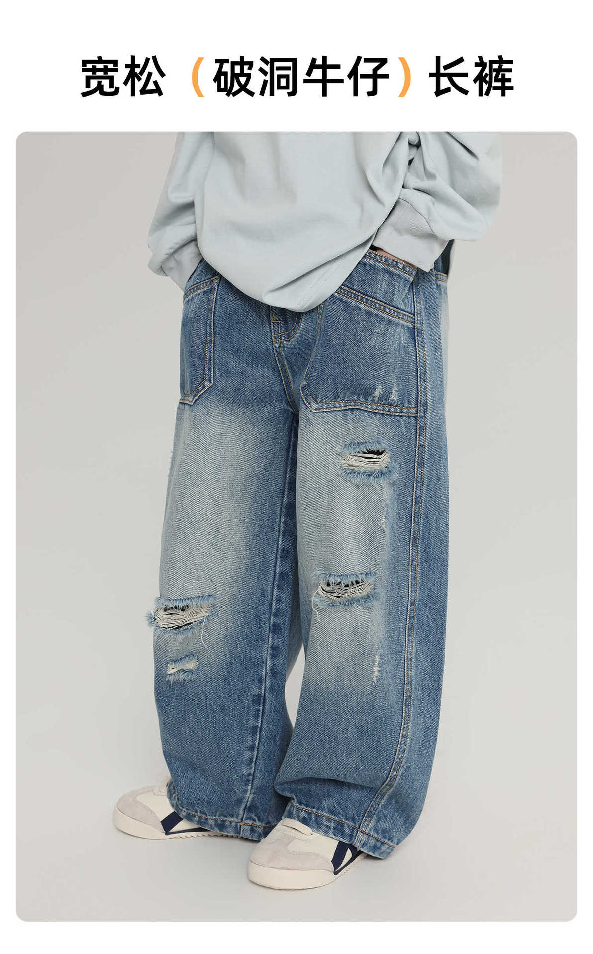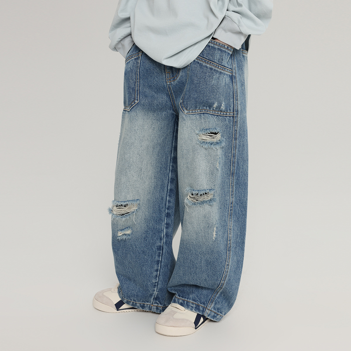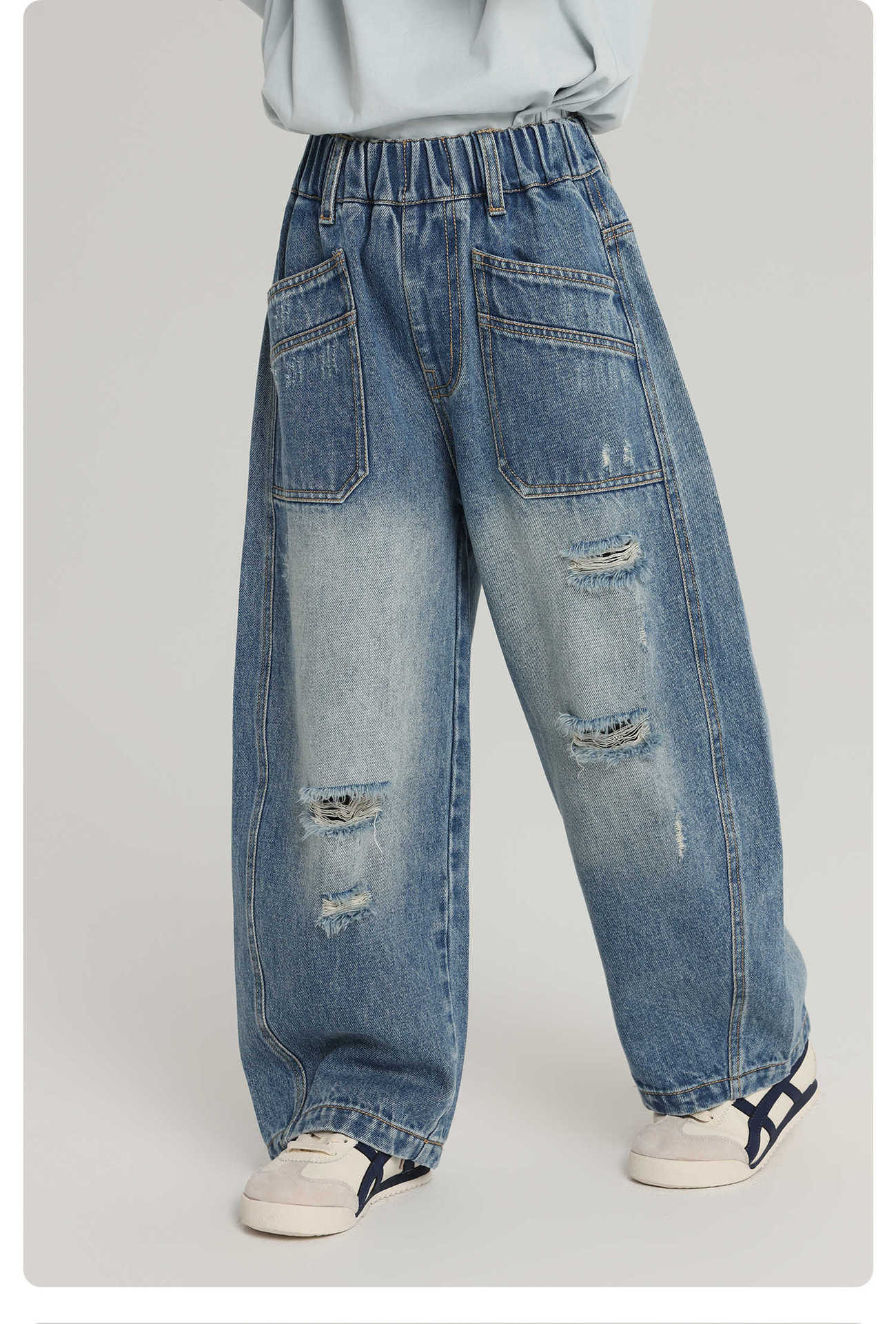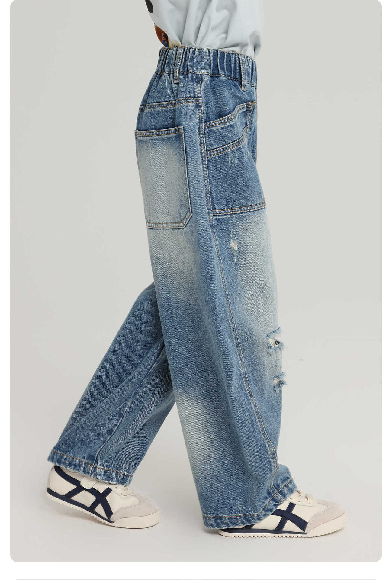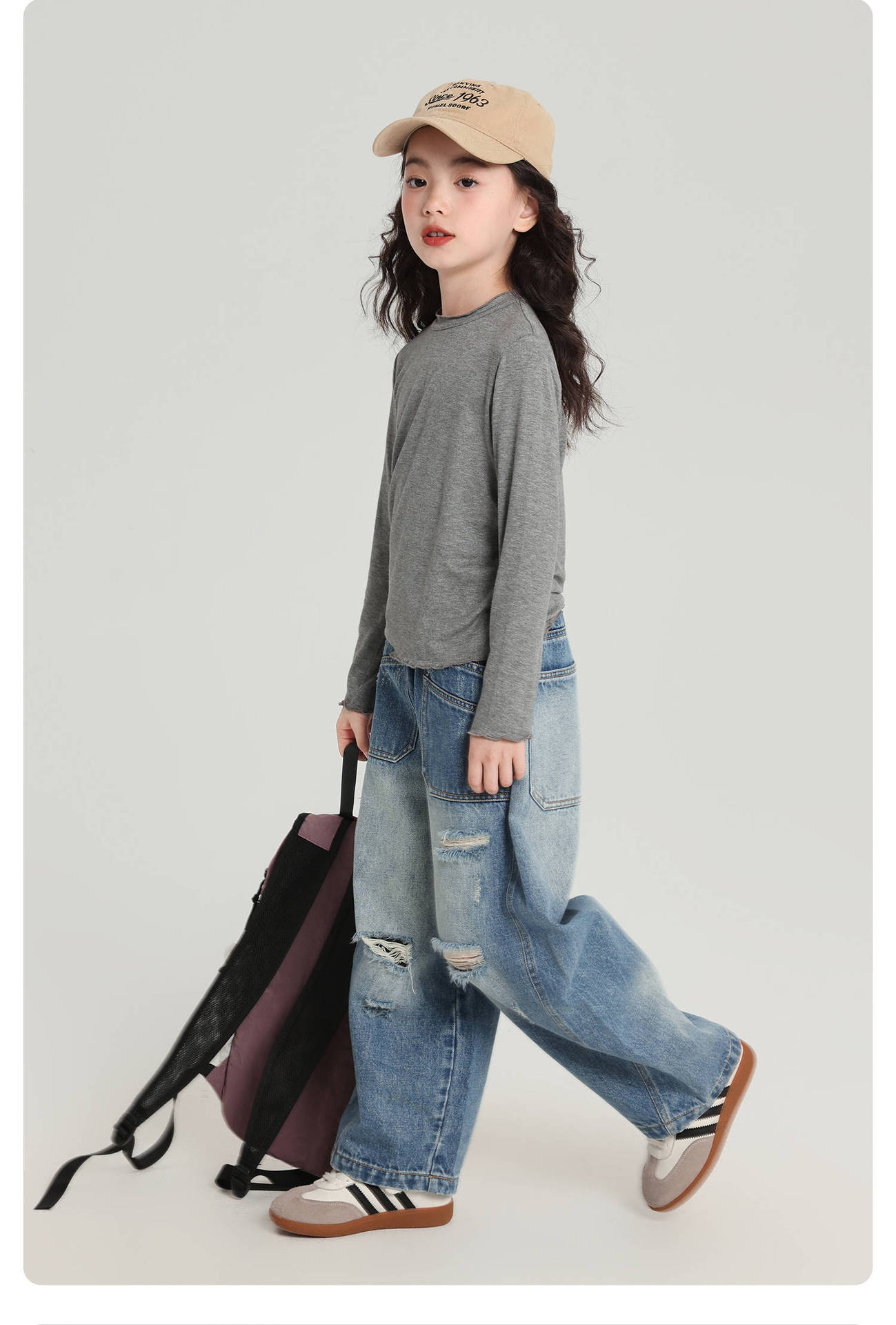 푸딩 하루 아동 청바지 2025 가을 신작 여아 찢어진 청바지 루즈한 와이드 레그 바지스토어 가기