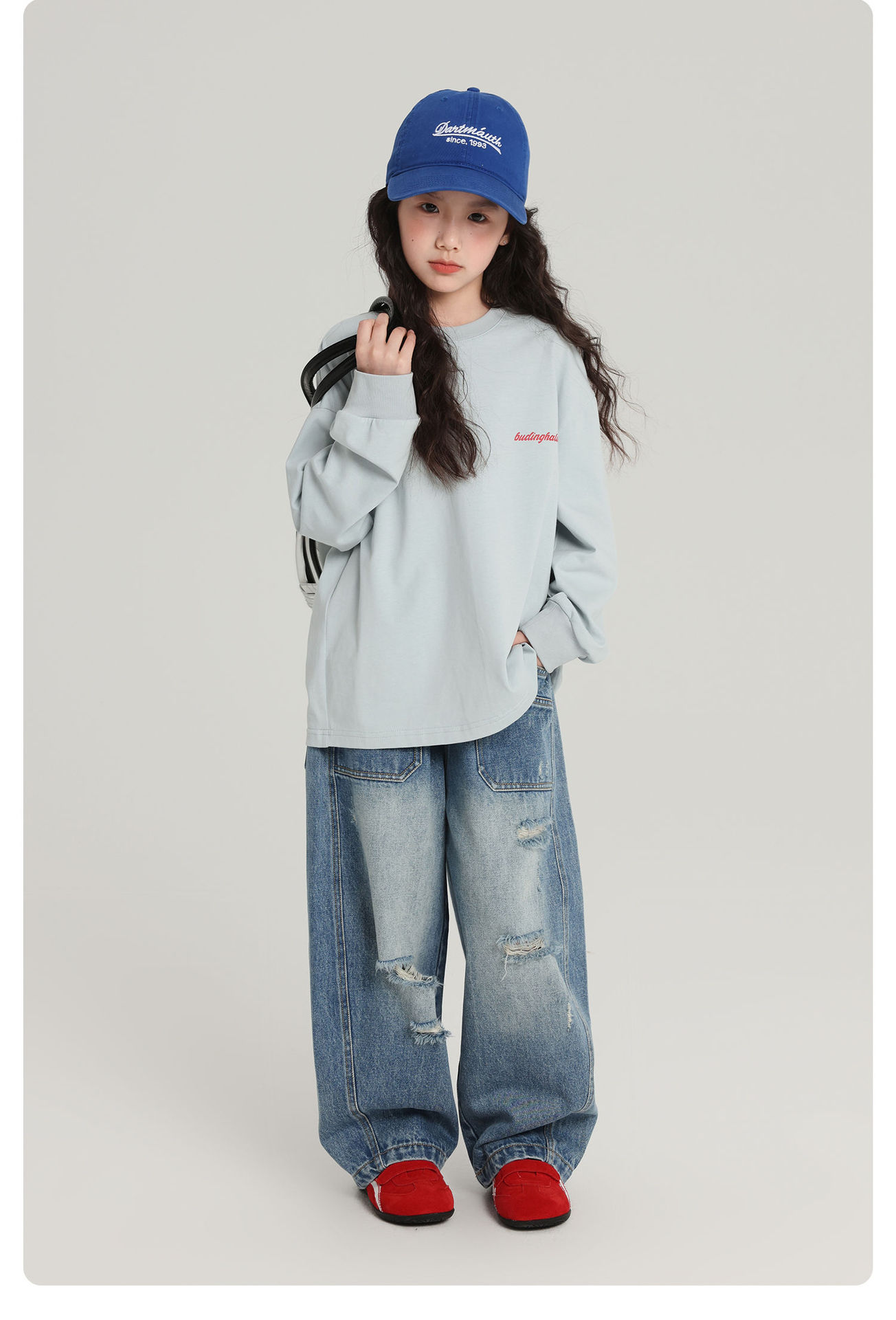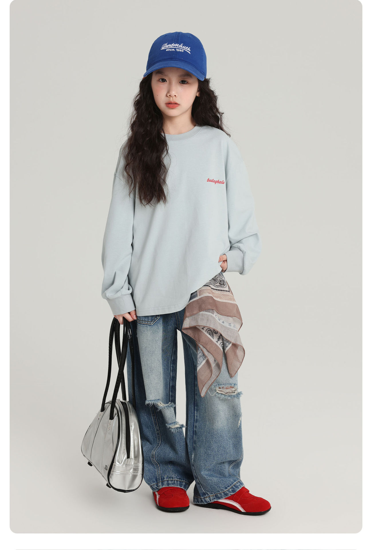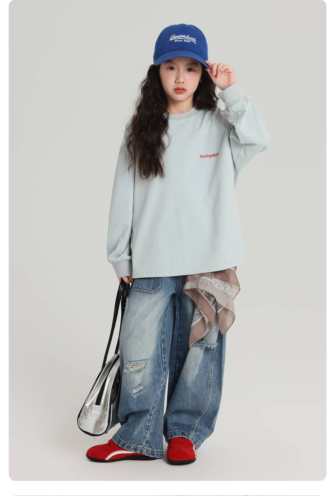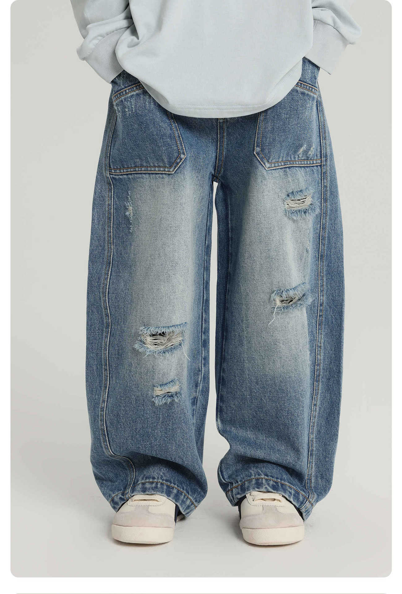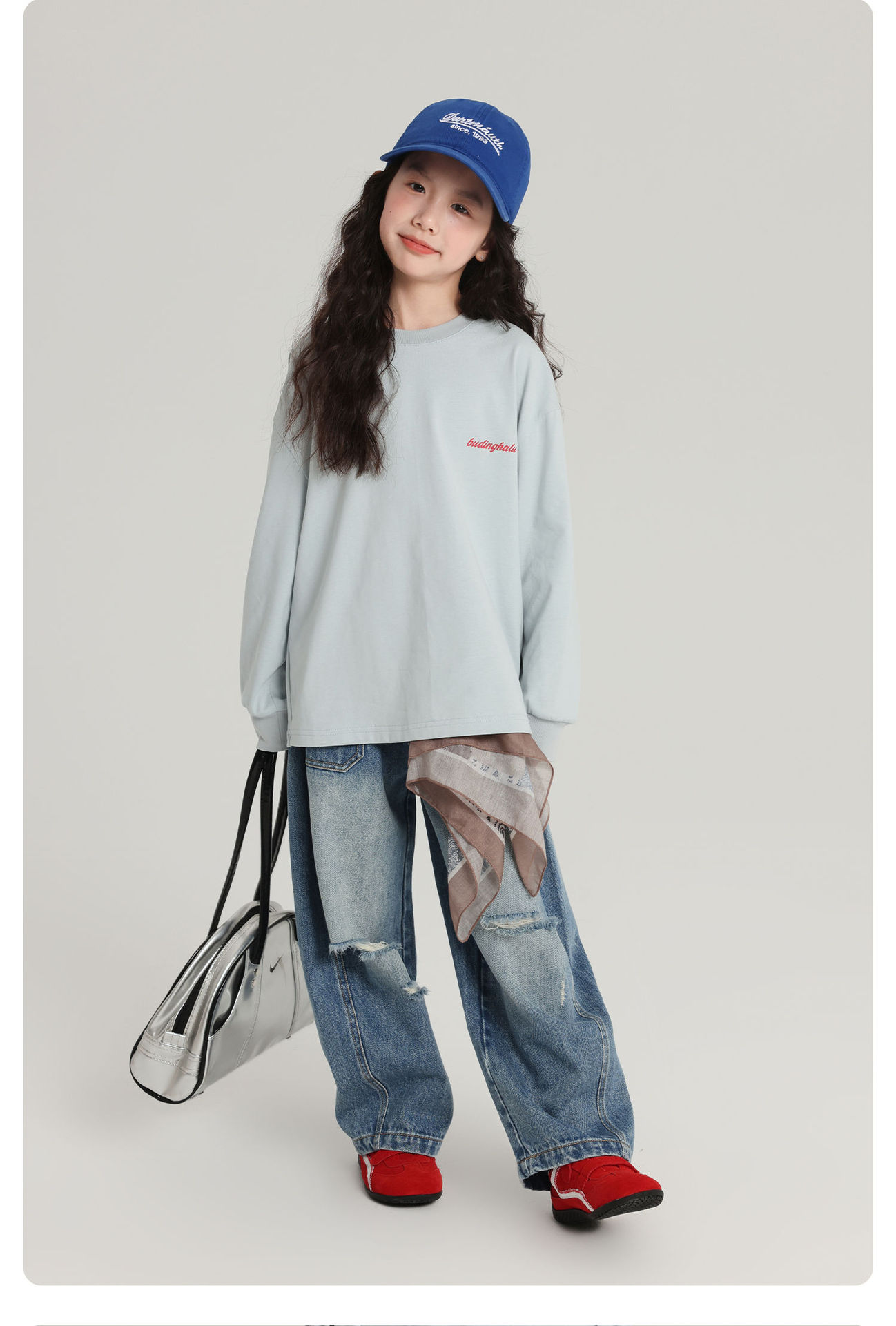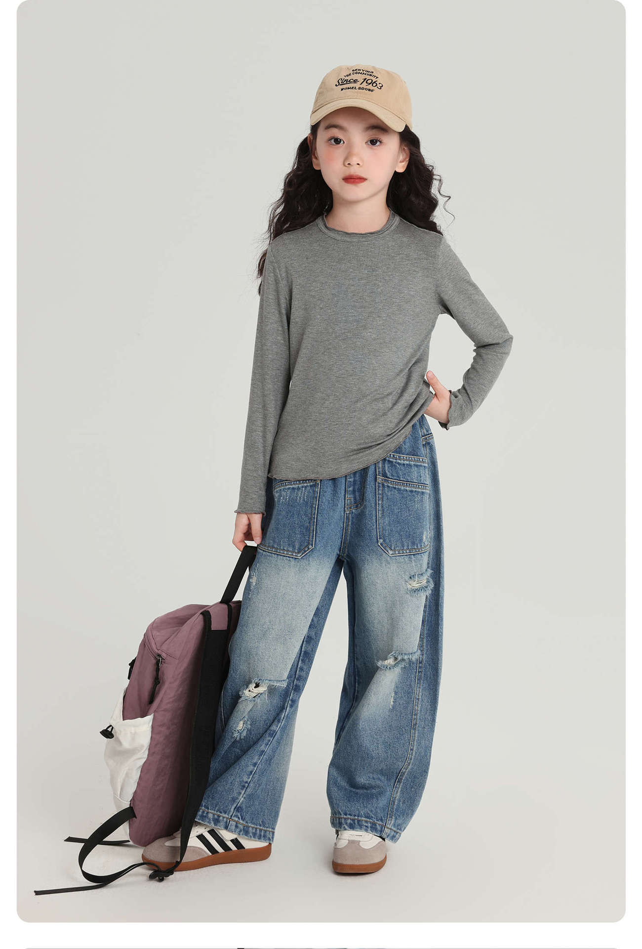 푸딩 하루 아동 청바지 2025 가을 신작 여아 찢어진 청바지 루즈한 와이드 레그 바지스토어 가기