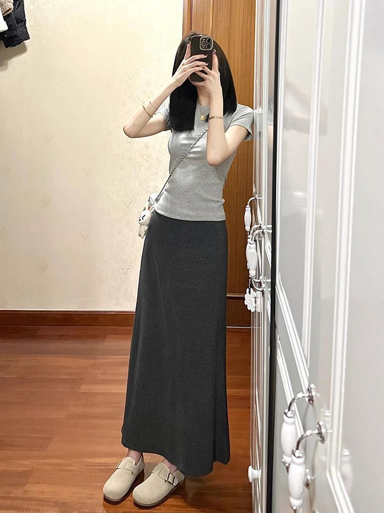 그레이 오른쪽 어깨 반팔 탑 투피스 여름 여성 신작 솔트 스타일 가볍고 성숙한 스타일 하프 하이 웨이스트 롱 스커트스토어 가기