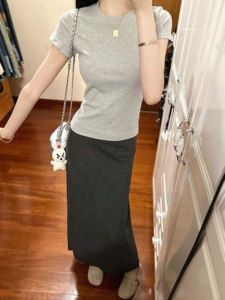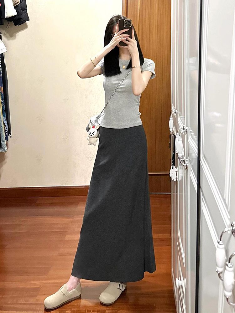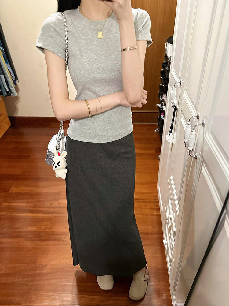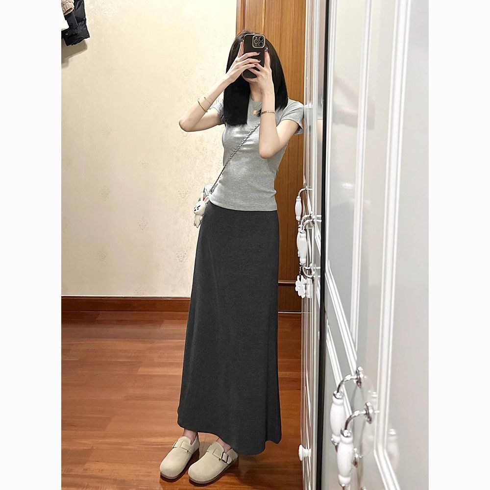 그레이 오른쪽 어깨 반팔 탑 투피스 여름 여성 신작 솔트 스타일 가볍고 성숙한 스타일 하프 하이 웨이스트 롱 스커트