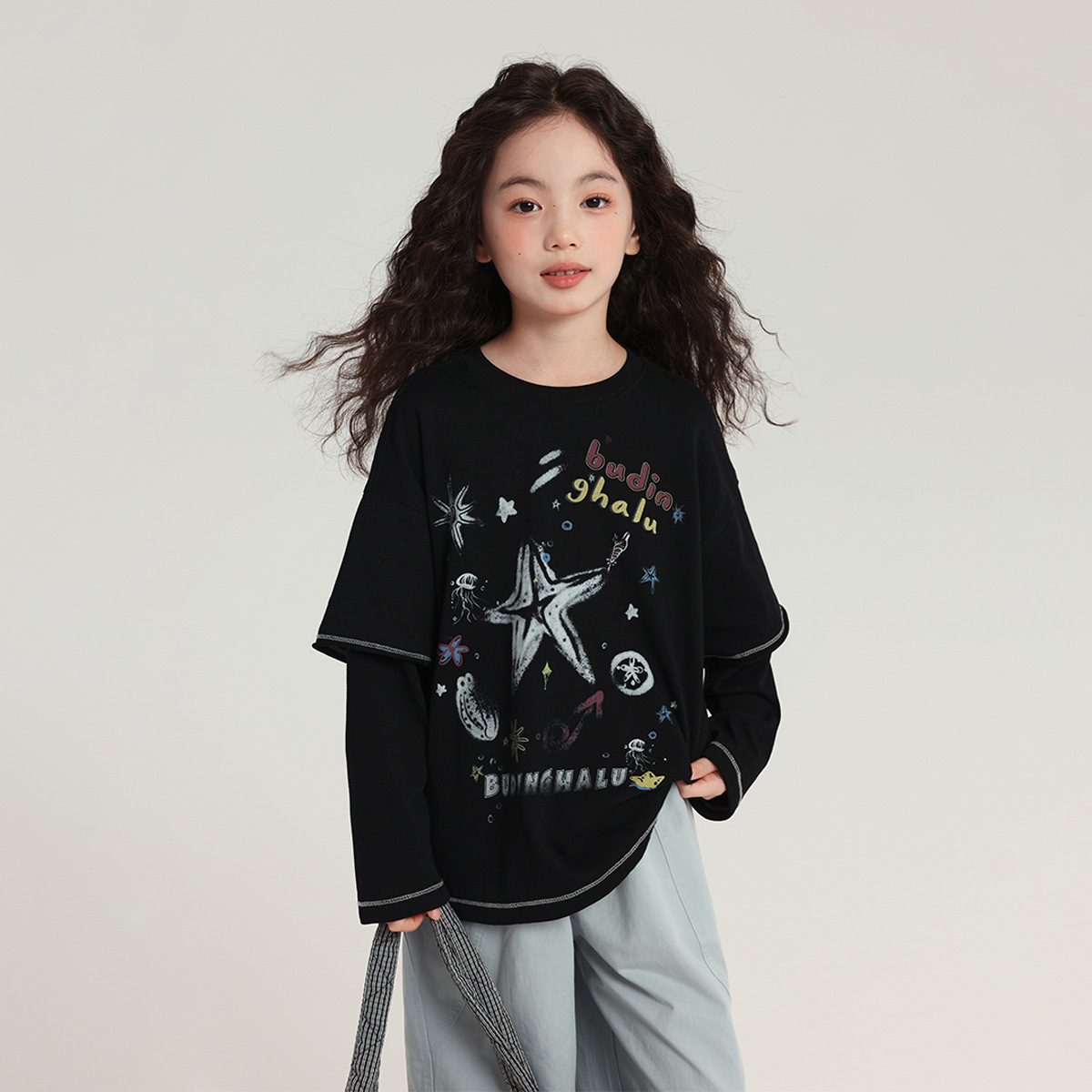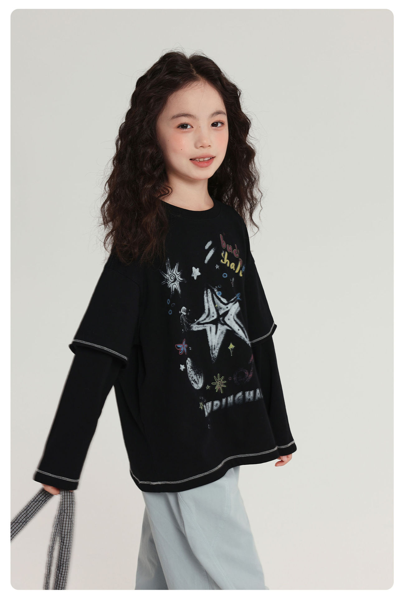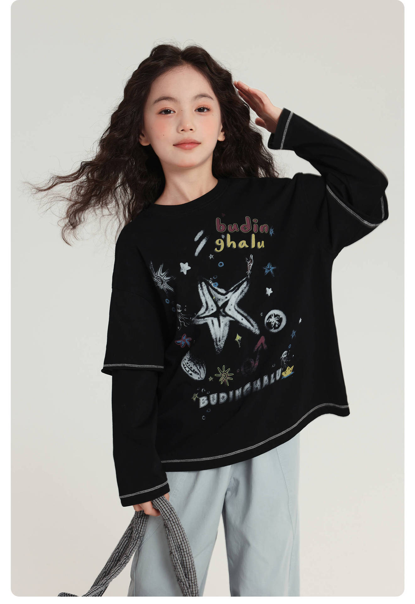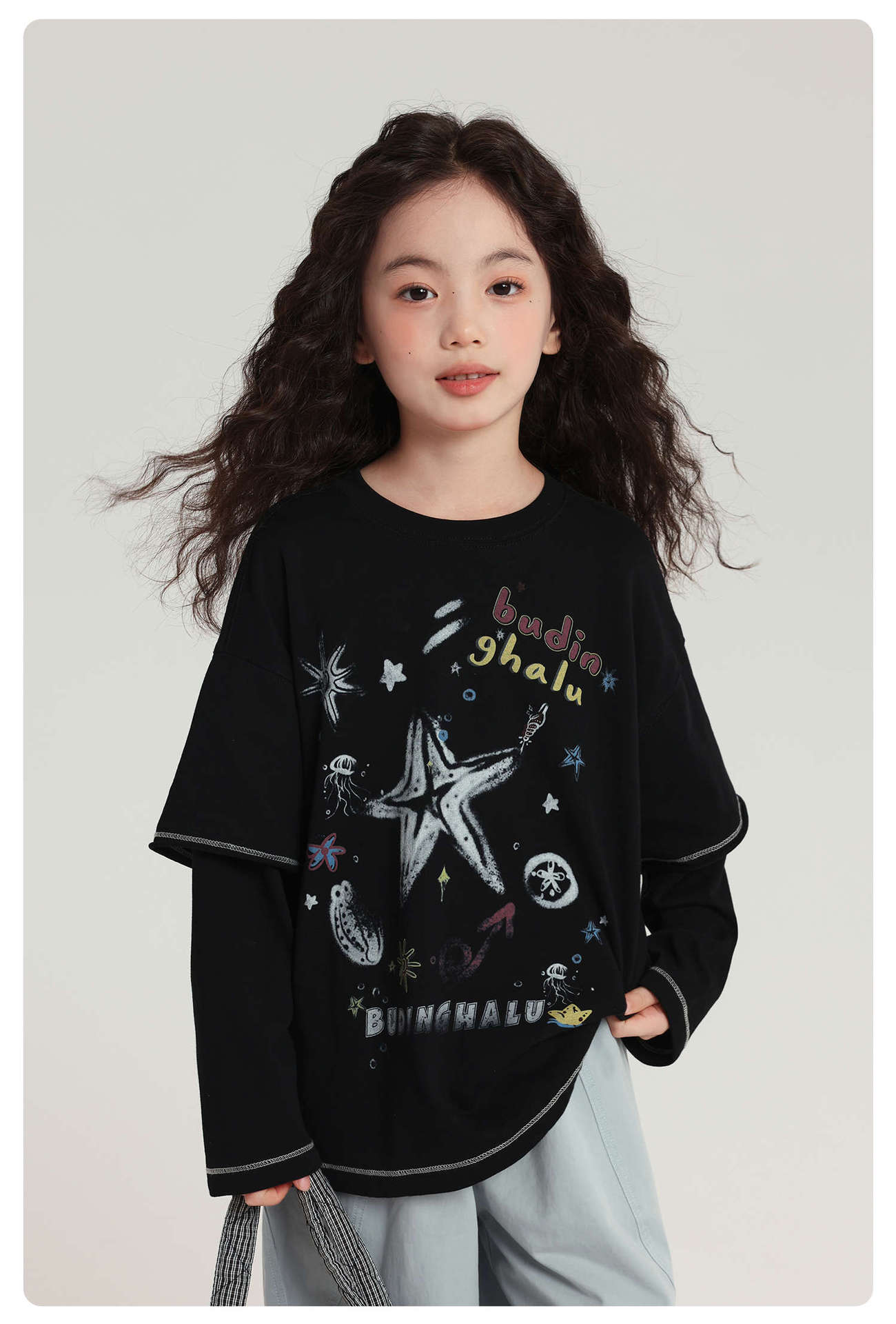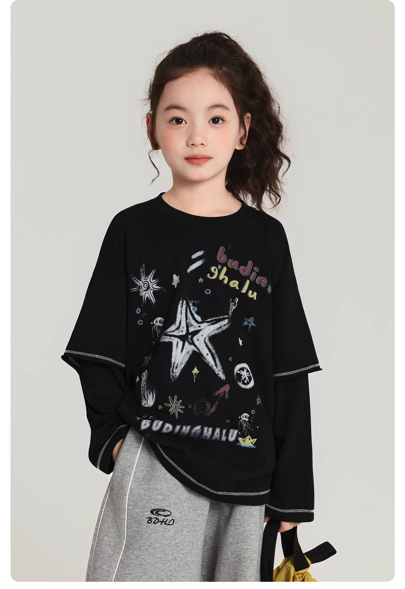 Pudding Haru 2025 새로운 가을 어린이 낙서 가짜 투피스 소녀 긴팔 티셔츠 트렌디 다용도 탑스토어 가기