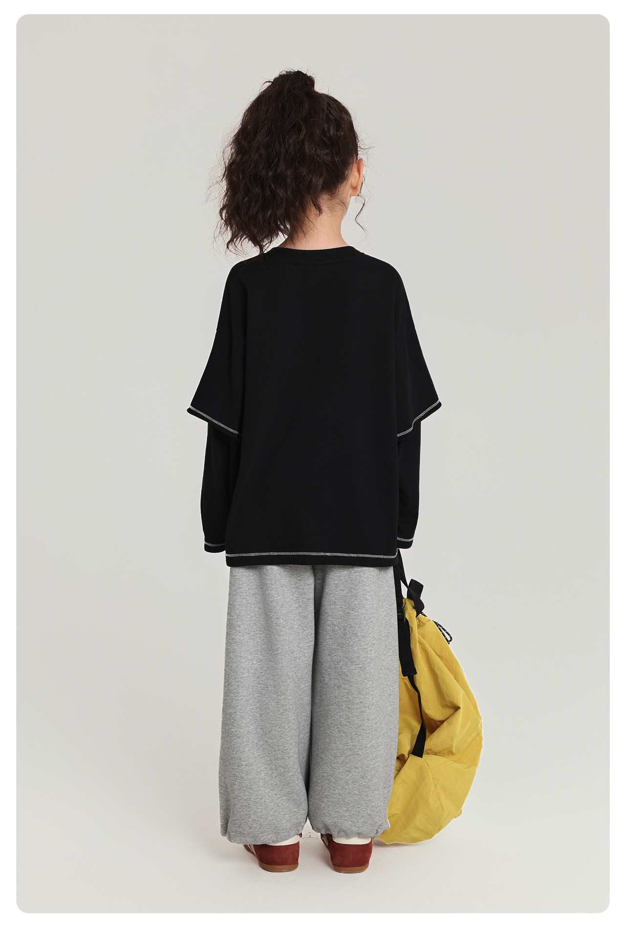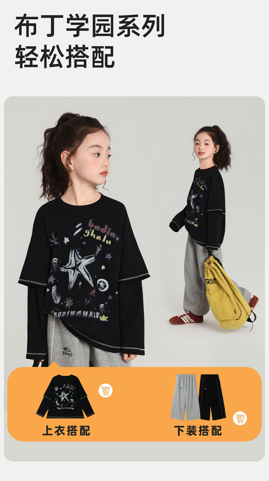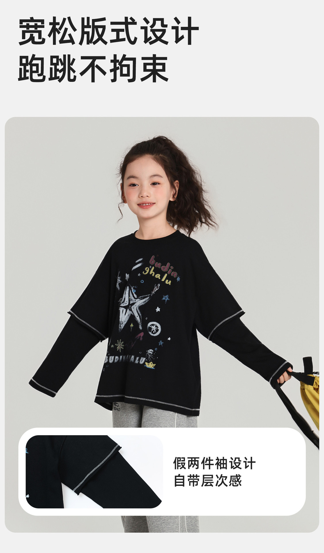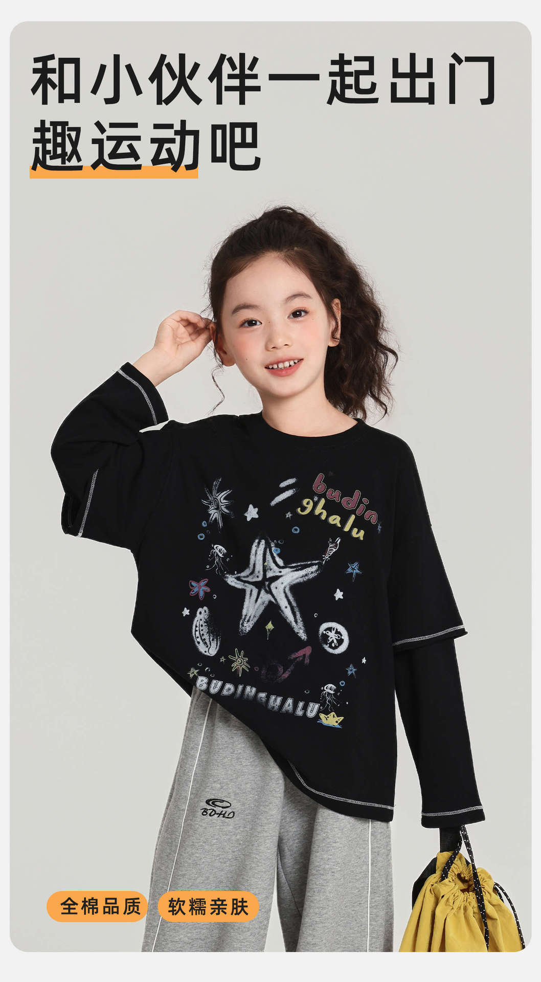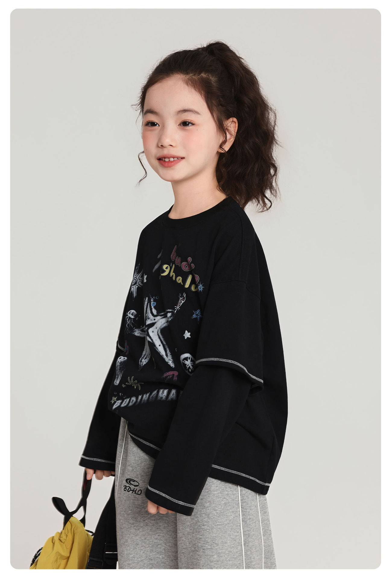 Pudding Haru 2025 새로운 가을 어린이 낙서 가짜 투피스 소녀 긴팔 티셔츠 트렌디 다용도 탑스토어 가기