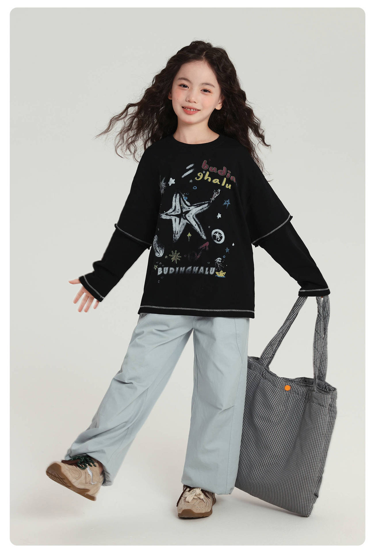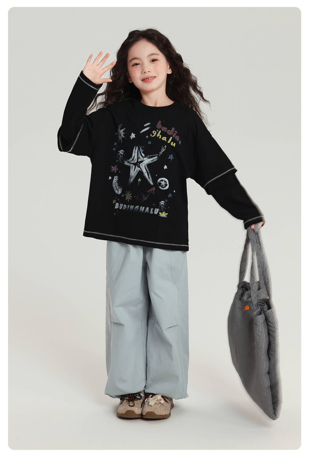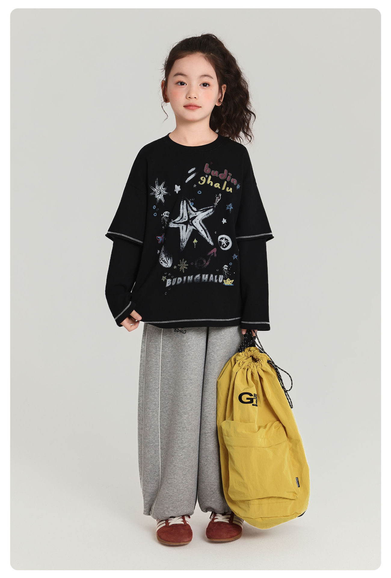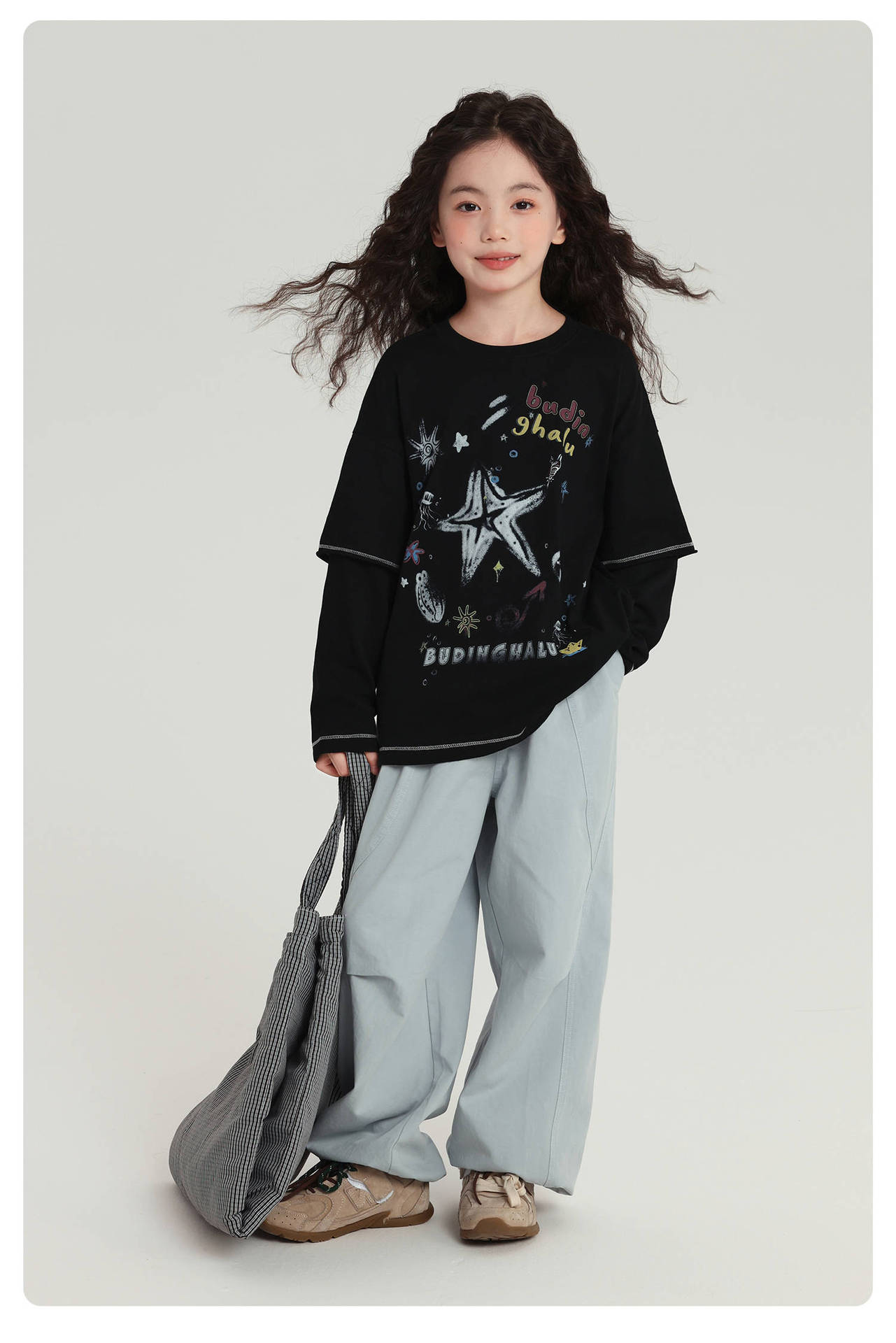 Pudding Haru 2025 새로운 가을 어린이 낙서 가짜 투피스 소녀 긴팔 티셔츠 트렌디 다용도 탑