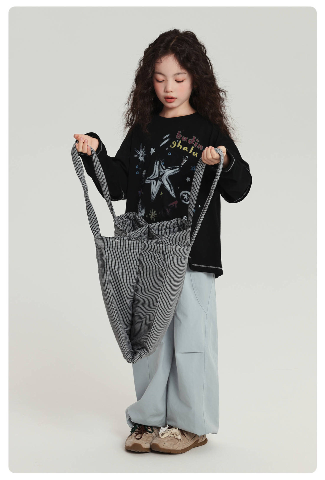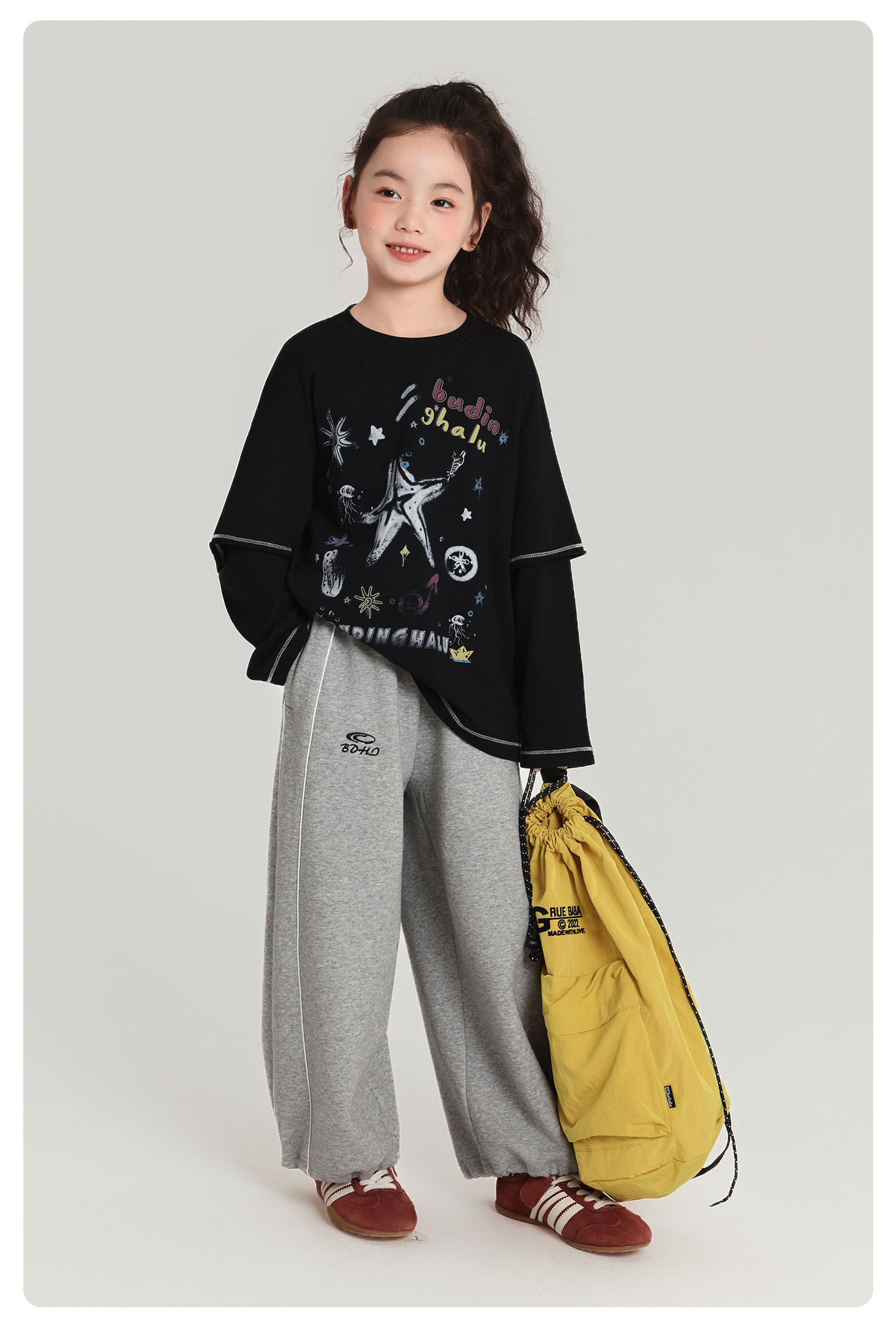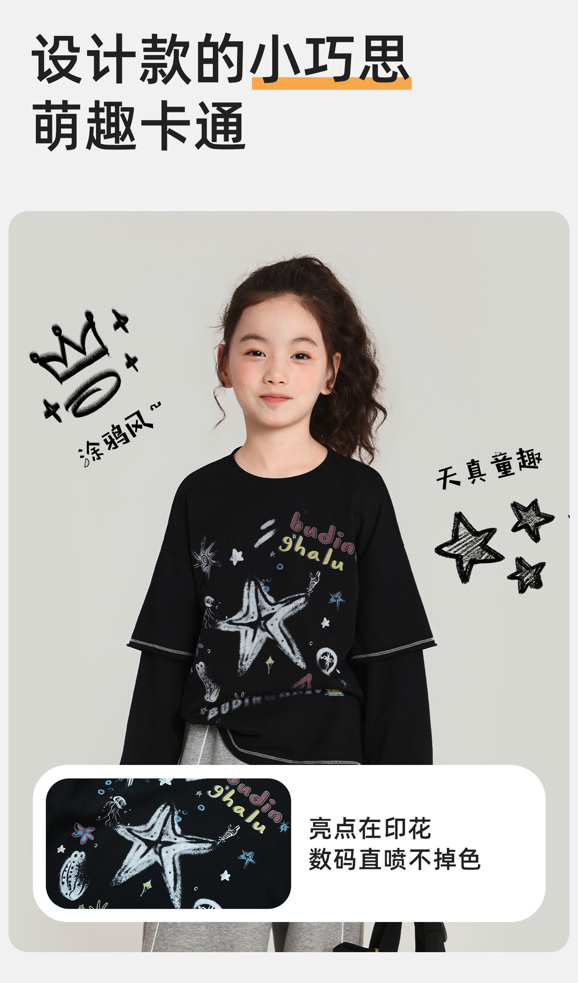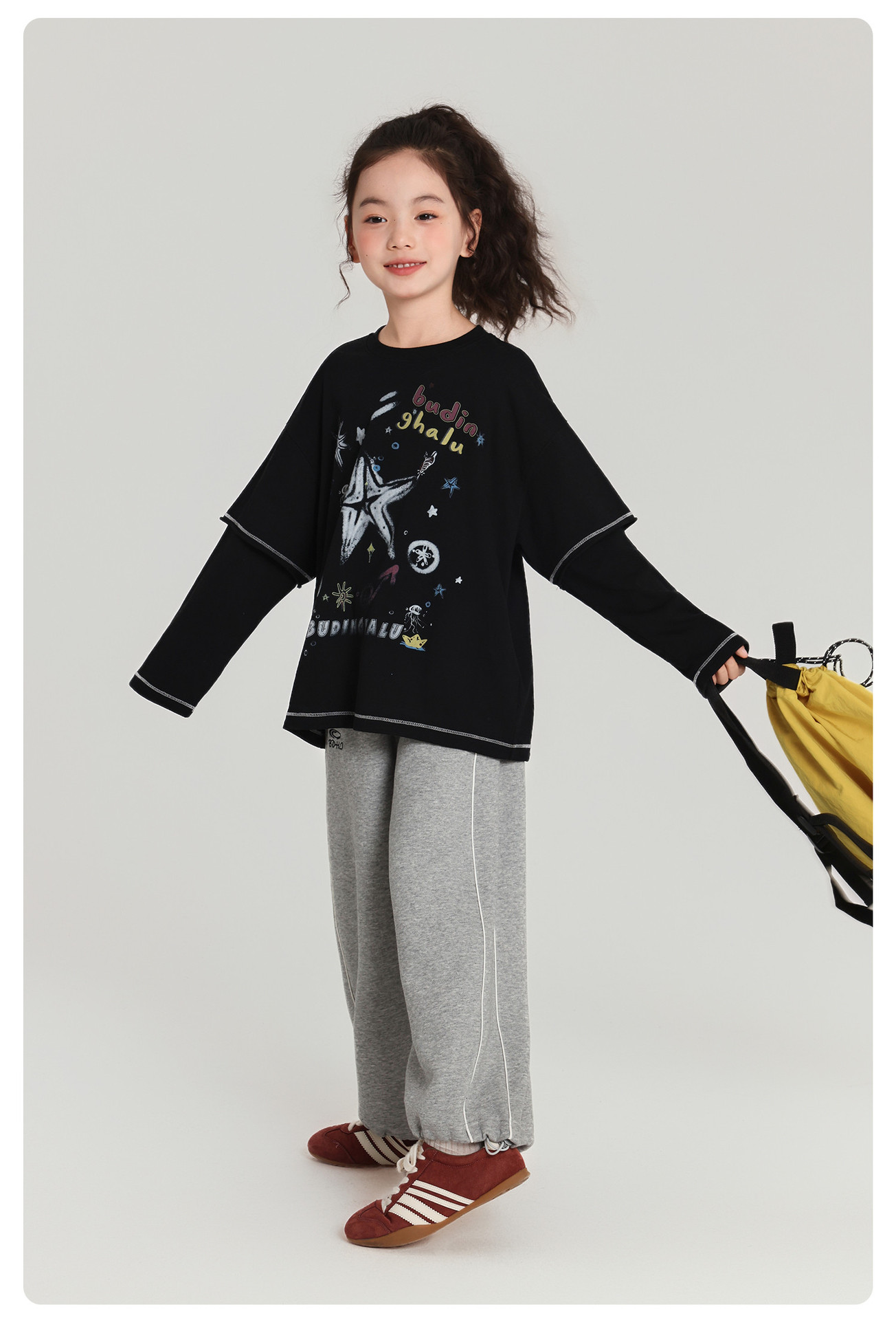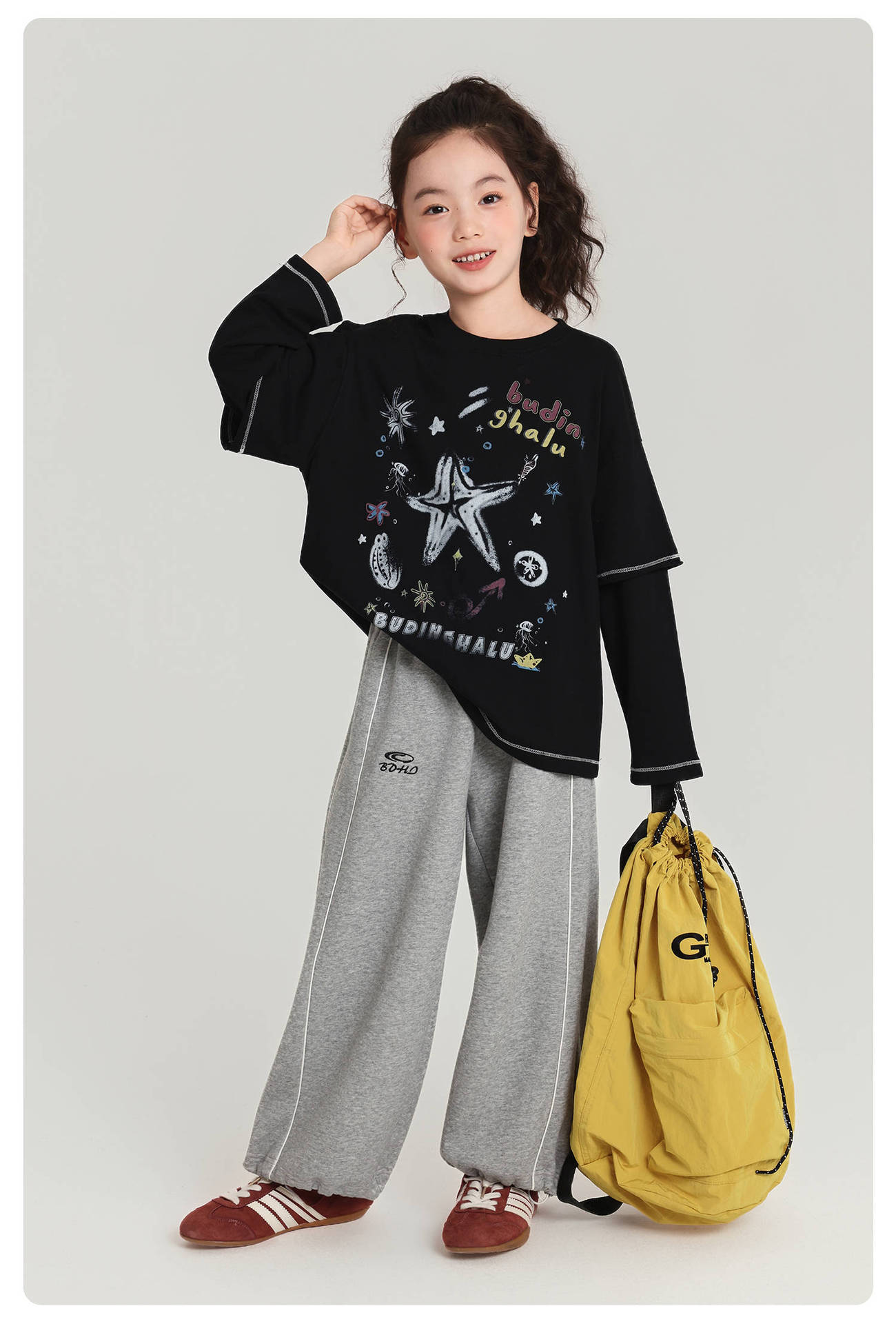 Pudding Haru 2025 새로운 가을 어린이 낙서 가짜 투피스 소녀 긴팔 티셔츠 트렌디 다용도 탑