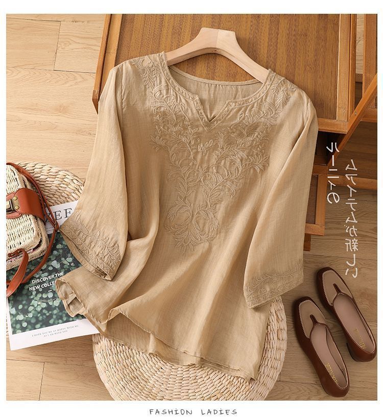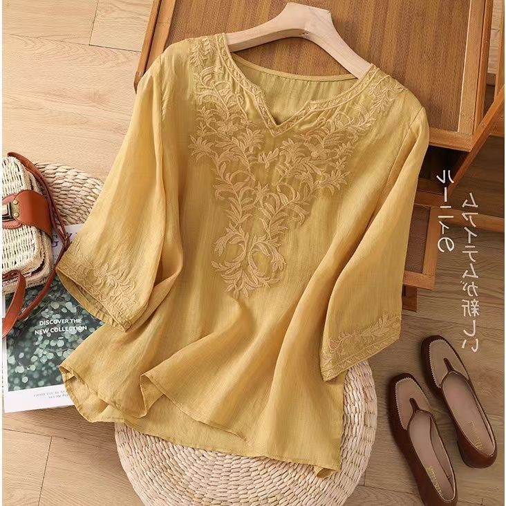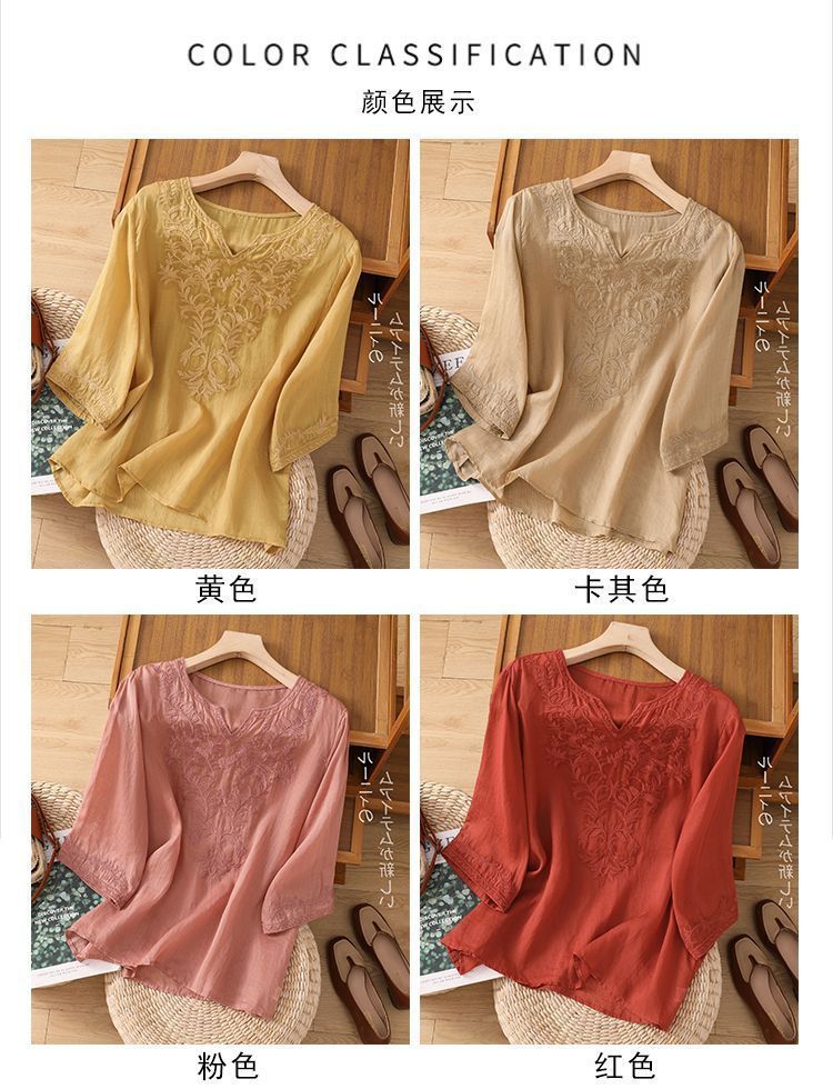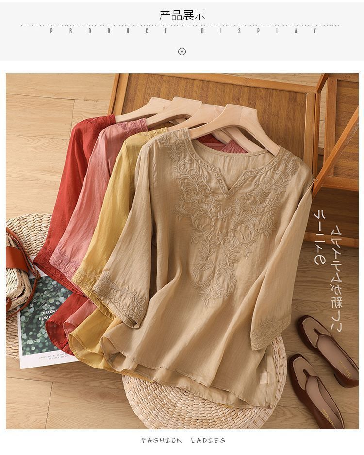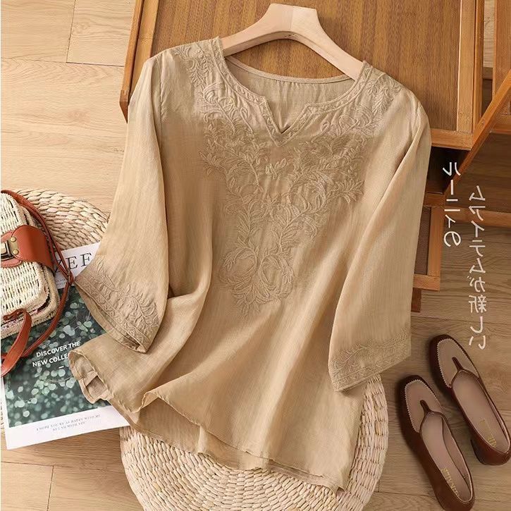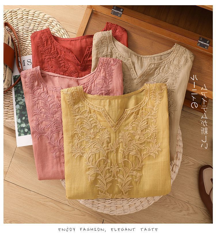 면과 린넨 자수 반팔 탑 여성용 2025 여름 플러스 사이즈 루즈 배 커버 슬리밍 복고풍 캐주얼 티셔츠 여성용스토어 가기