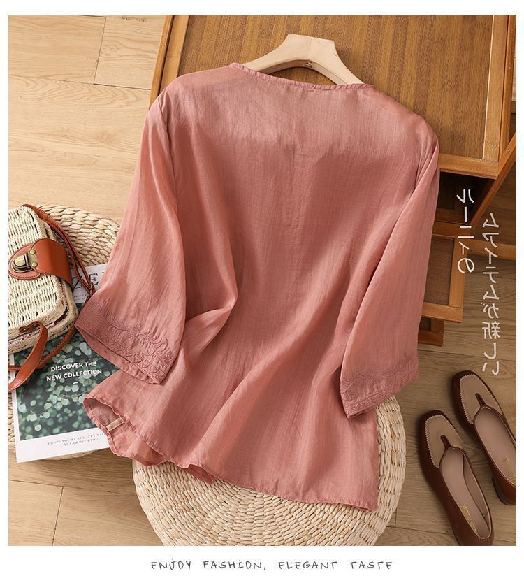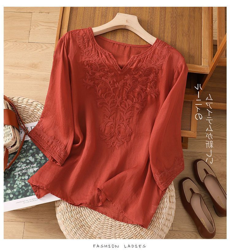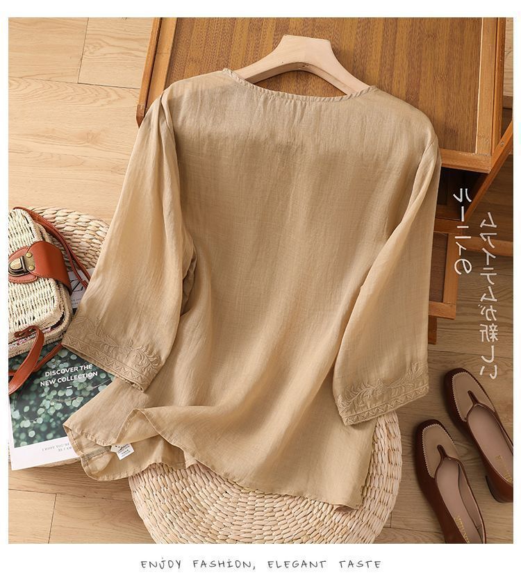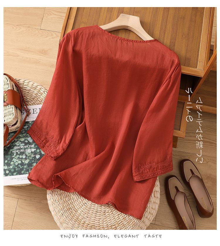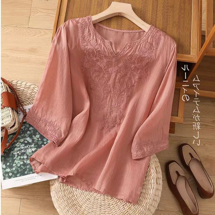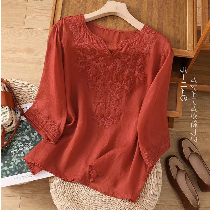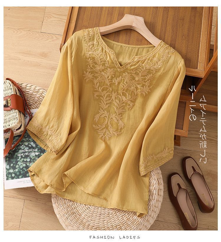 면과 린넨 자수 반팔 탑 여성용 2025 여름 플러스 사이즈 루즈 배 커버 슬리밍 복고풍 캐주얼 티셔츠 여성용스토어 가기