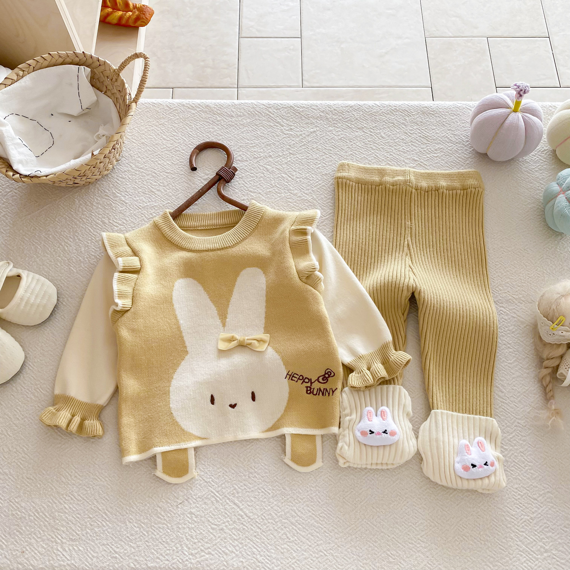가을 아기 스웨터 정장, 귀여운 가짜 투피스 조끼, 니트 탑, 다용도 모직 바지, 가을 외출복