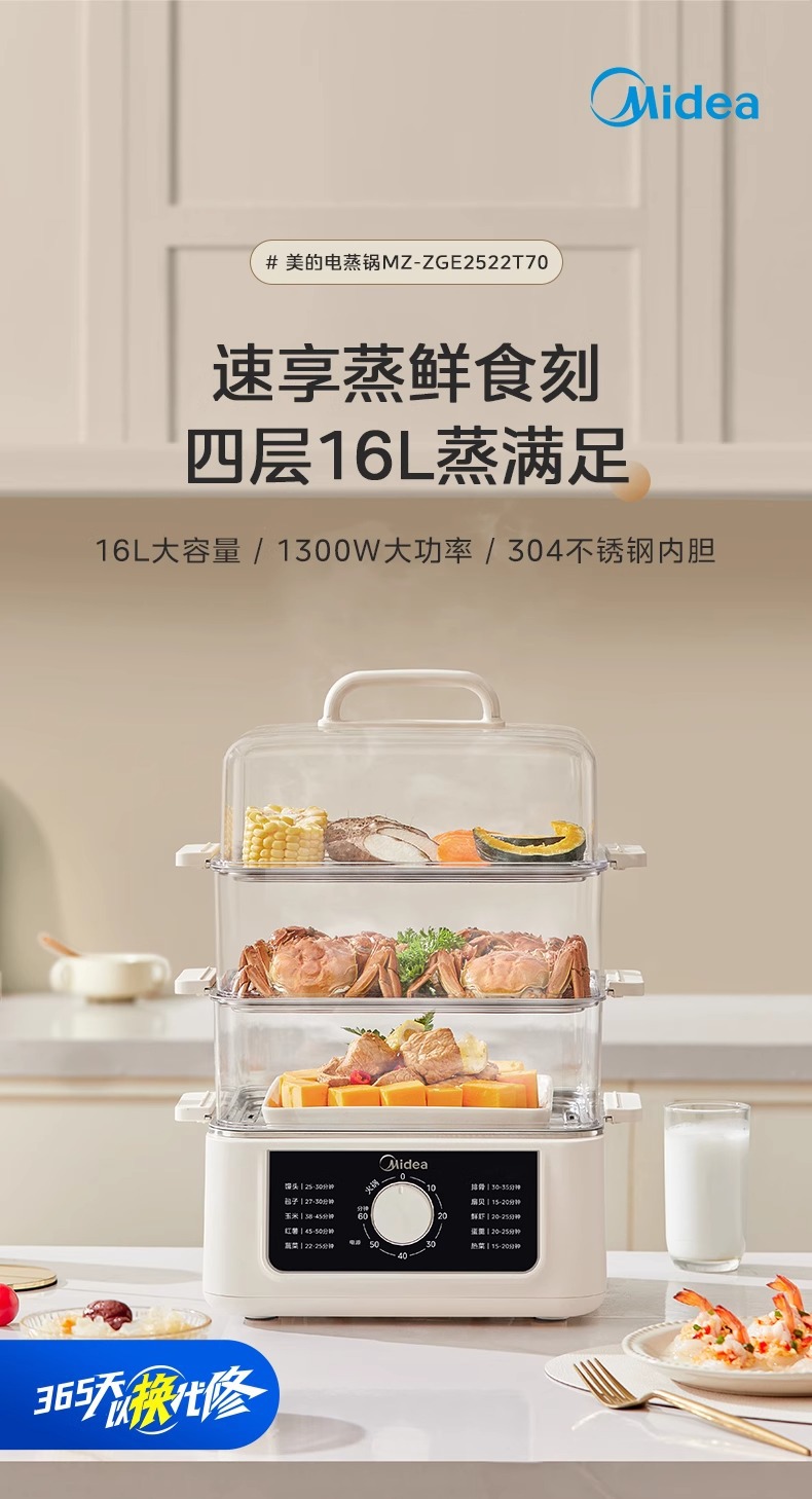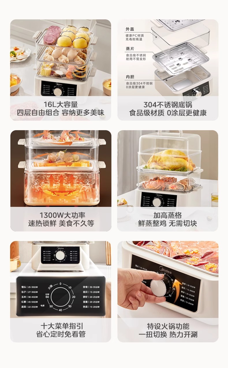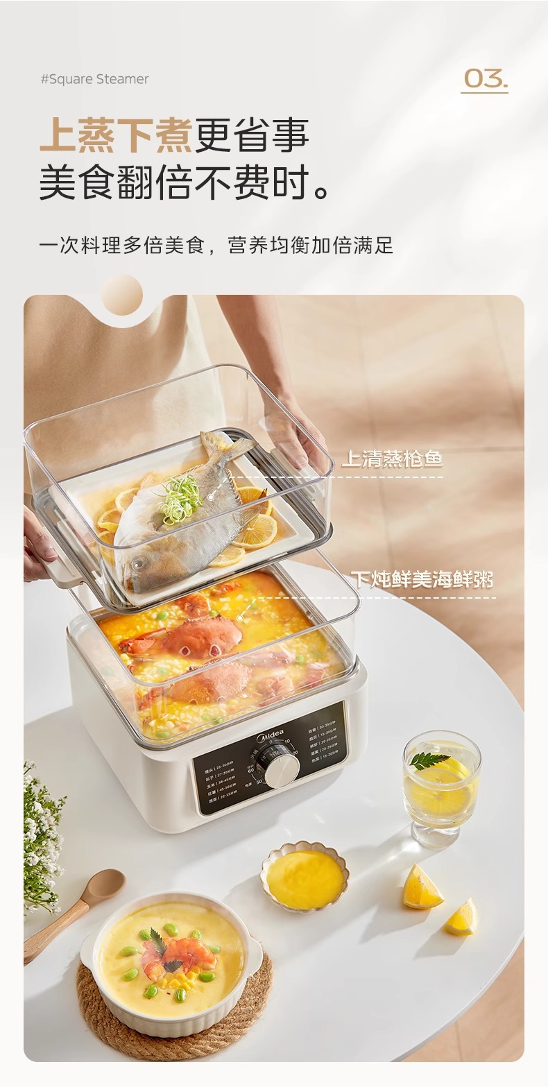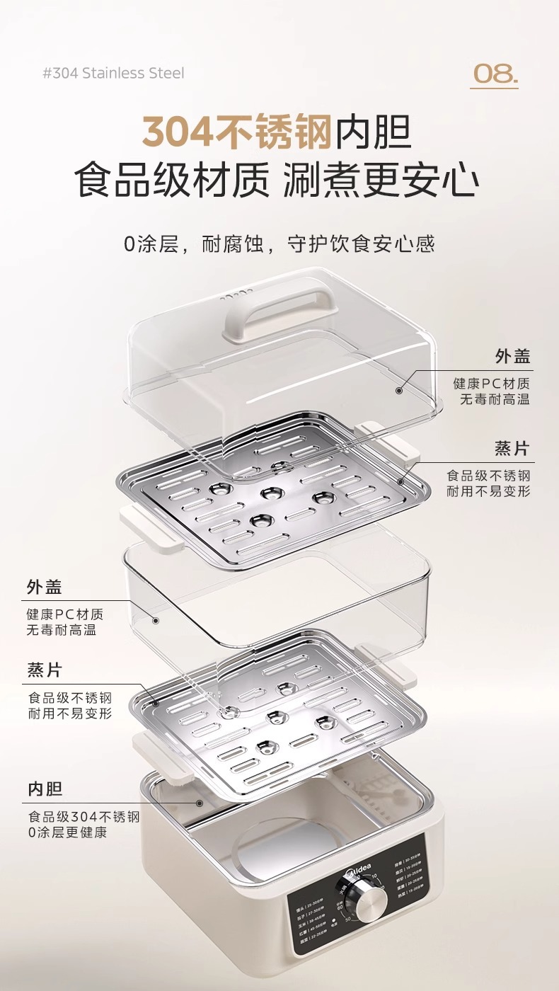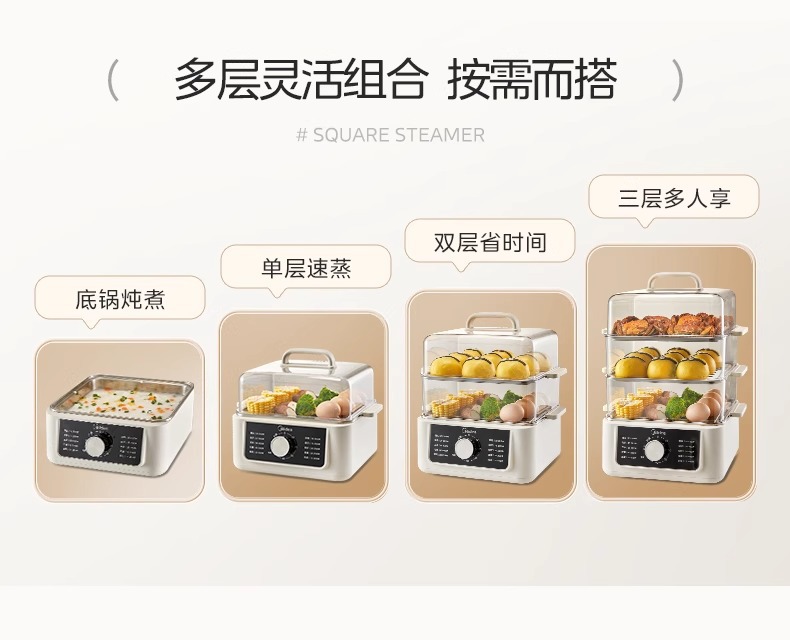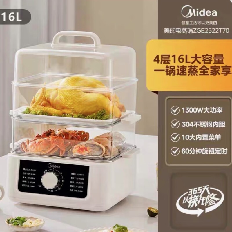 Midea 전기 찜통 다기능 스테인레스 스틸 가정용 3 층 대용량 지능형 찜 및 요리 올인원 냄비 ZGE2522T70