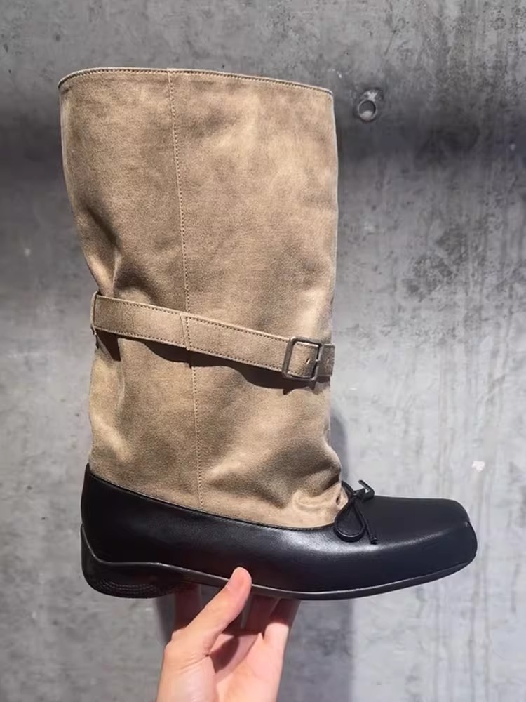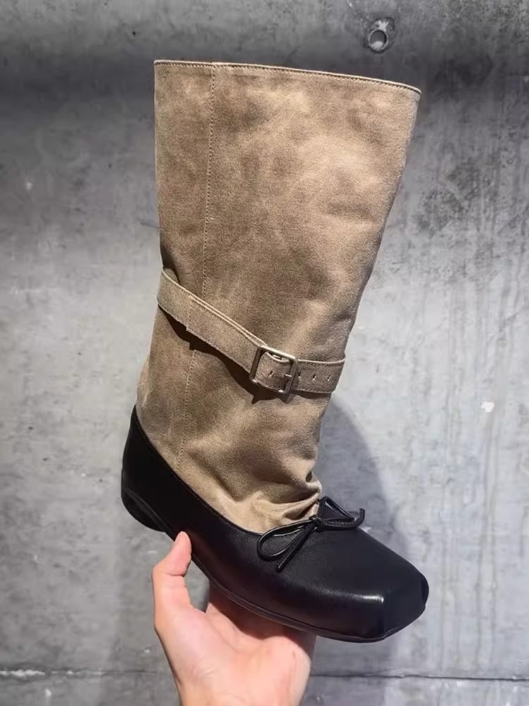 양가죽 버전~레트로 리본 스웨이드 디자인 발레 숏부츠 여성 벨트 버클 두꺼운 밑창 슈즈 나이트부츠