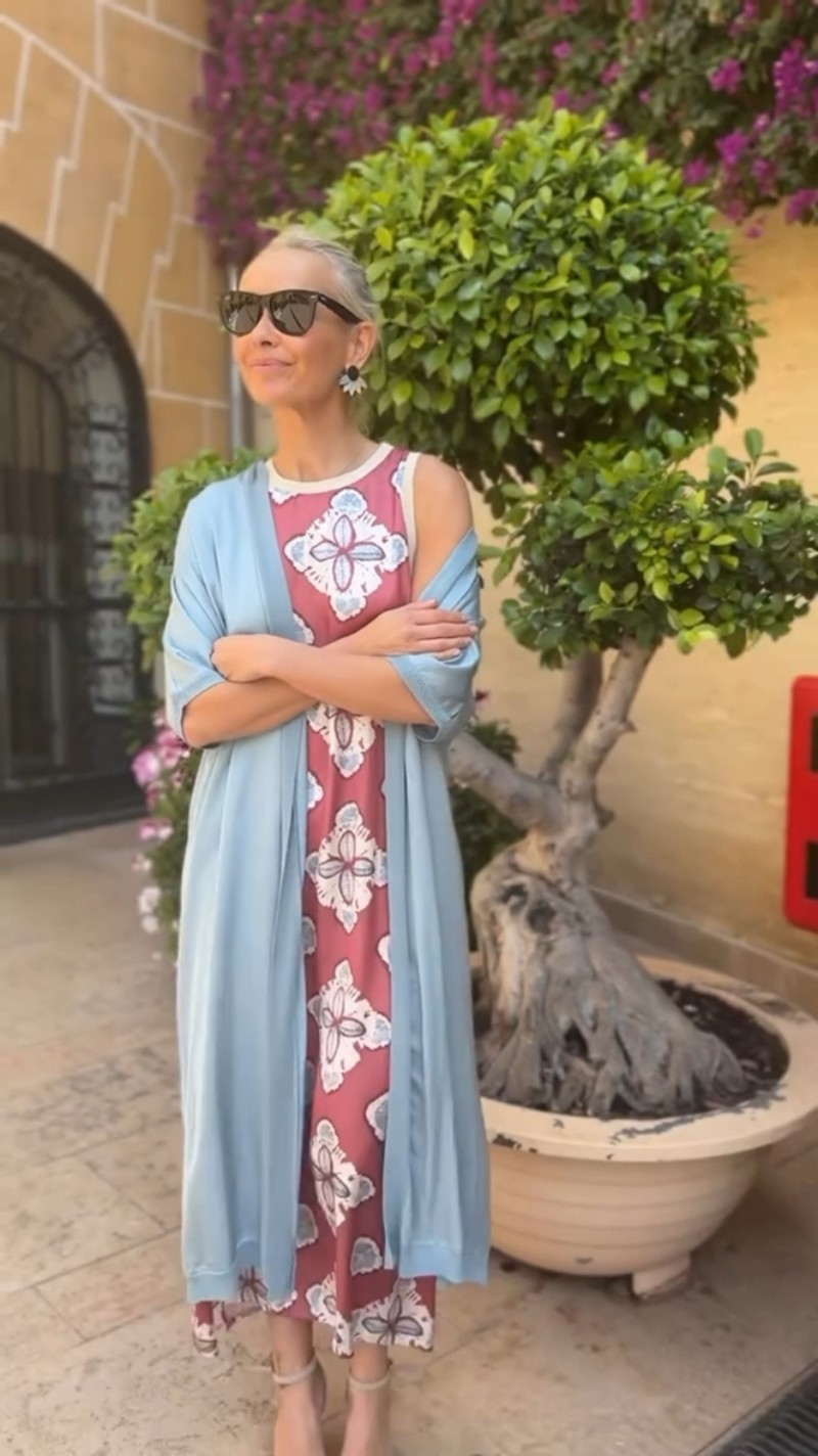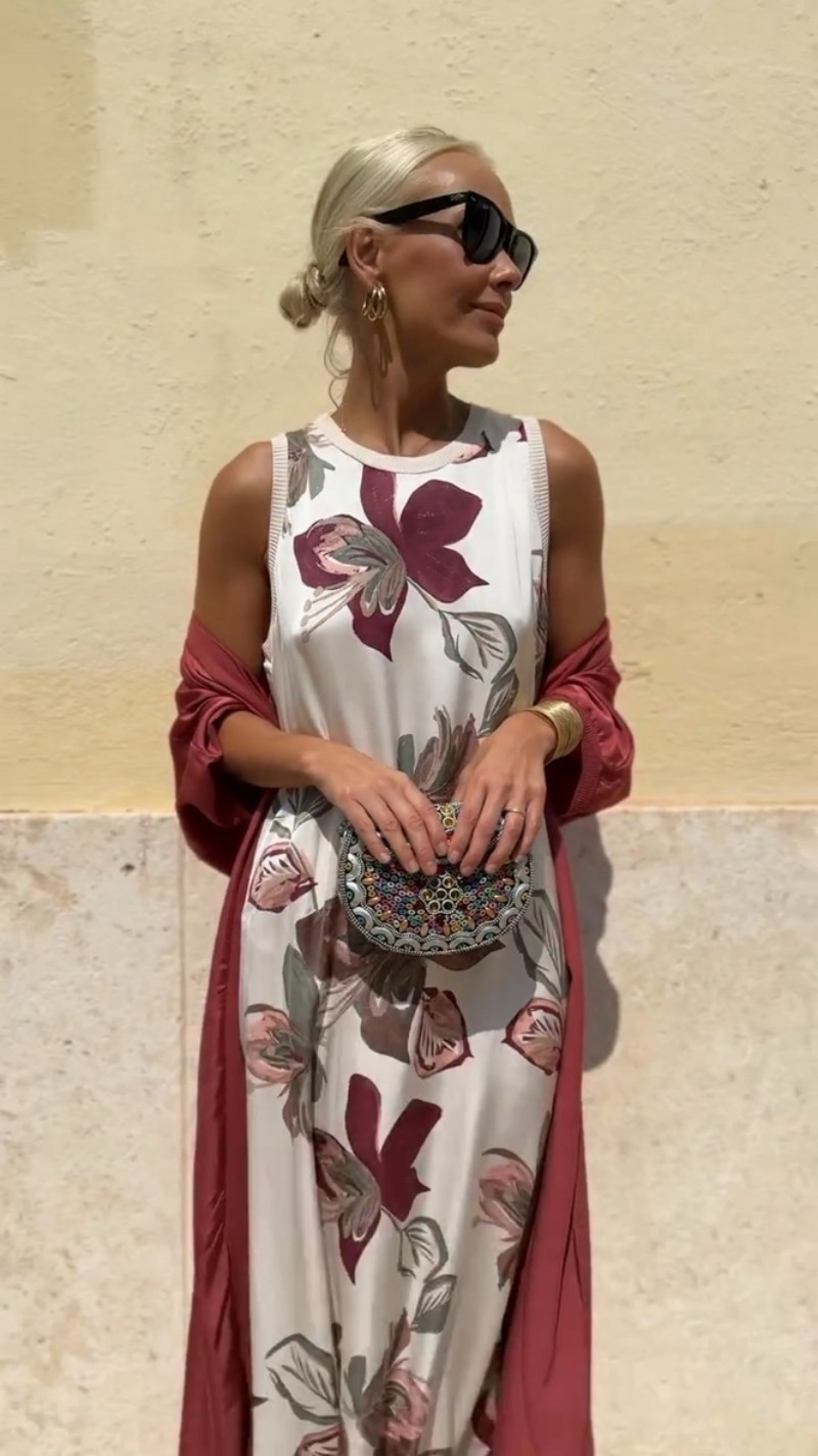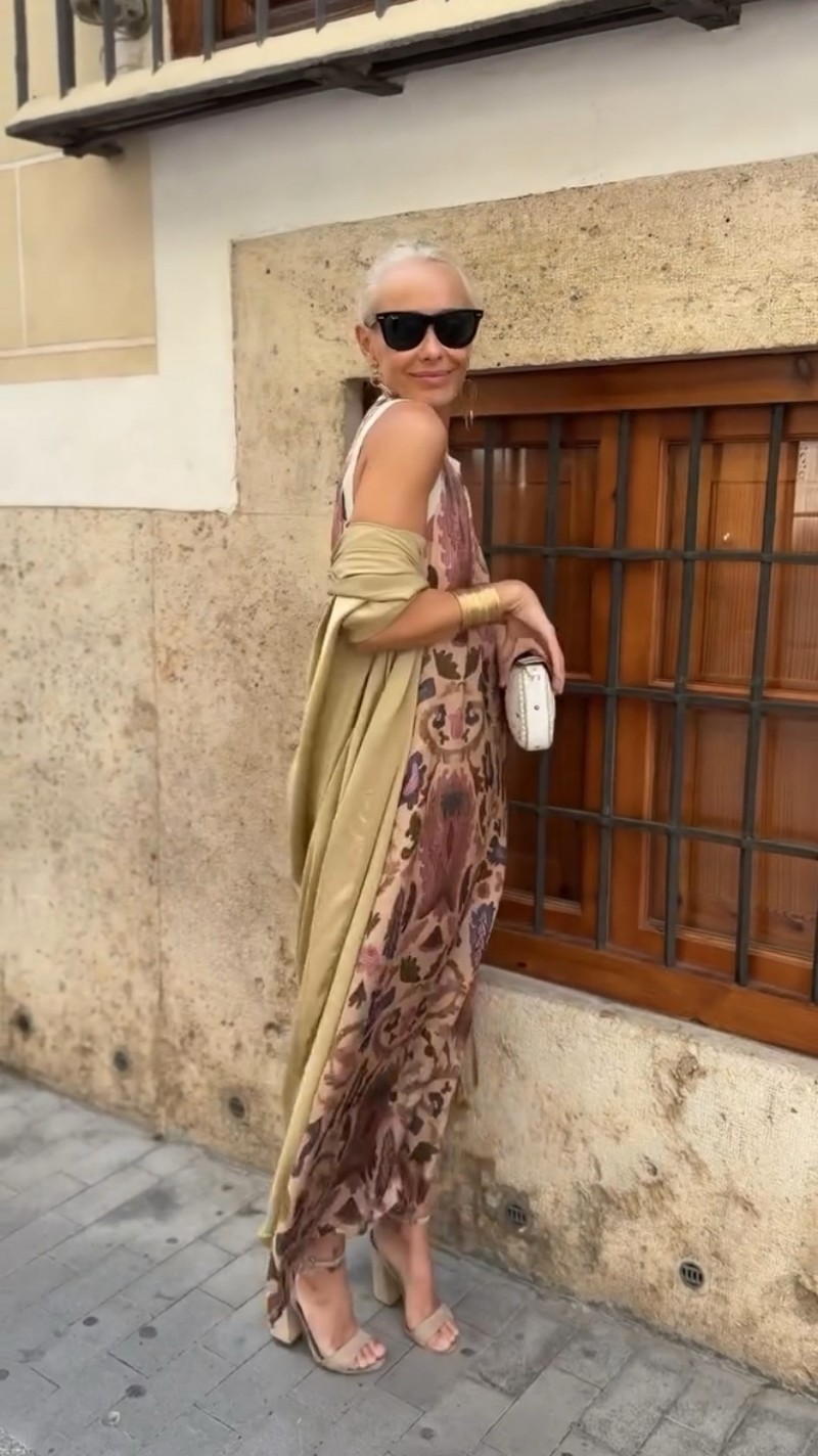2025 유럽 및 미국 스타일의 우아한 프린트 라운드넥 드레스, 크로스보더 프라이빗웨어, 명사들을 위한 투피스 세트, 망토가 있는 롱 드레스스토어 가기