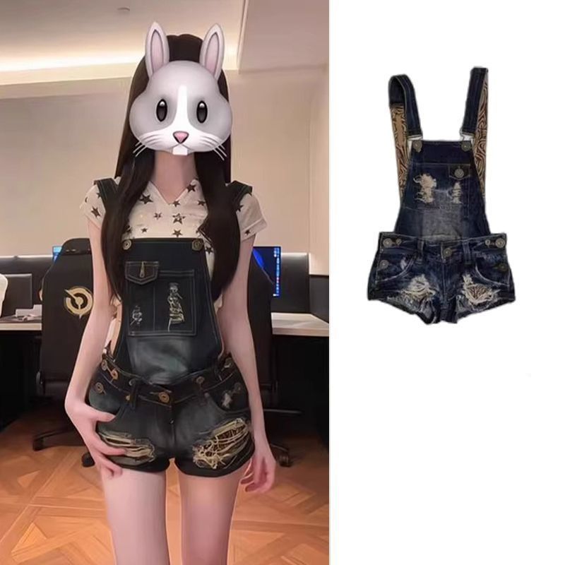 2025 여름 아메리칸 핫걸 워싱 디스트레스드 빈티지 찢어진 데님 오버올 여성 슬리밍 힙 커버 반바지 트렌디