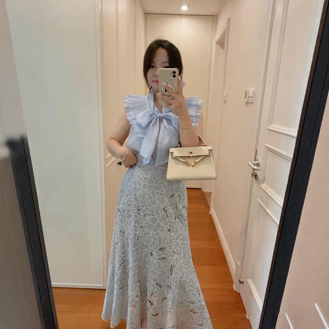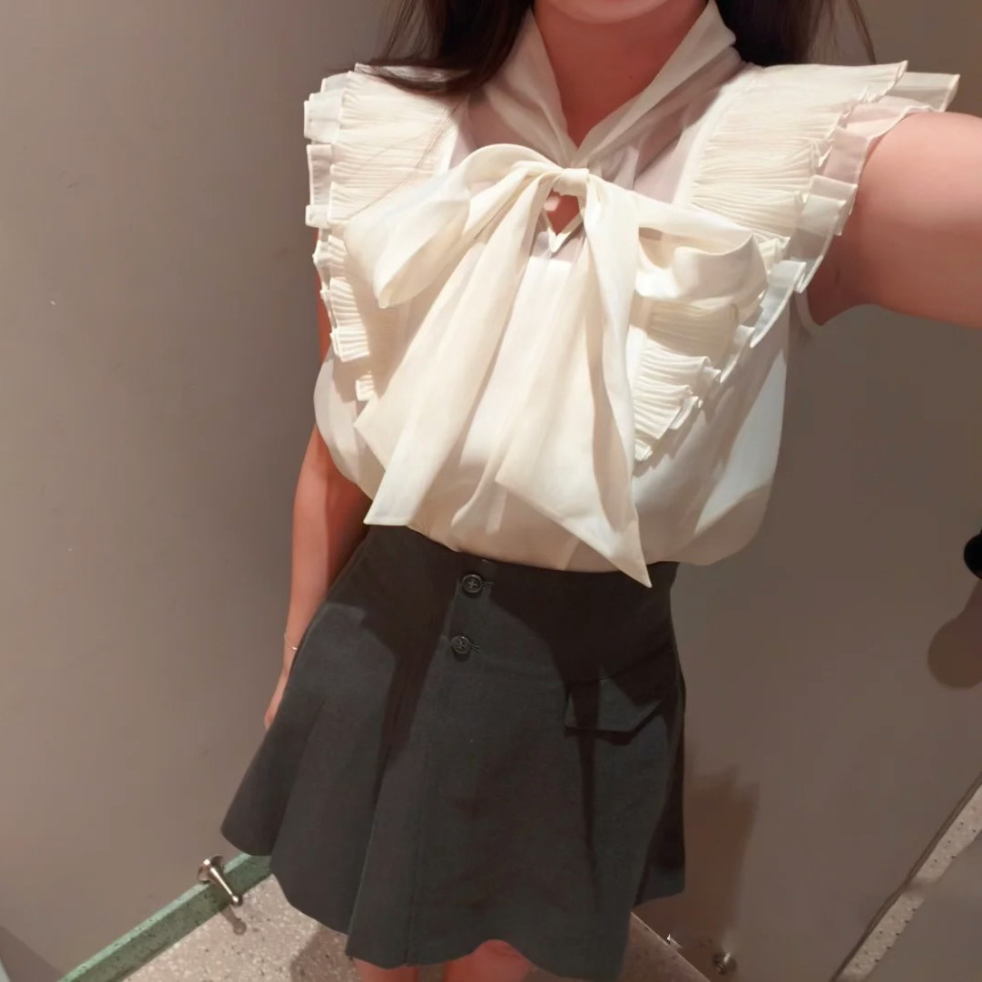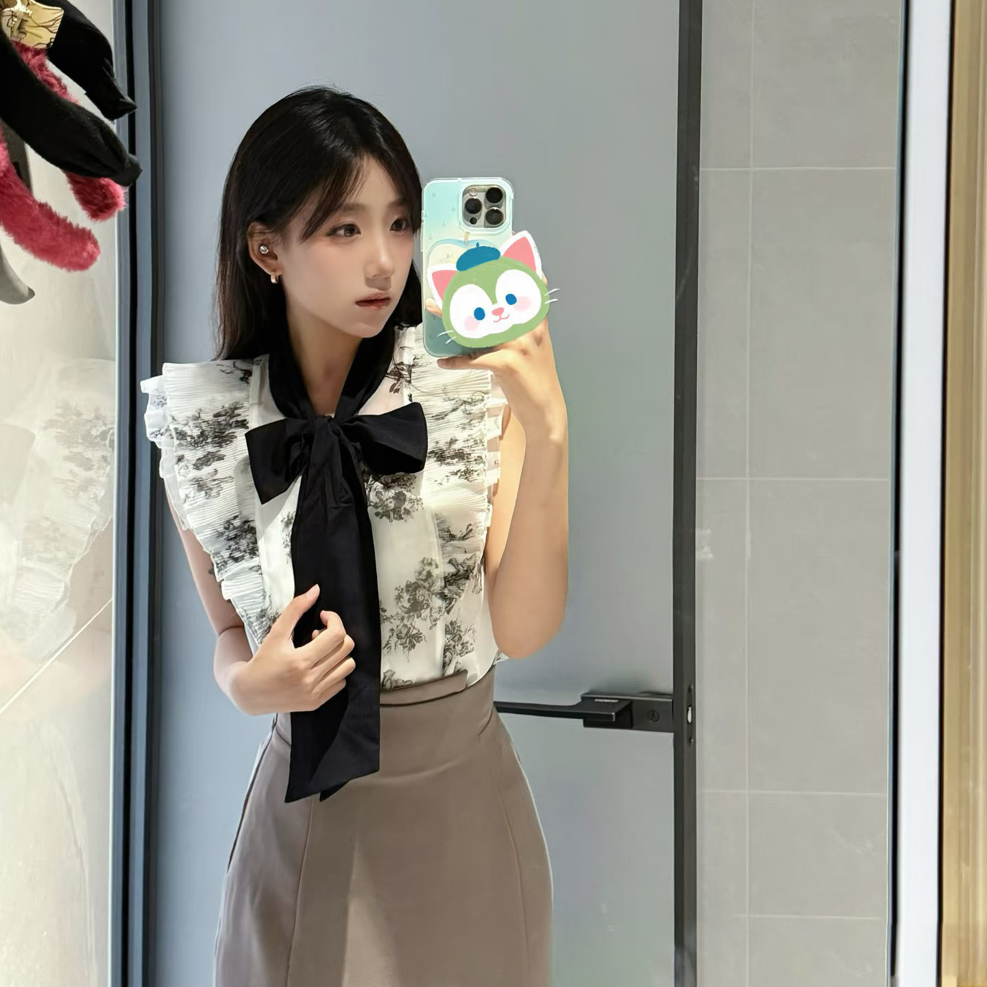 [Huilin] 일본 크로스보더 스위트 25 러플 보우 레이스업 쉬폰 투웨어 민소매 셔츠 25A245