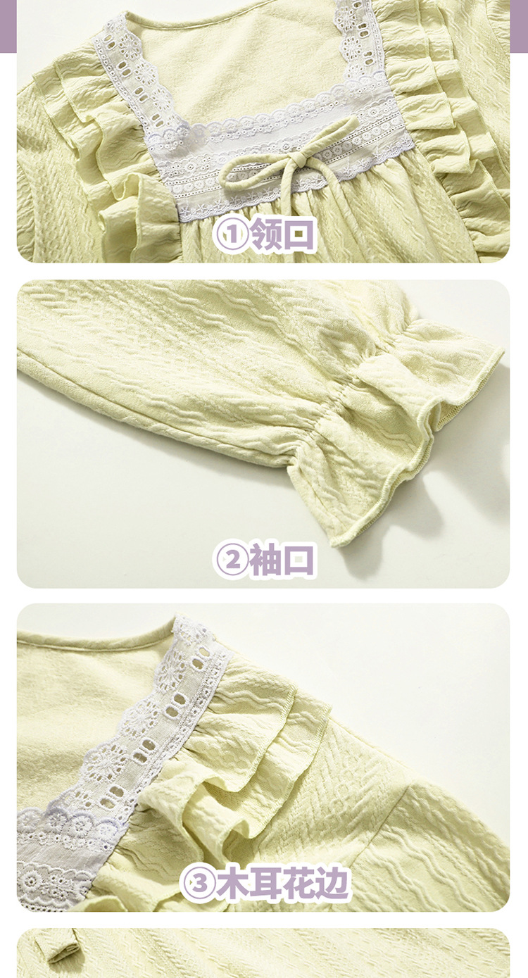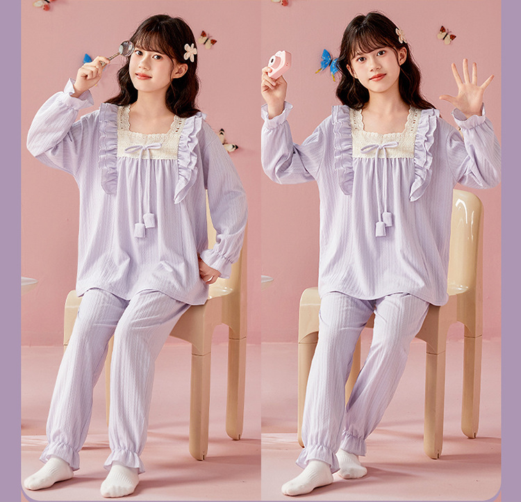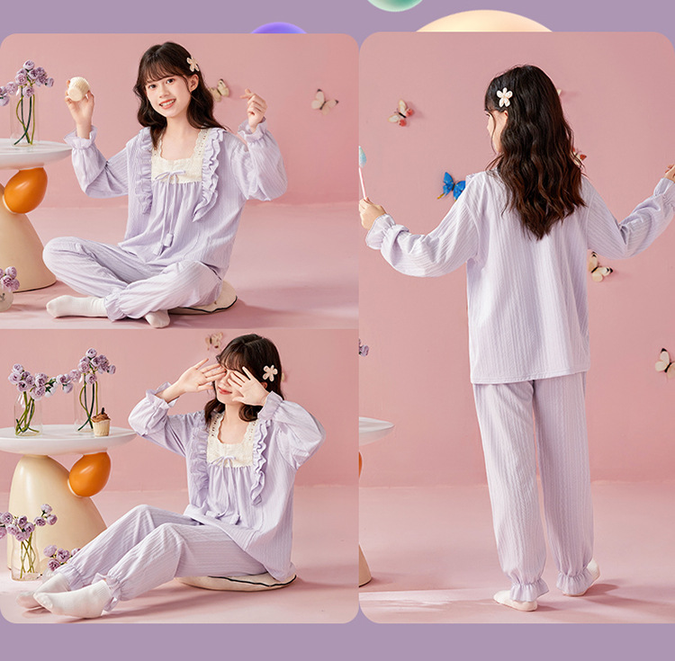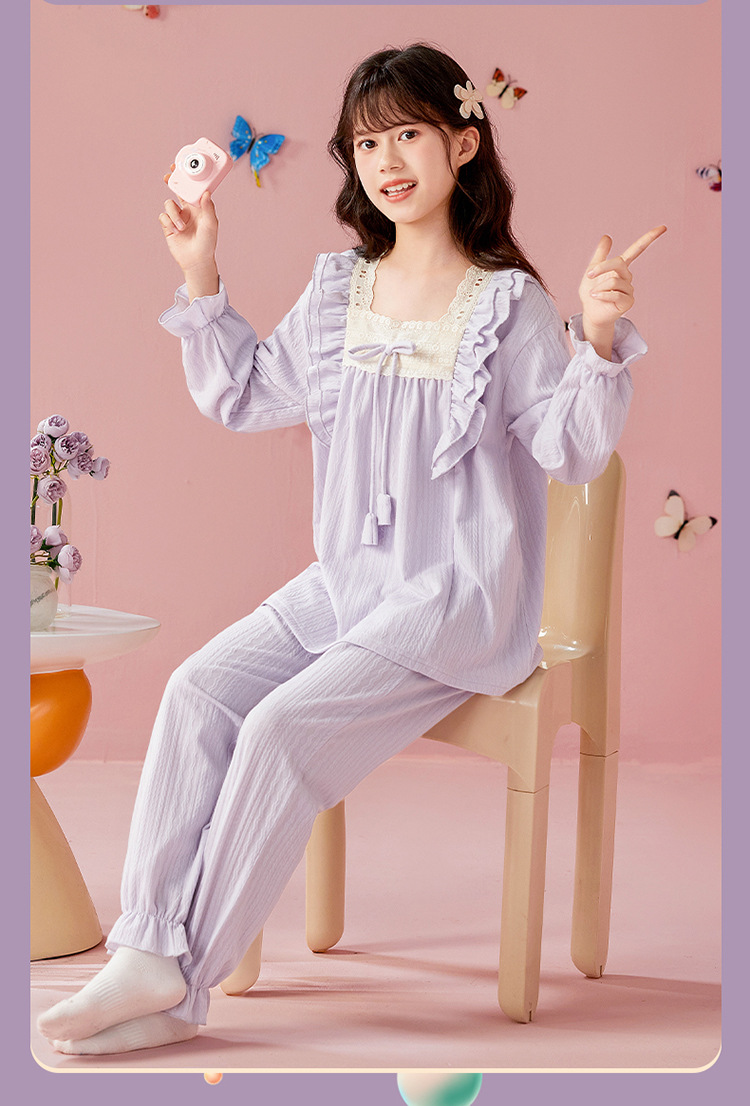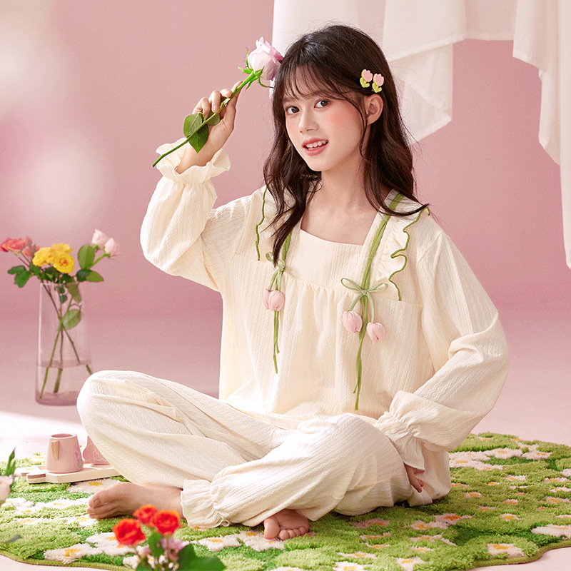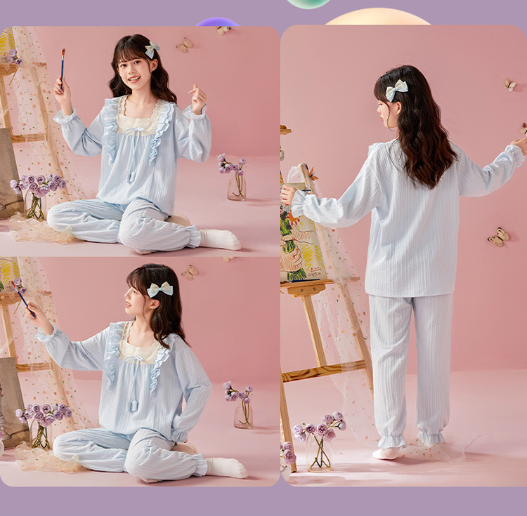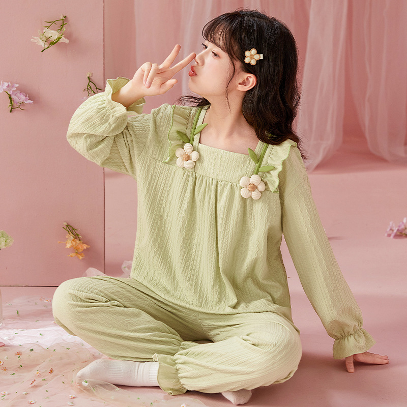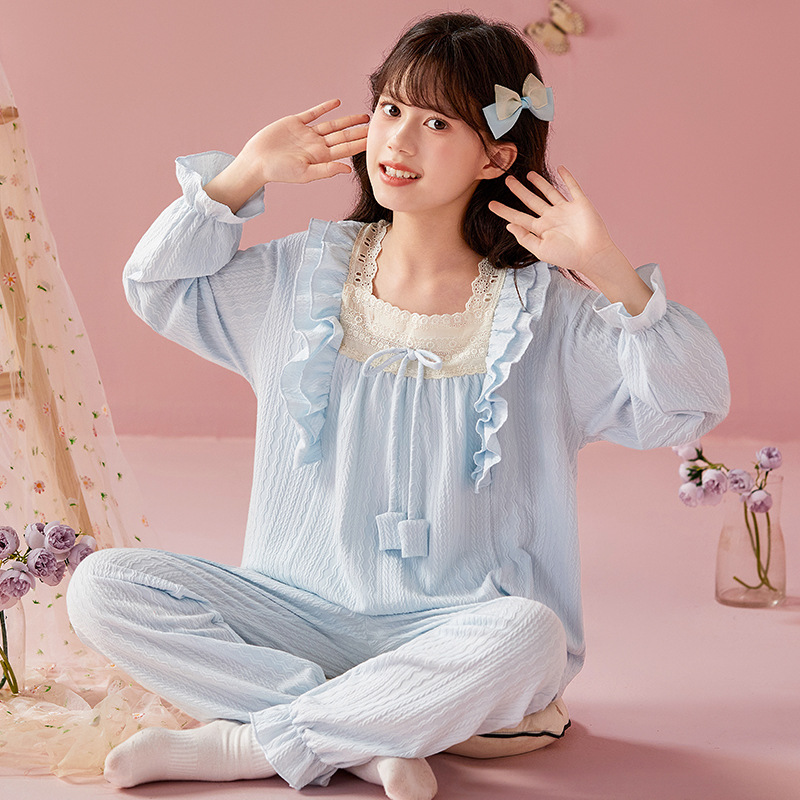여아용 면 잠옷, 가슴 패드가 있는 어린이 봄, 가을 긴팔 공주 스타일 가정복, 부모-자식 중대형 아동복스토어 가기