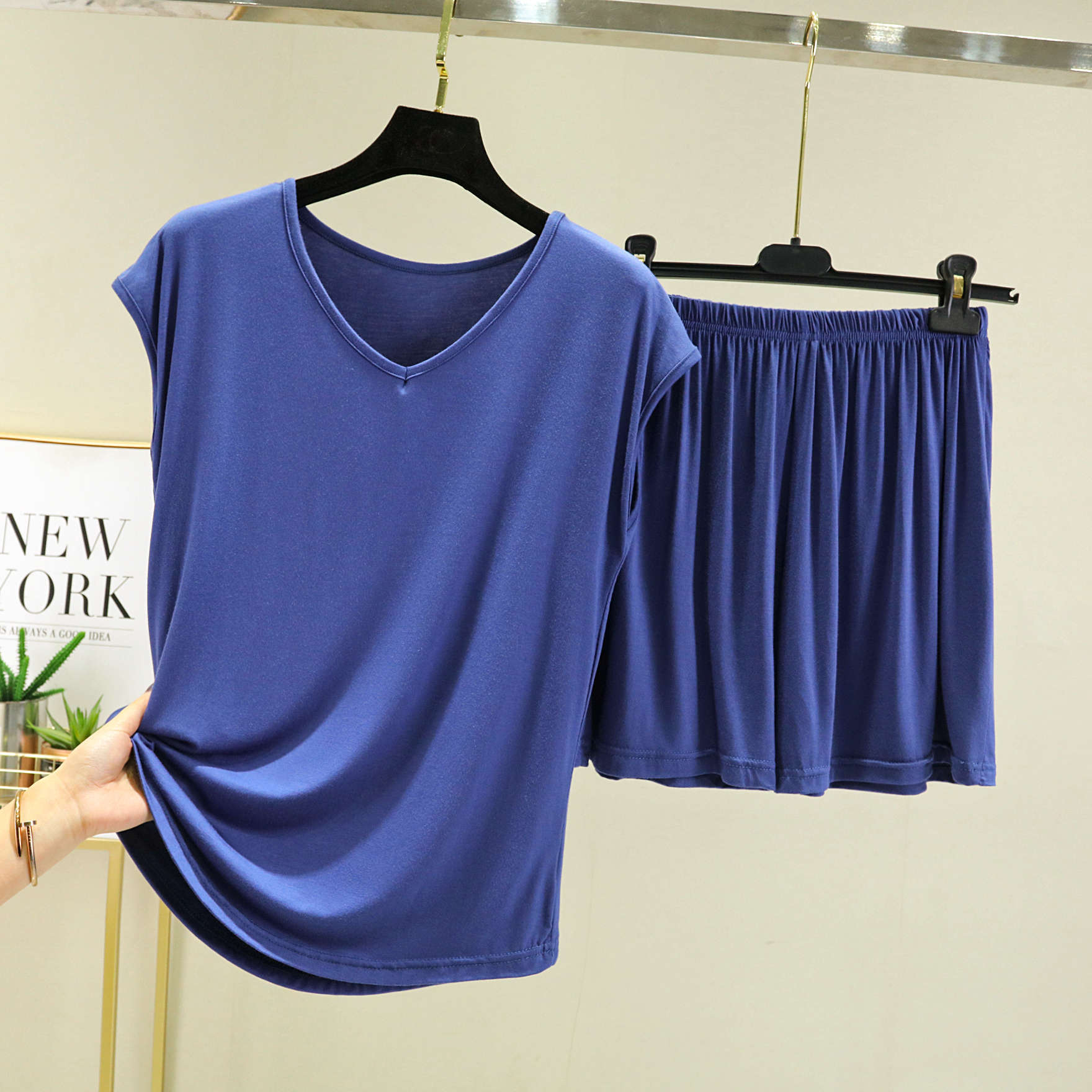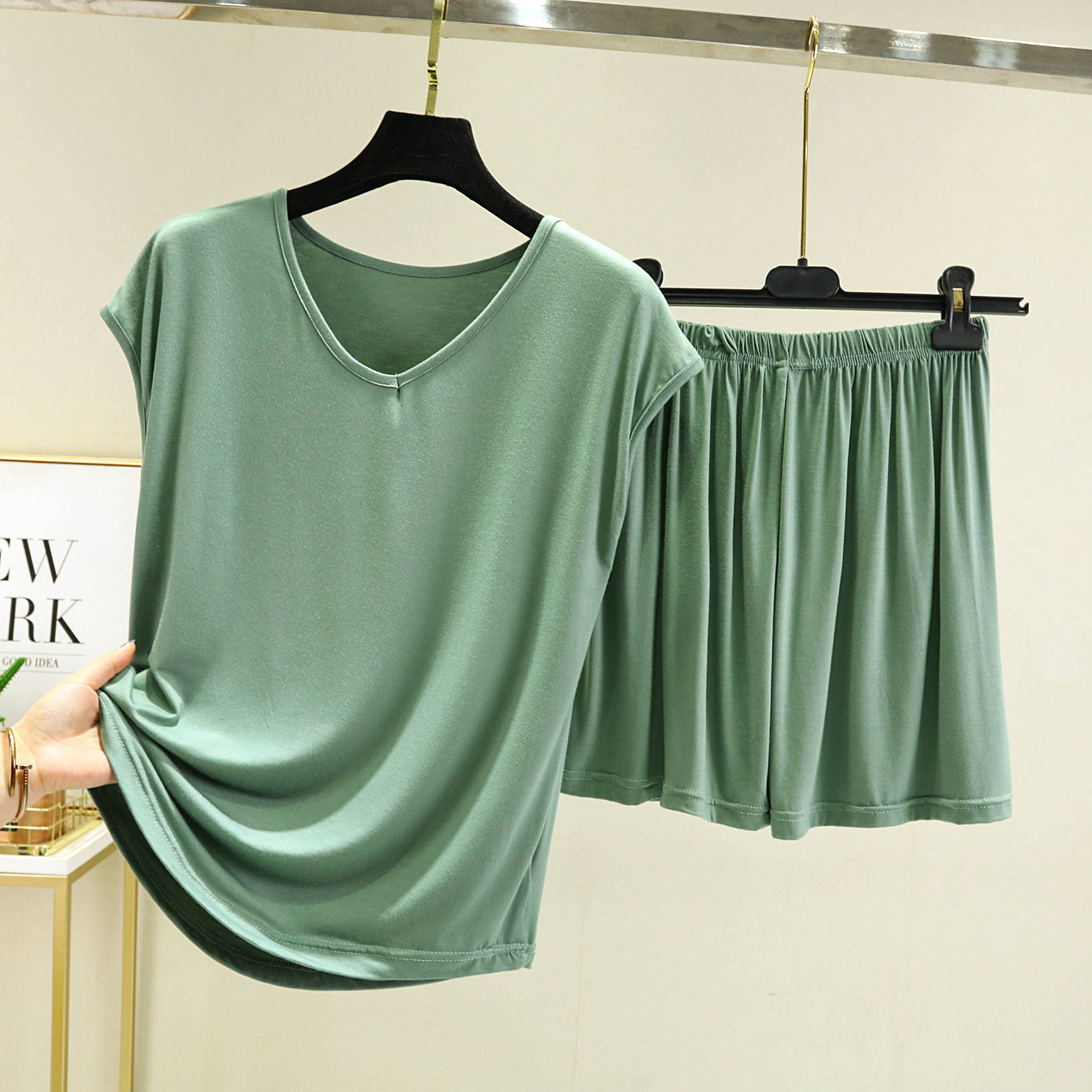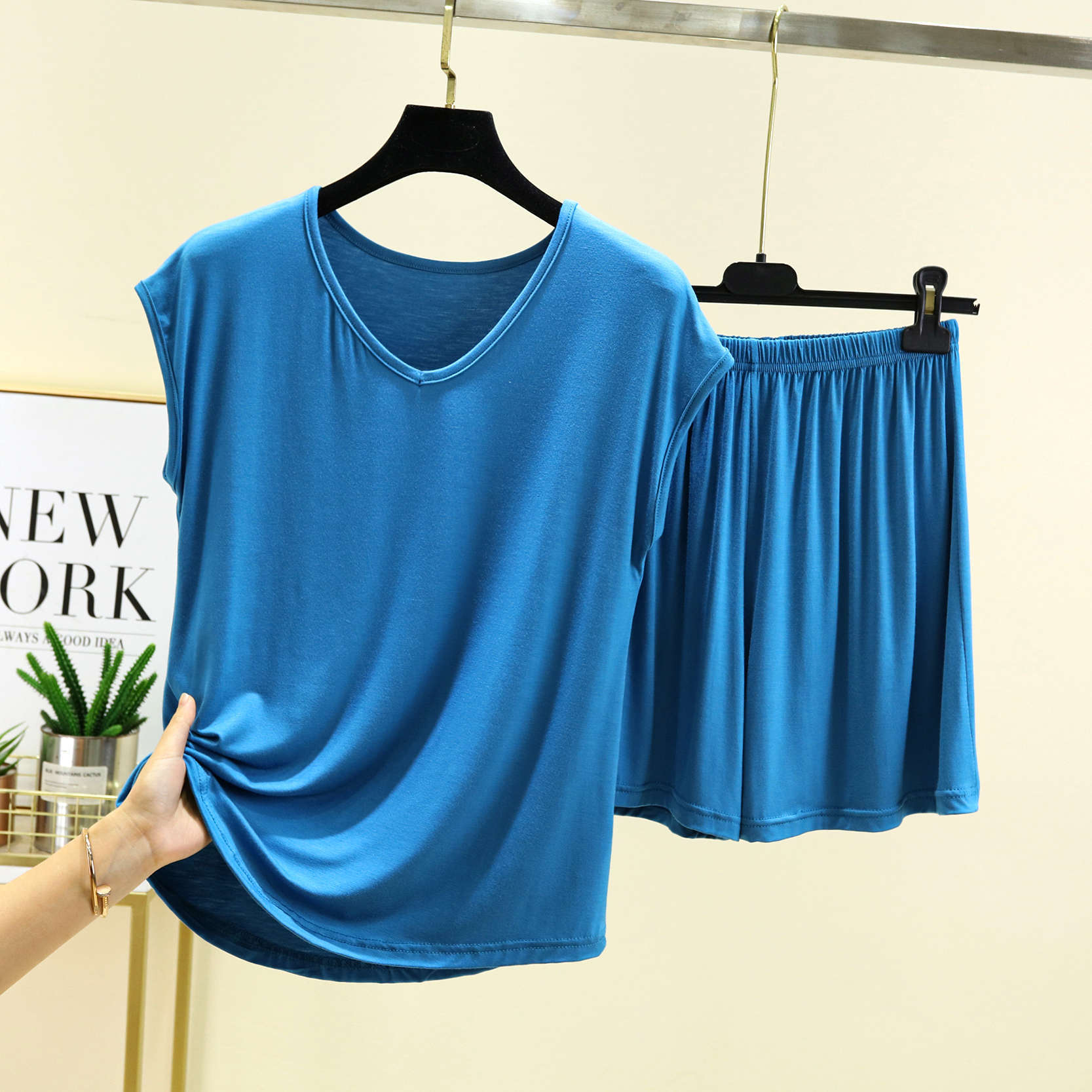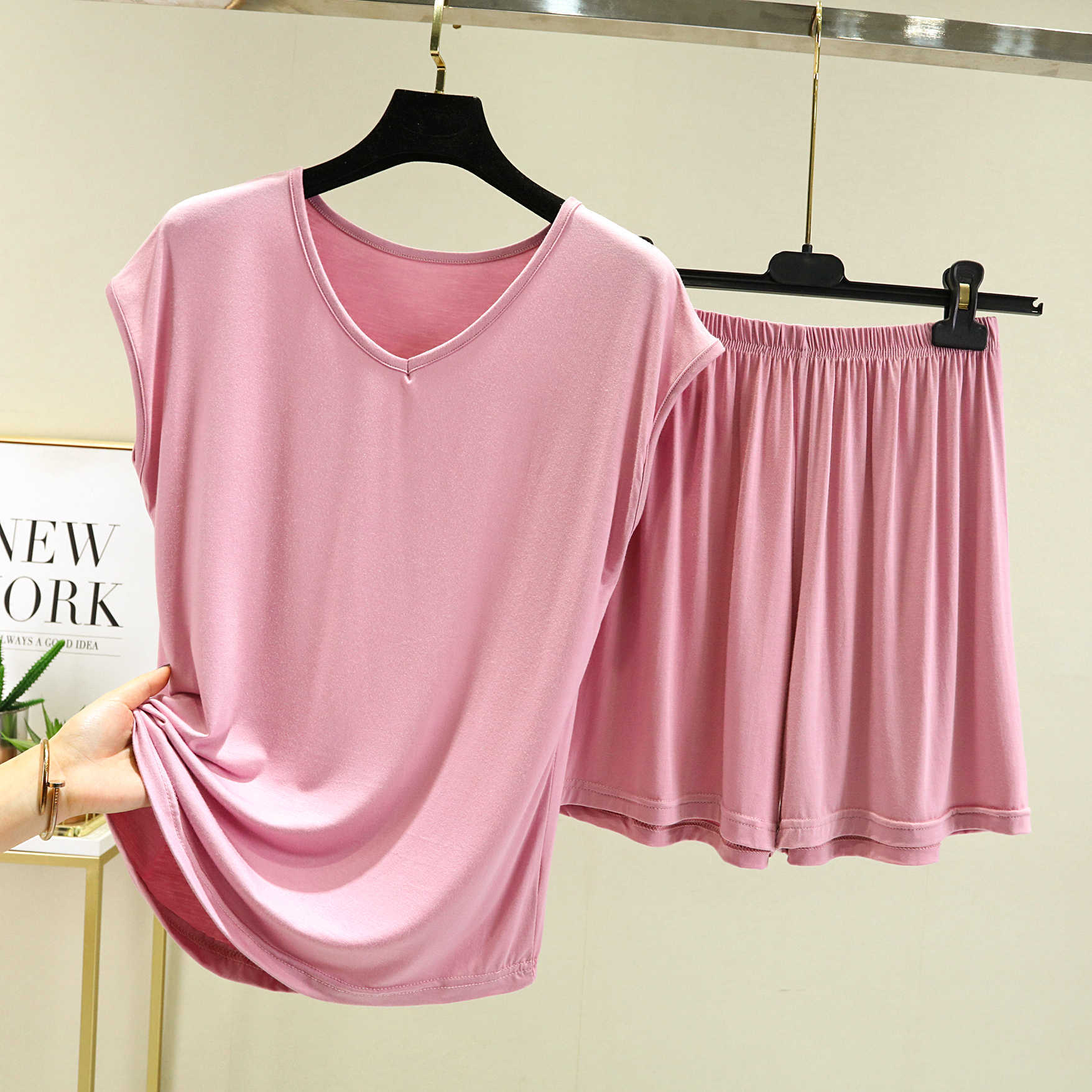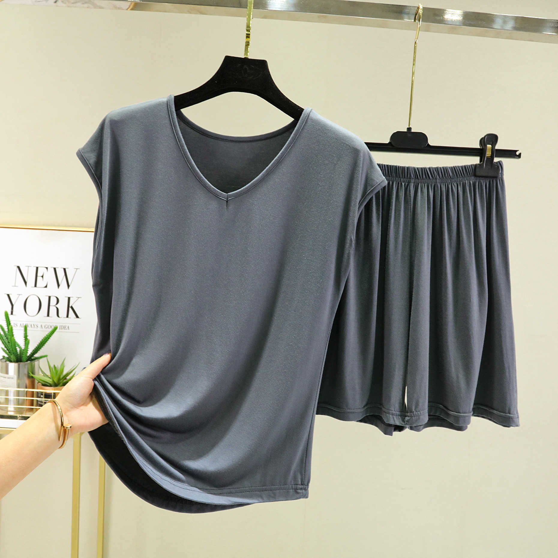 여성을위한 모달 느슨한 민소매 티셔츠 반바지 정장 여름 얇은 잠옷 플러스 사이즈 v 넥 홈웨어 투피스 세트