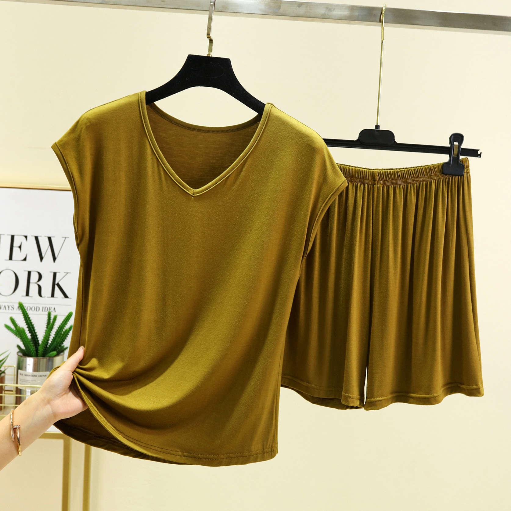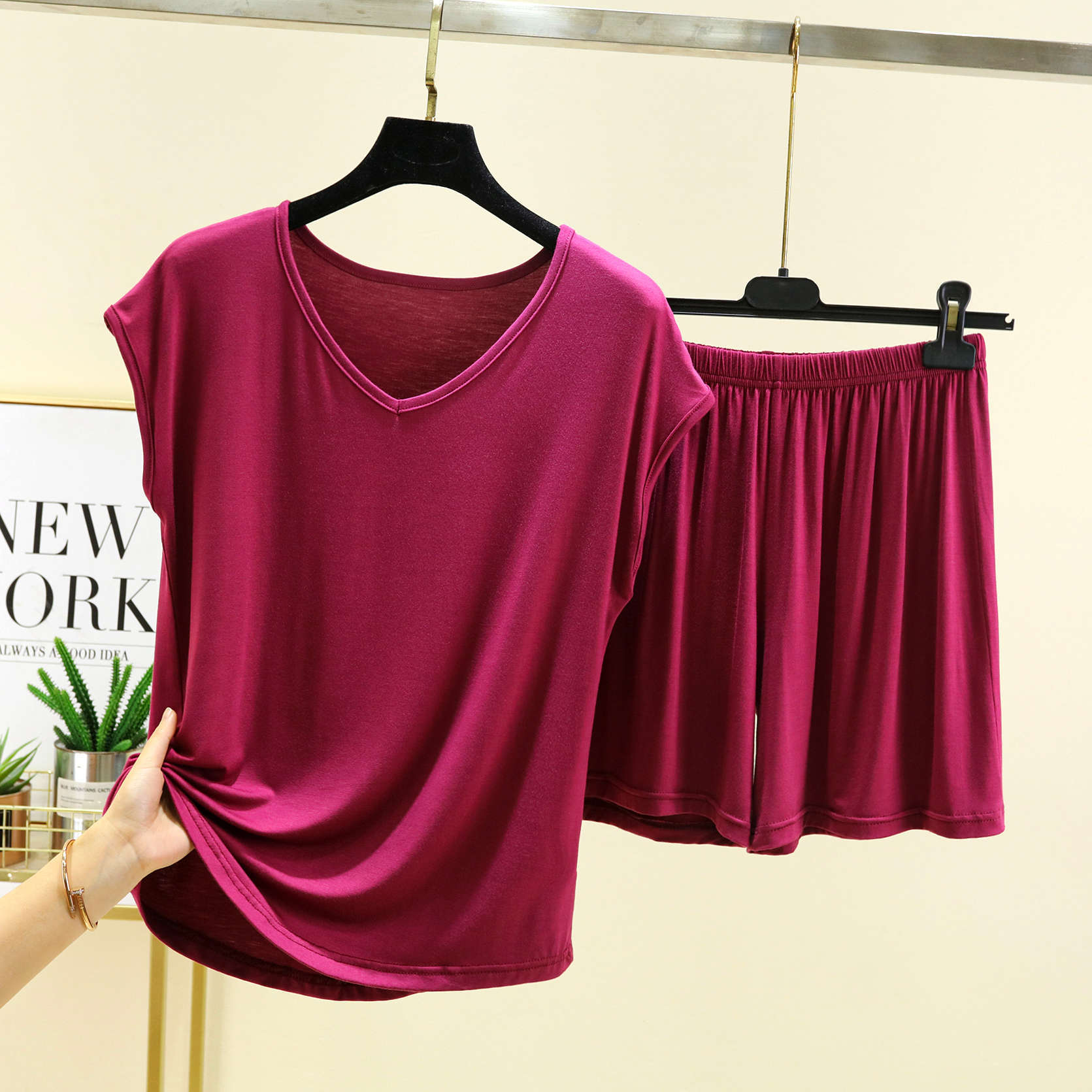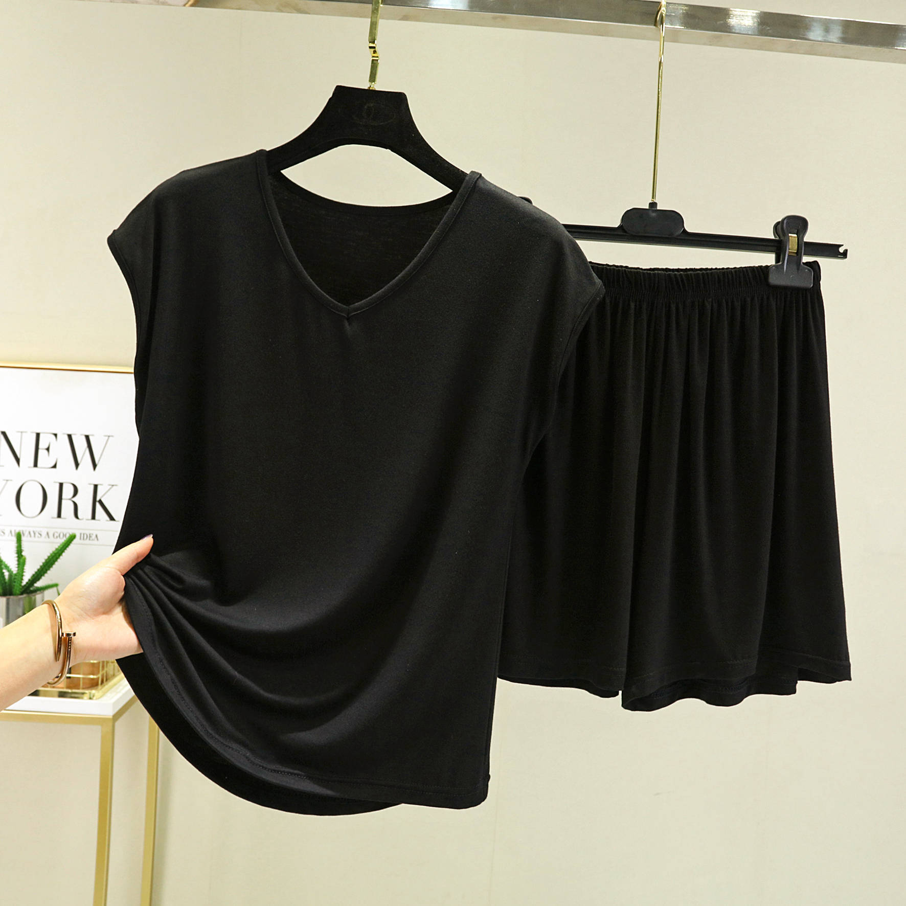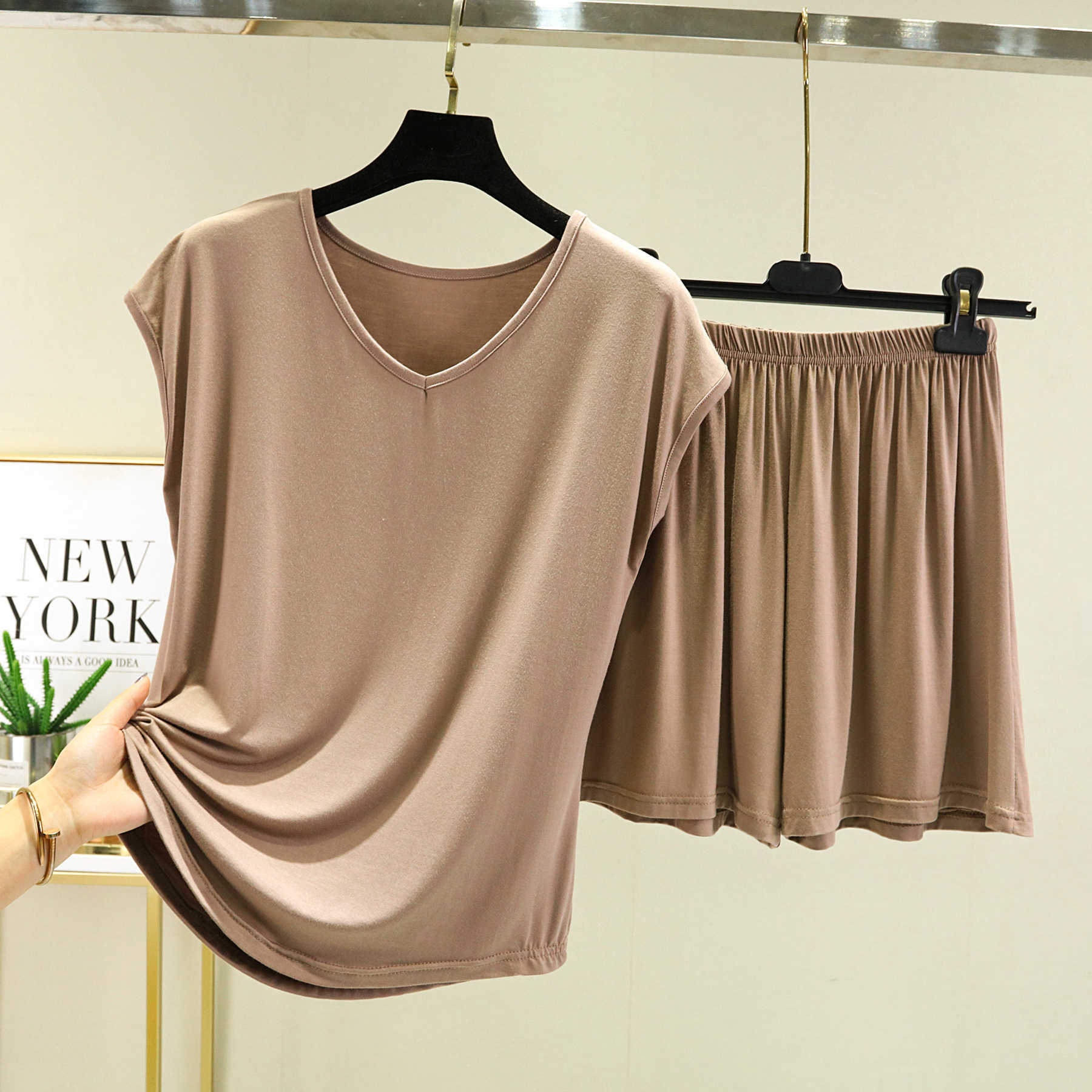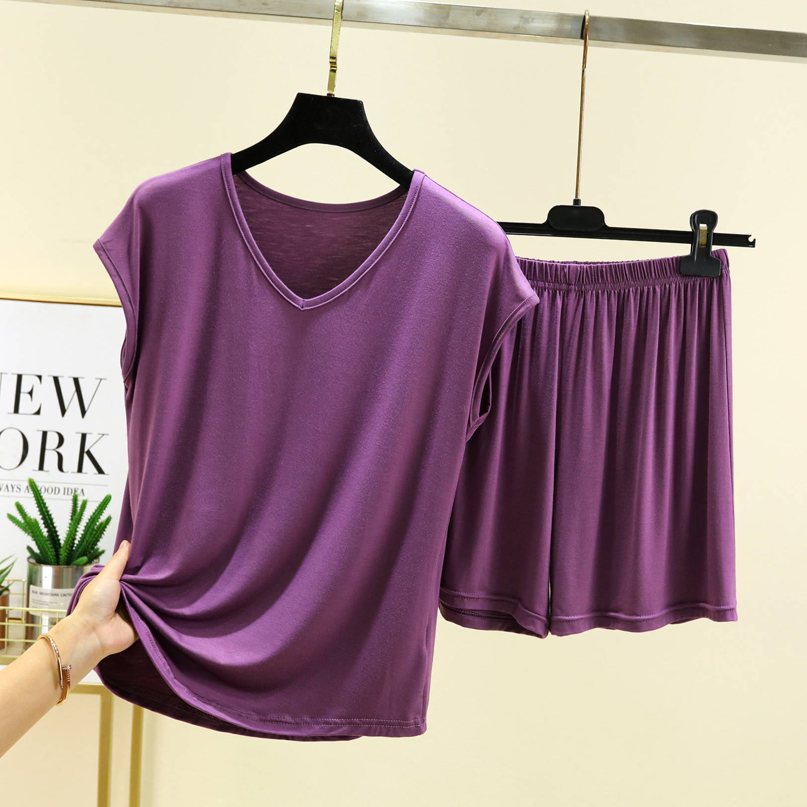 여성을위한 모달 느슨한 민소매 티셔츠 반바지 정장 여름 얇은 잠옷 플러스 사이즈 v 넥 홈웨어 투피스 세트