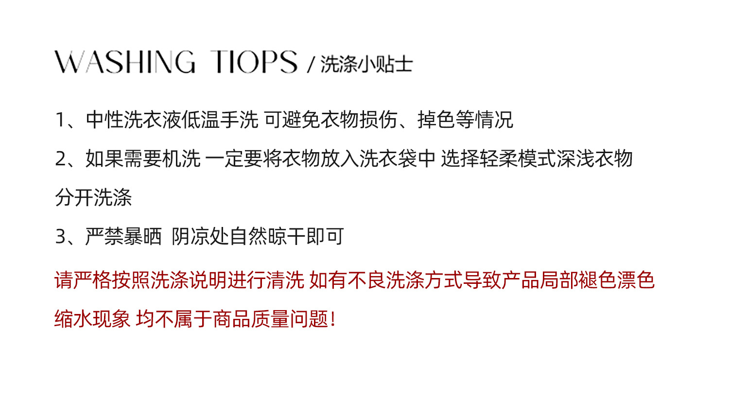 一.服装正常 先涤手洗或机洗都可以,不论撞色、单色都不可以长时间浸泡,随浸随洗,不要混洗,单独洗涤防止沾色或褪色;