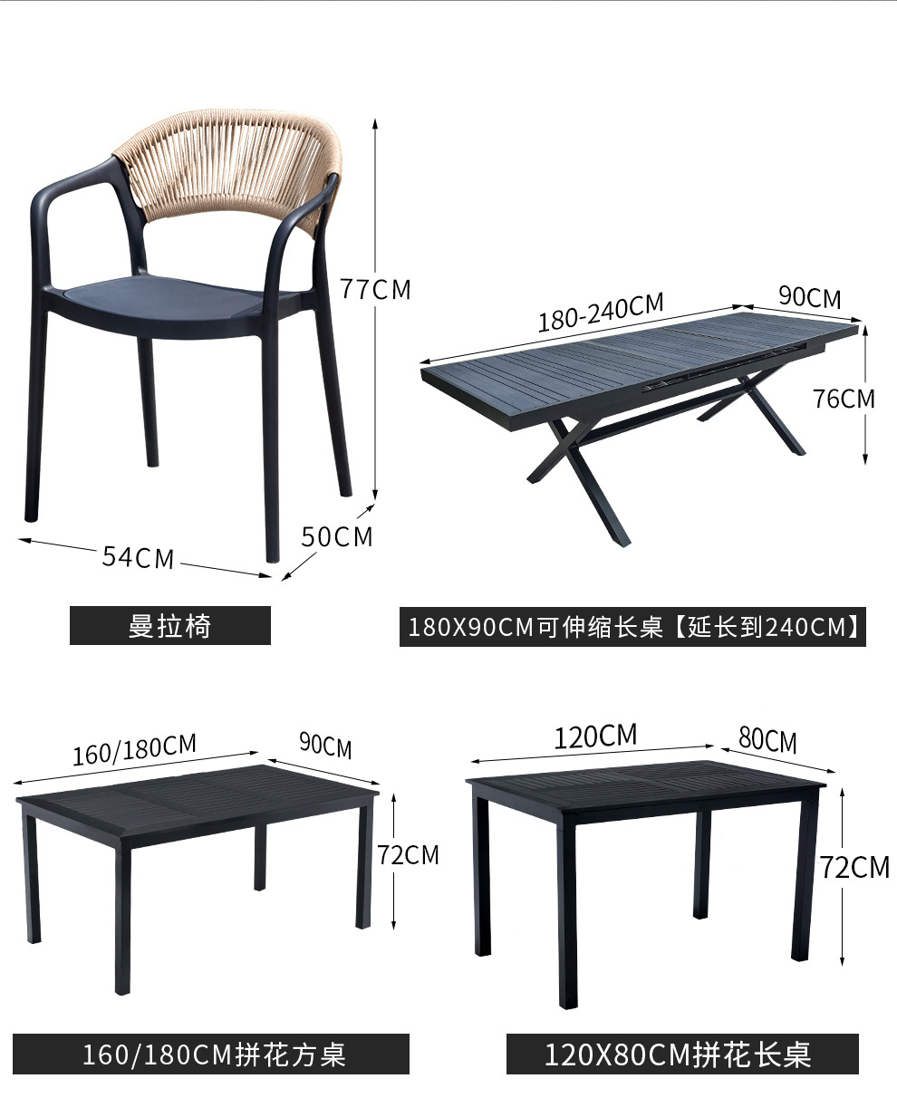 • 만라 의자 6개 + 180x90 접이식 롱테이블 [240cm까지 확장]