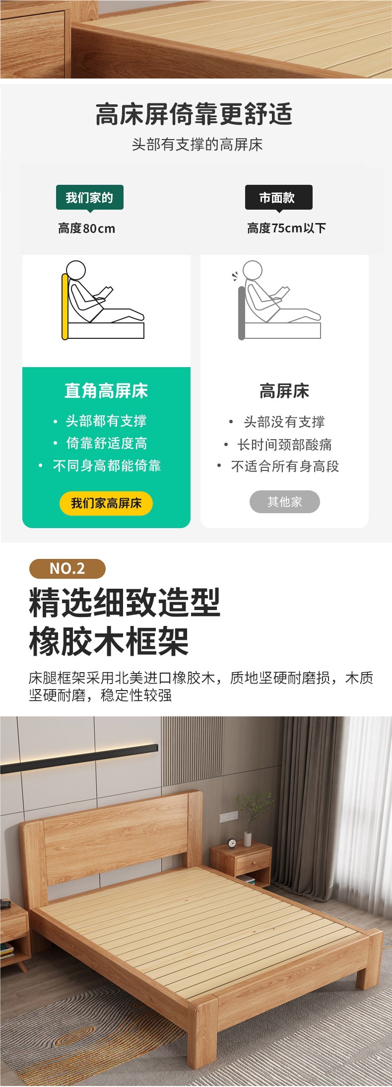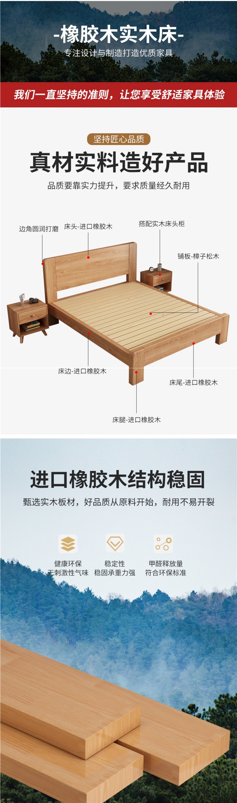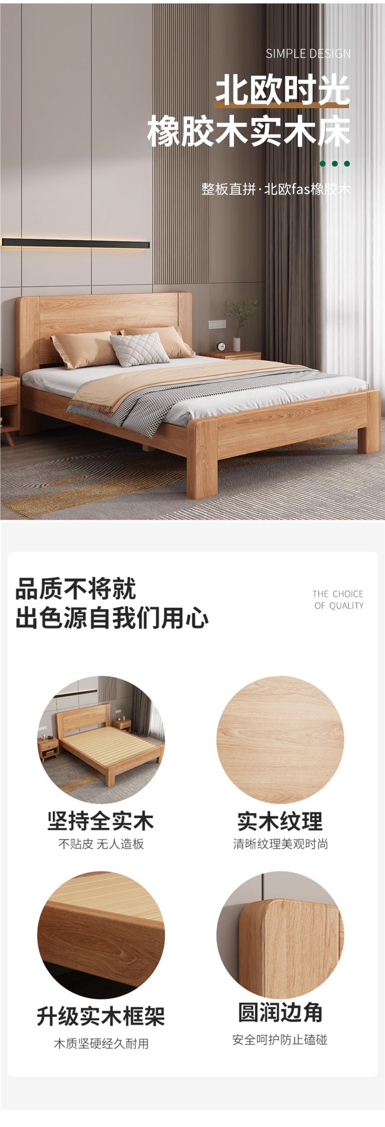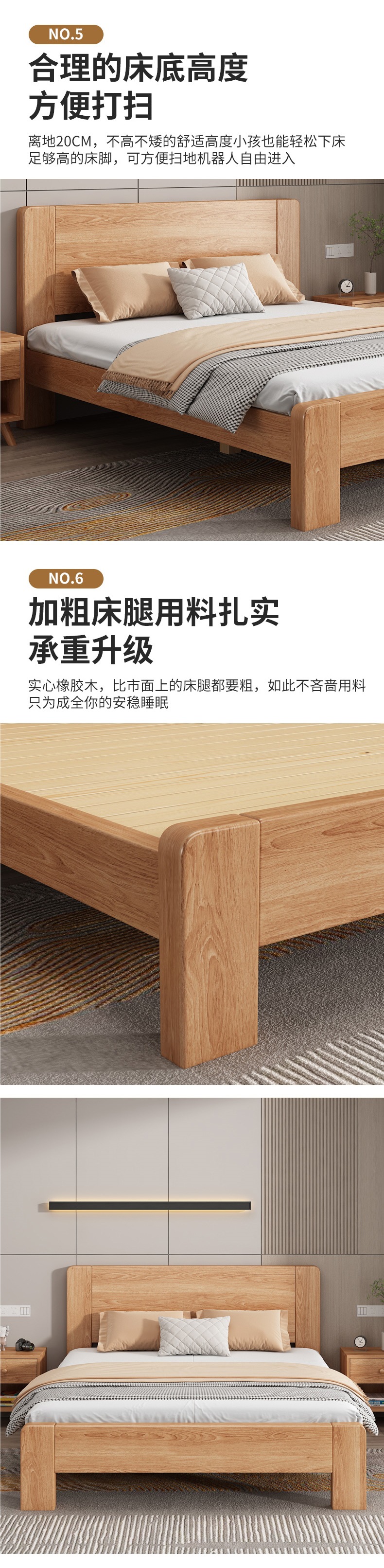 원목 침대 모던 심플 1.5m 더블 침대 1.8m 마스터 침실 고무나무 임대실 기숙사 1.2 싱글 도매