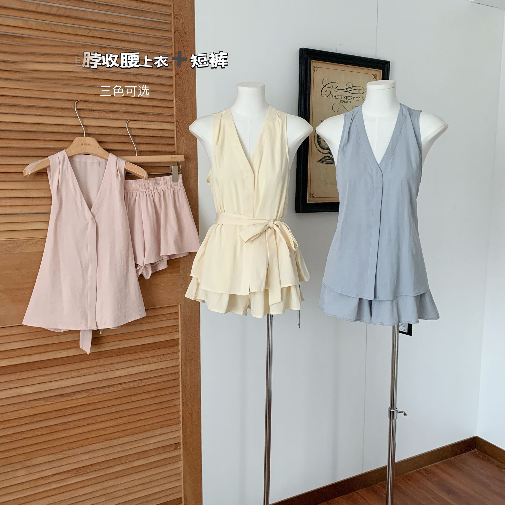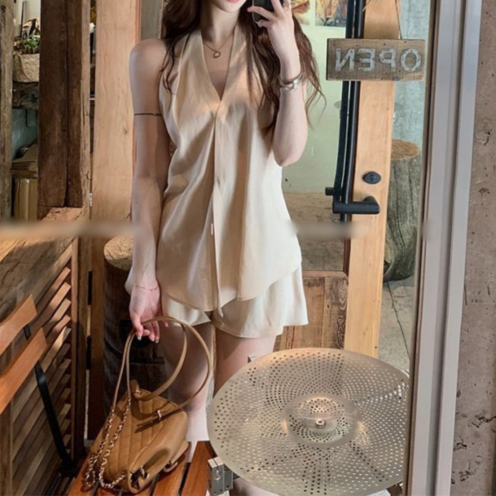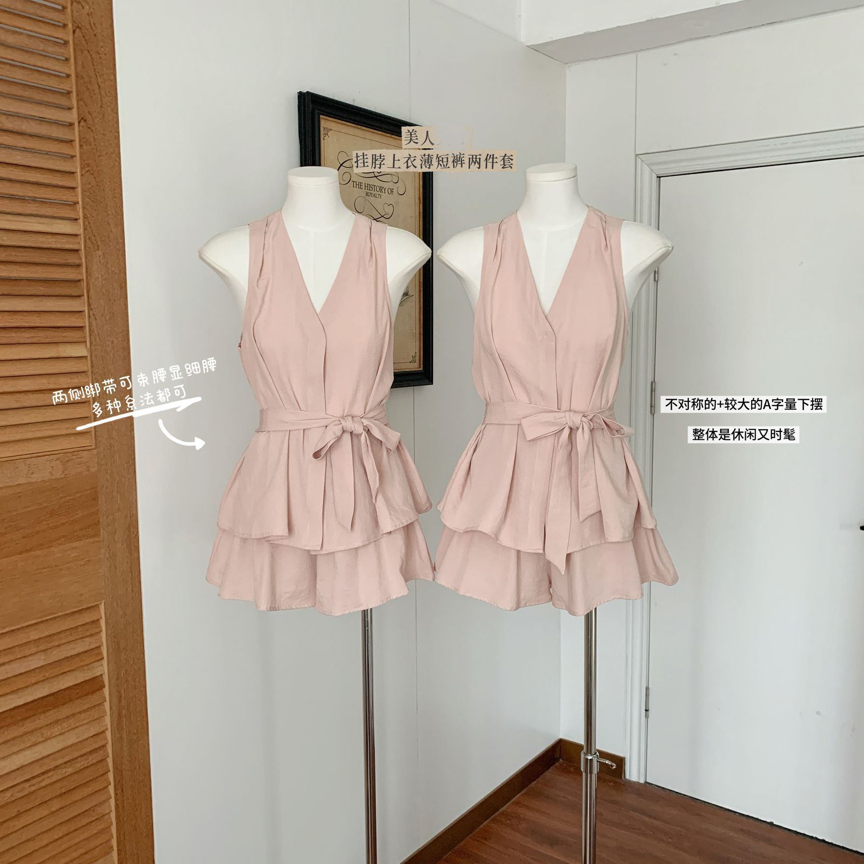 한국 신상 2026 여름 순수하고 섹시한 패션 미녀 홀터넥 탑 여름 세트 여성 얇은 반바지 투피스스토어 가기