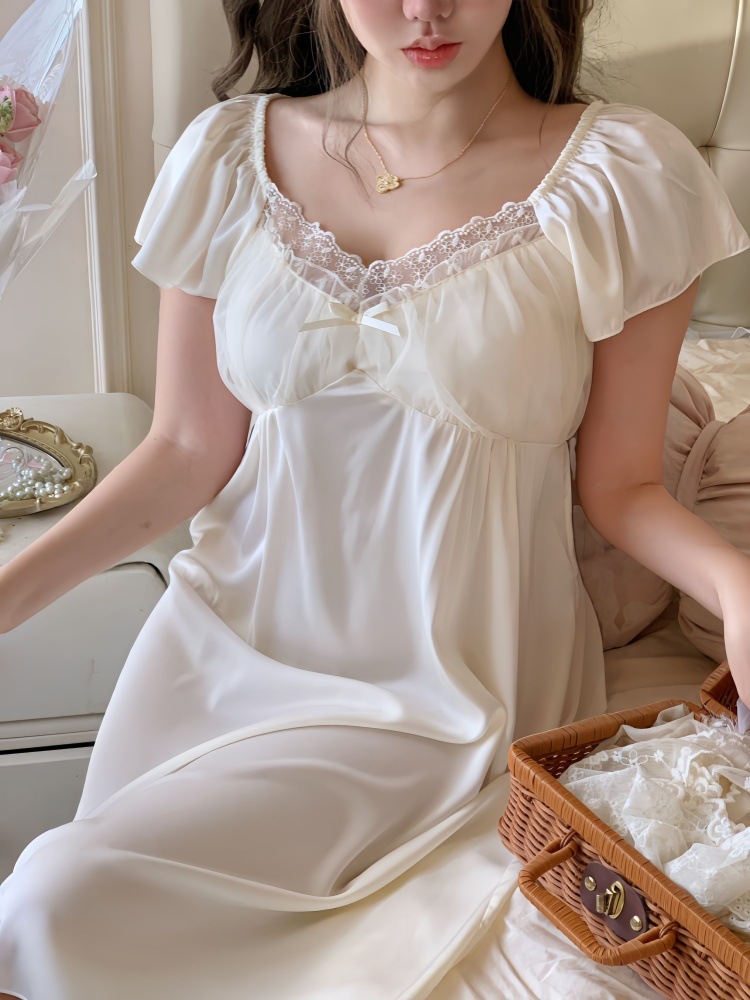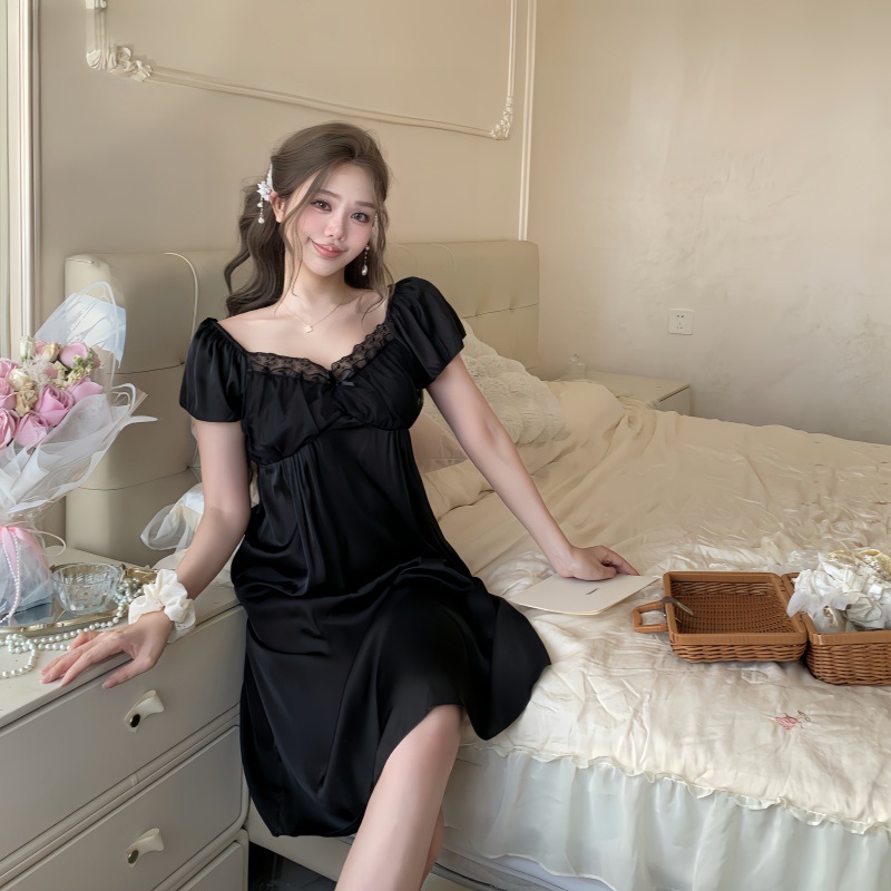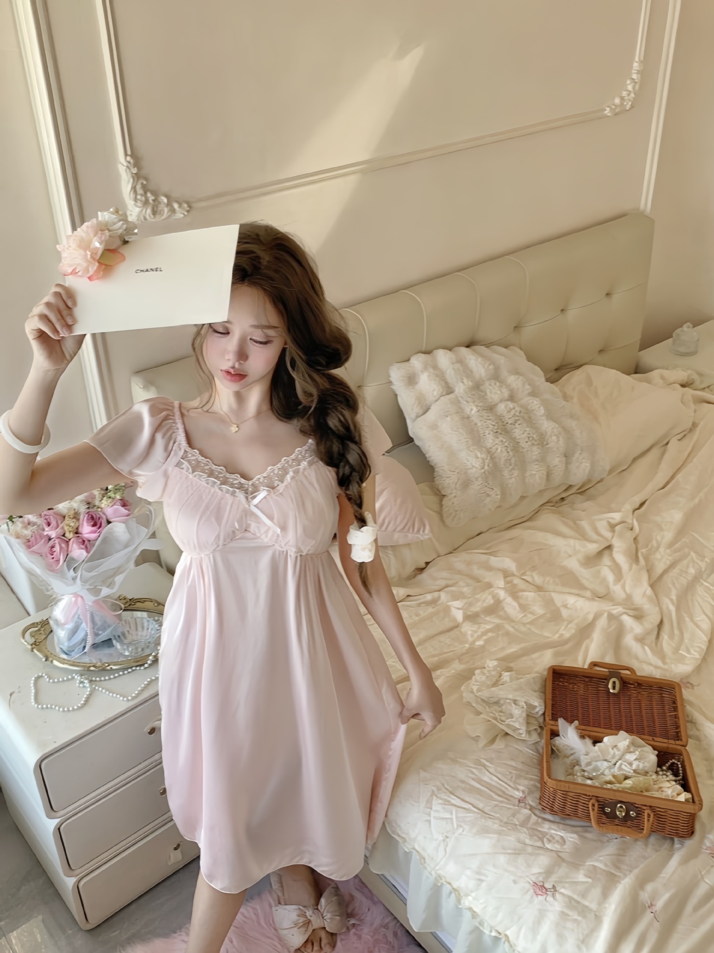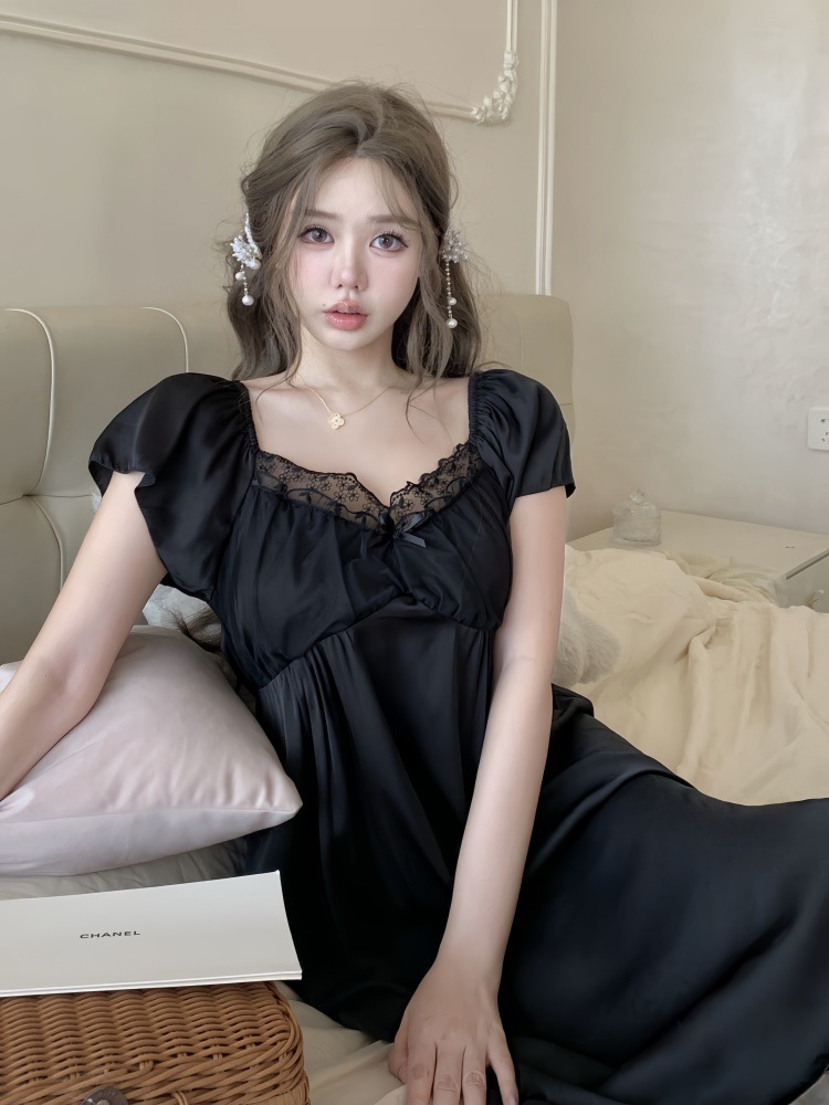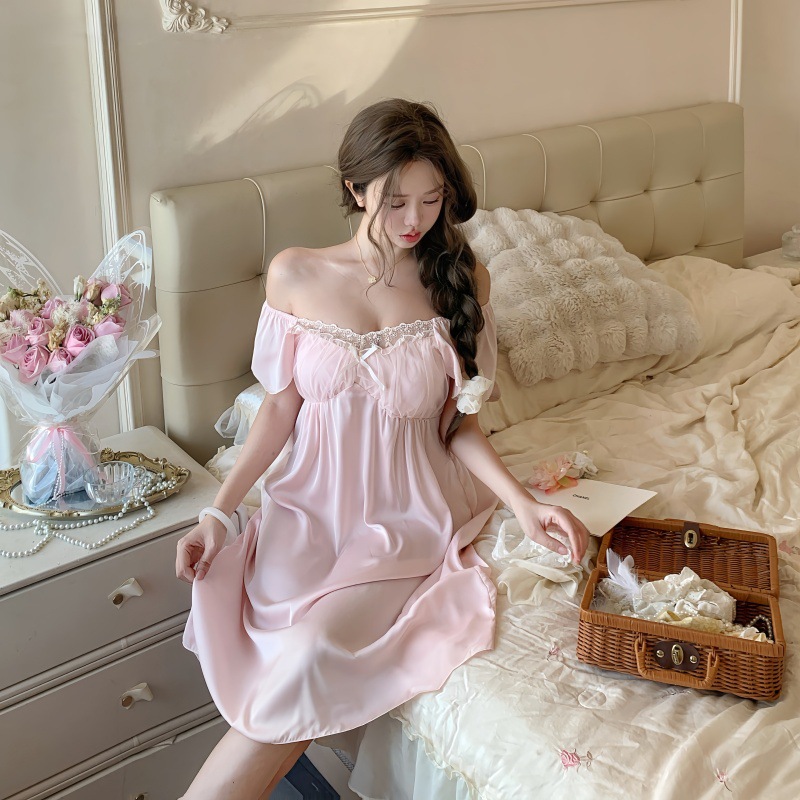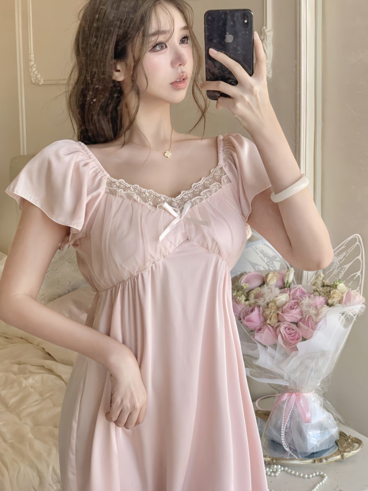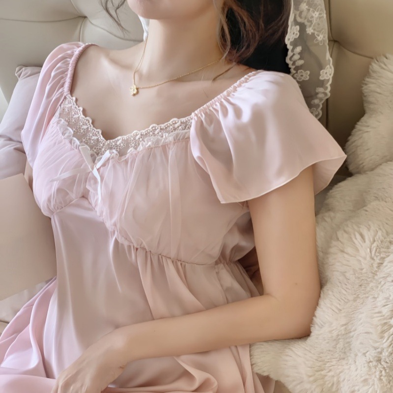 프렌치 스타일 잠옷 여름 긴 얼음 실크 여성 반팔 잠옷 요정 스타일 잠옷 가슴 패드가있는 달콤한 섹시한 홈웨어