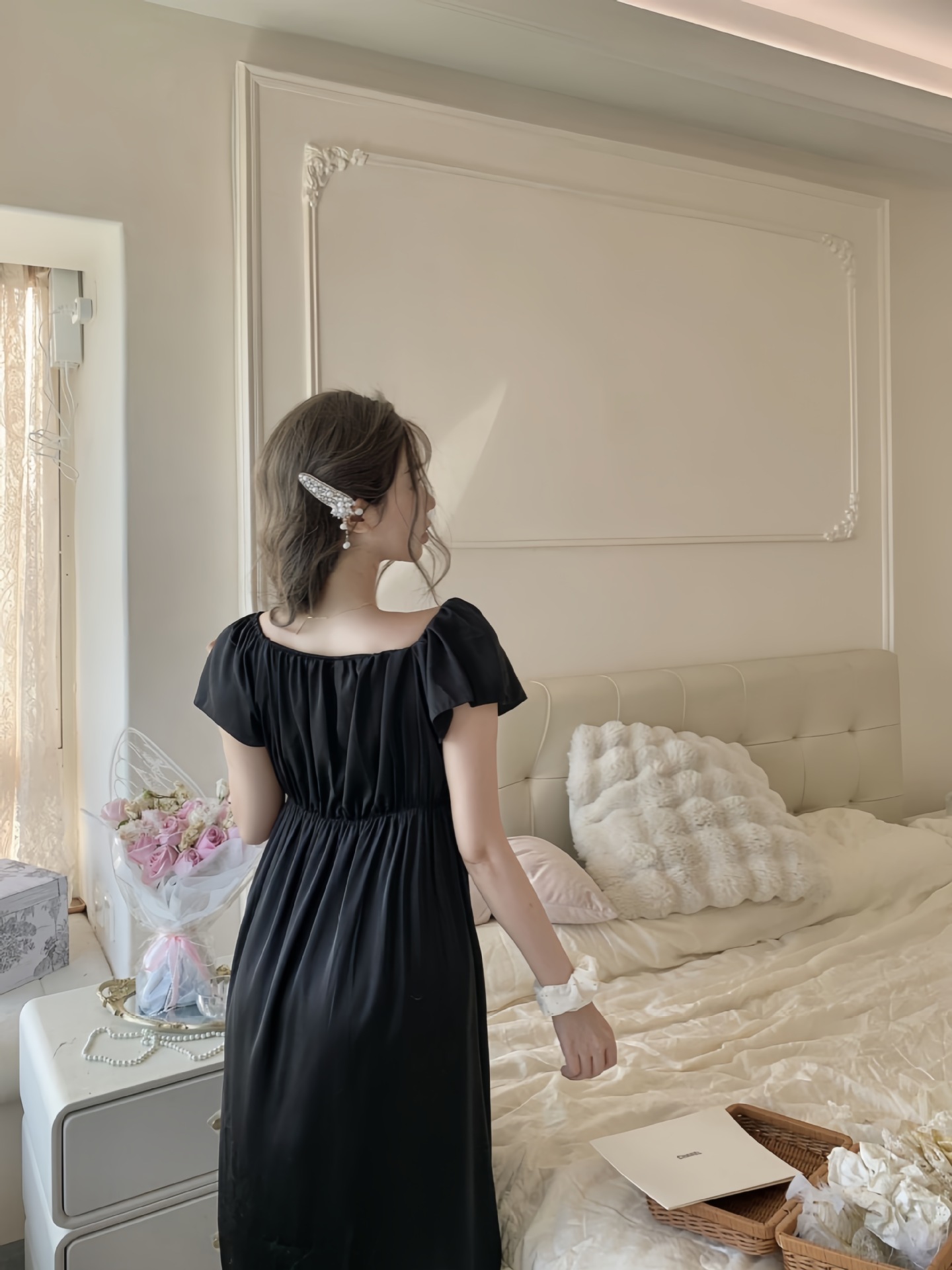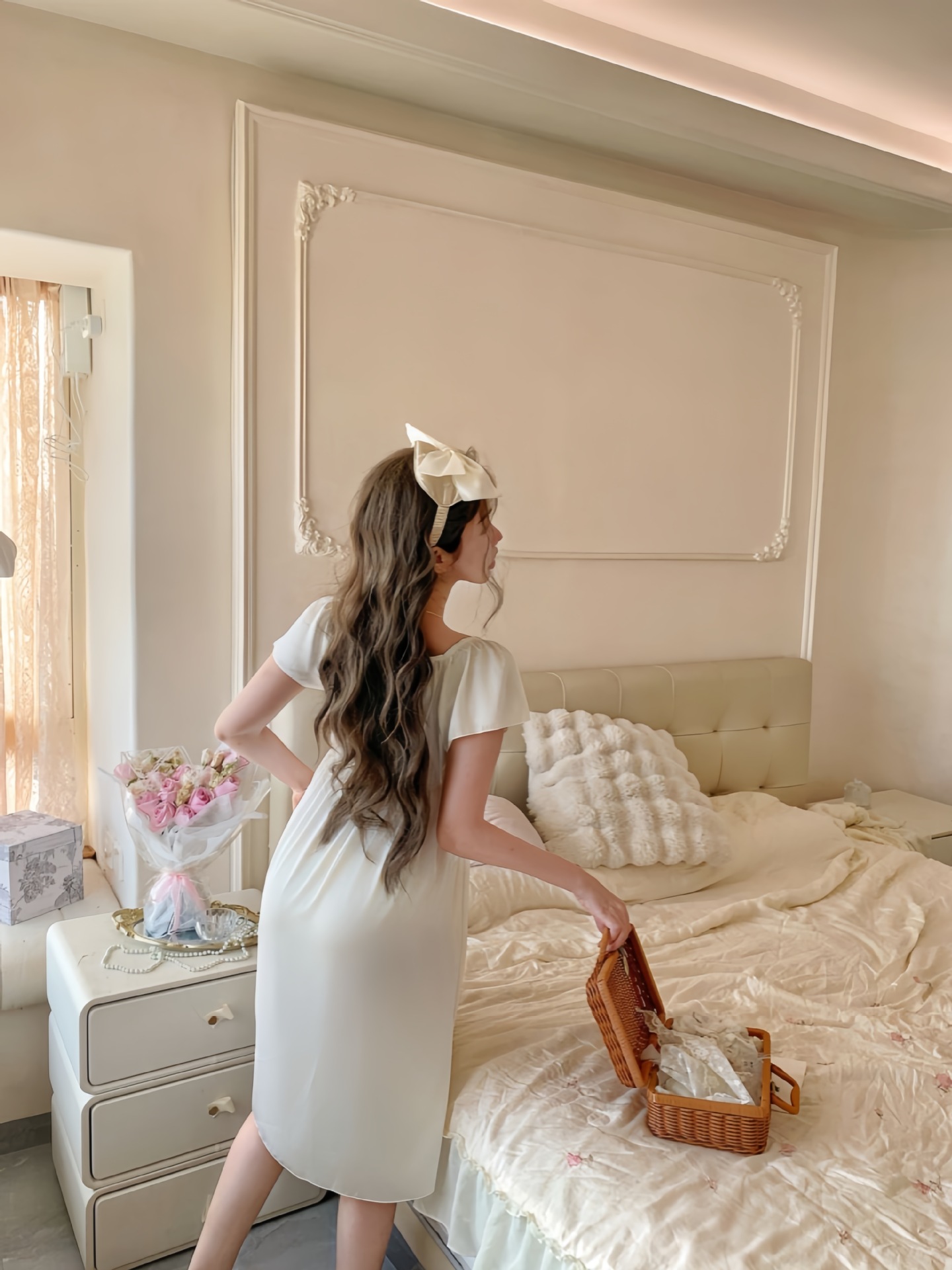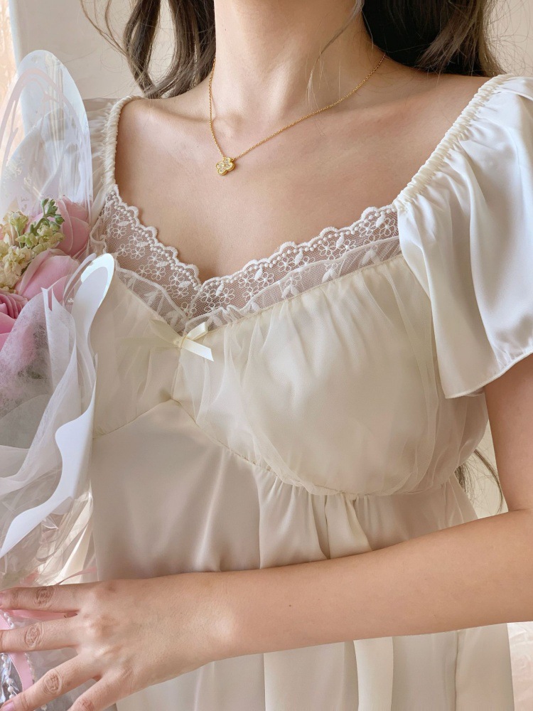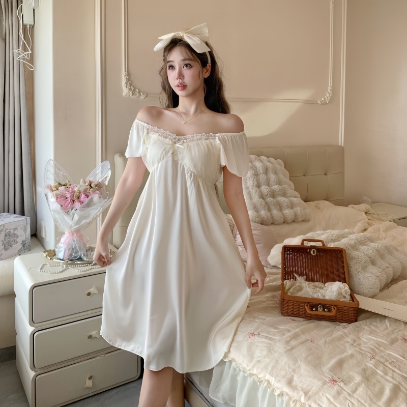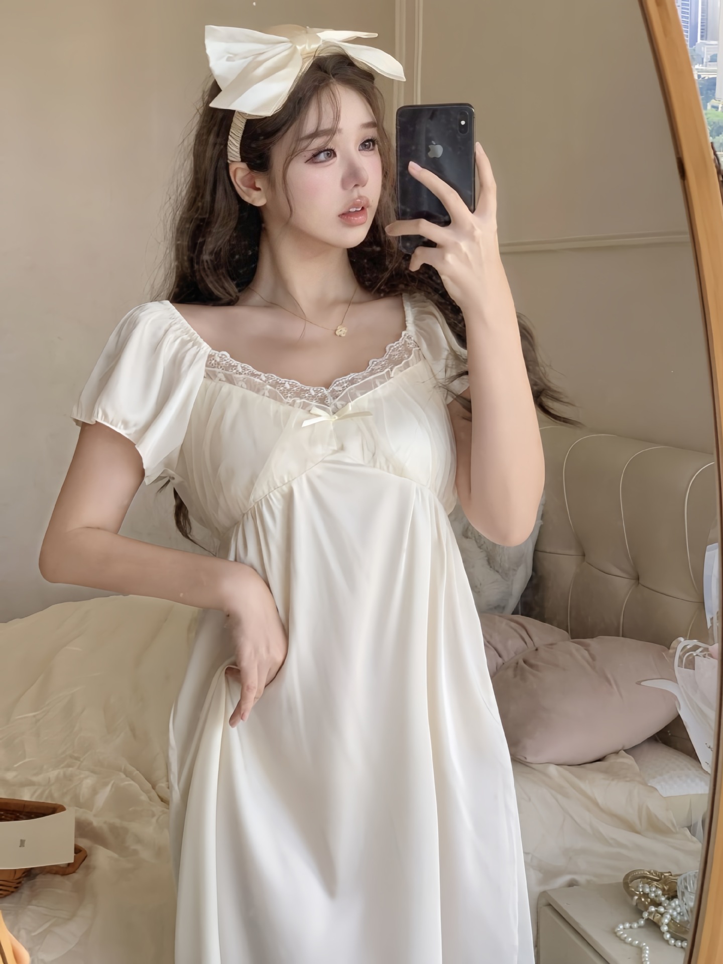 프렌치 스타일 잠옷 여름 긴 얼음 실크 여성 반팔 잠옷 요정 스타일 잠옷 가슴 패드가있는 달콤한 섹시한 홈웨어